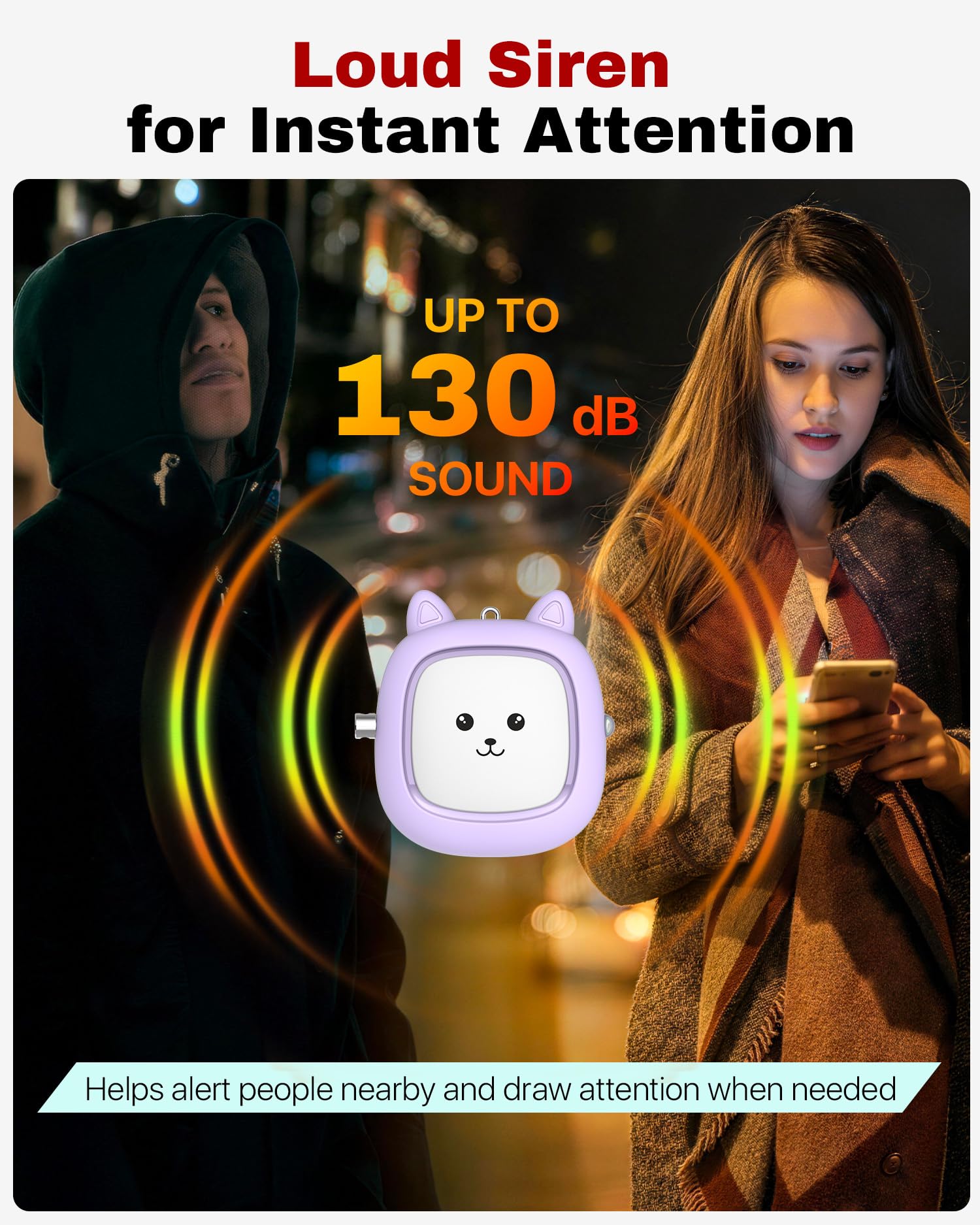 LOUD EMERGENCY ALERT: A loud siren designed to get attention in urgent situations. Helps make others nearby aware that assistance may be needed, offering added peace of mind when you feel uneasy or uncertain