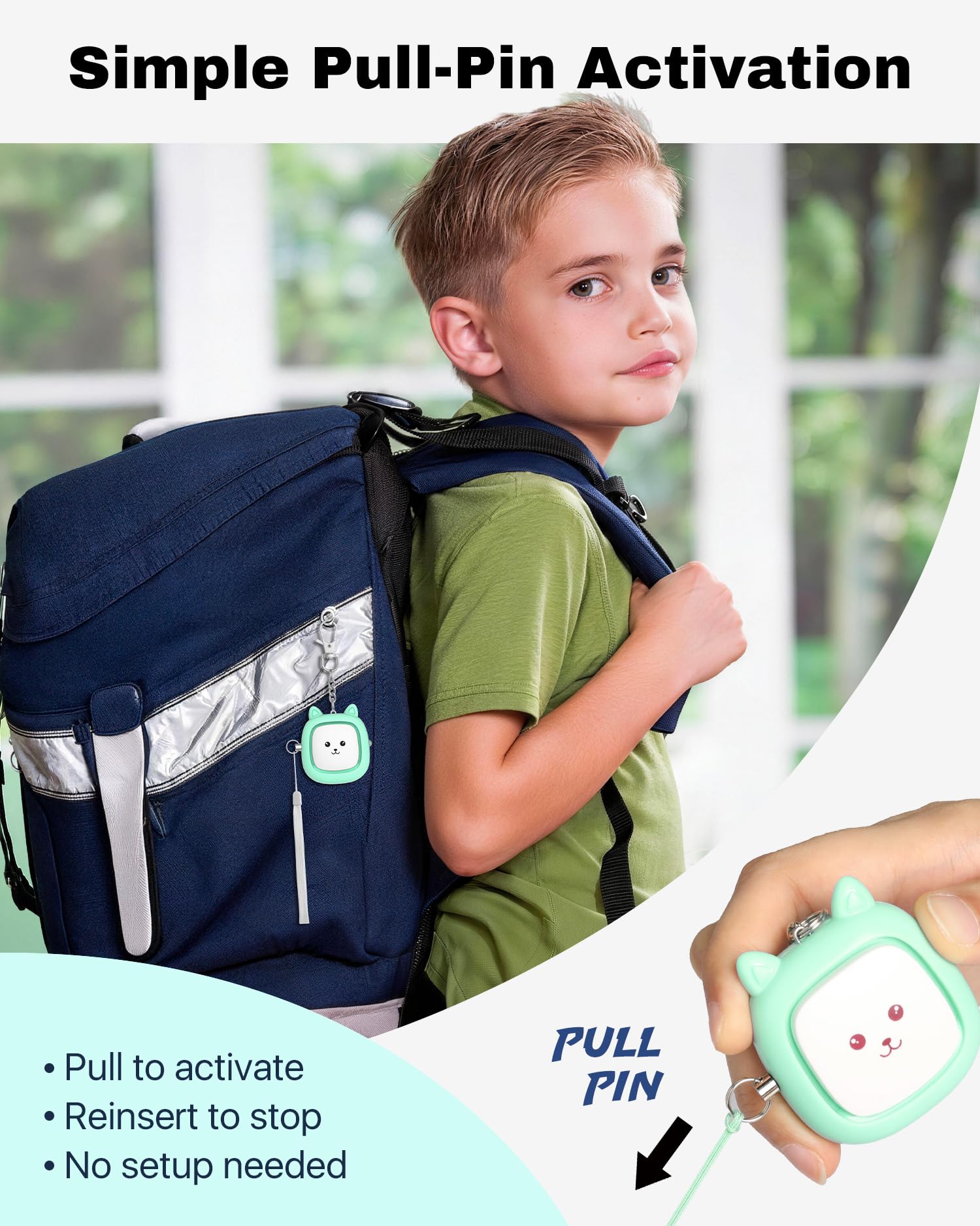 SIMPLE PULL-PIN ACTIVATION: Easy to use with no setup or training required. Simply pull the pin to sound the alarm and reinsert it to turn it off. Designed for everyday use by older children, teens, adults, and seniors who can operate it independently