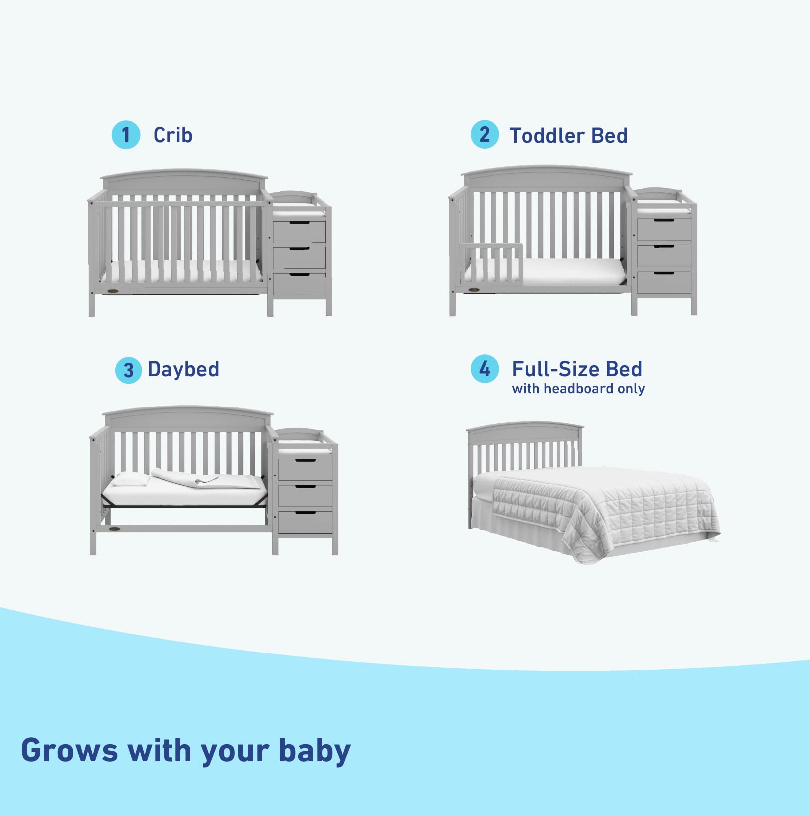 The Graco Benton 4-in-1 Convertible Crib and Changer is a complete sleep, changing, and storage solution for your nursery. Featuring an attached changing table with a water-resistant changing pad and safety strap, as well as 3 space-saving drawers and 3 open shelves for convenient storage of your nursery essentials. Designed for many years of use, the Graco Benton 4-in-1 Convertible Crib and Changer can easily convert from a crib to a toddler bed, daybed and full-size bed with headboard, and features a three-position adjustable mattress support base (optional Graco Toddler Guardrail, Graco Full-Size Conversion Kit, and mattress sold separately). Like all Graco cribs, the Benton is expert tested to meet or exceed all applicable safety standards to ensure the safest sleeping environment for your child. Size: Length (56.7 inches); Width (29.8 inches); Height (42 inches); Weight (41 pounds); Maximum child height for crib stage (35 inches); Maximum recommended weight limit for toddler bed and daybed stage (50 pounds). Graco cribs are exclusively manufactured by Storkcraft. For over 70 years, Storkcraft has been manufacturing quality furniture for infants, toddlers, kids, and teens.