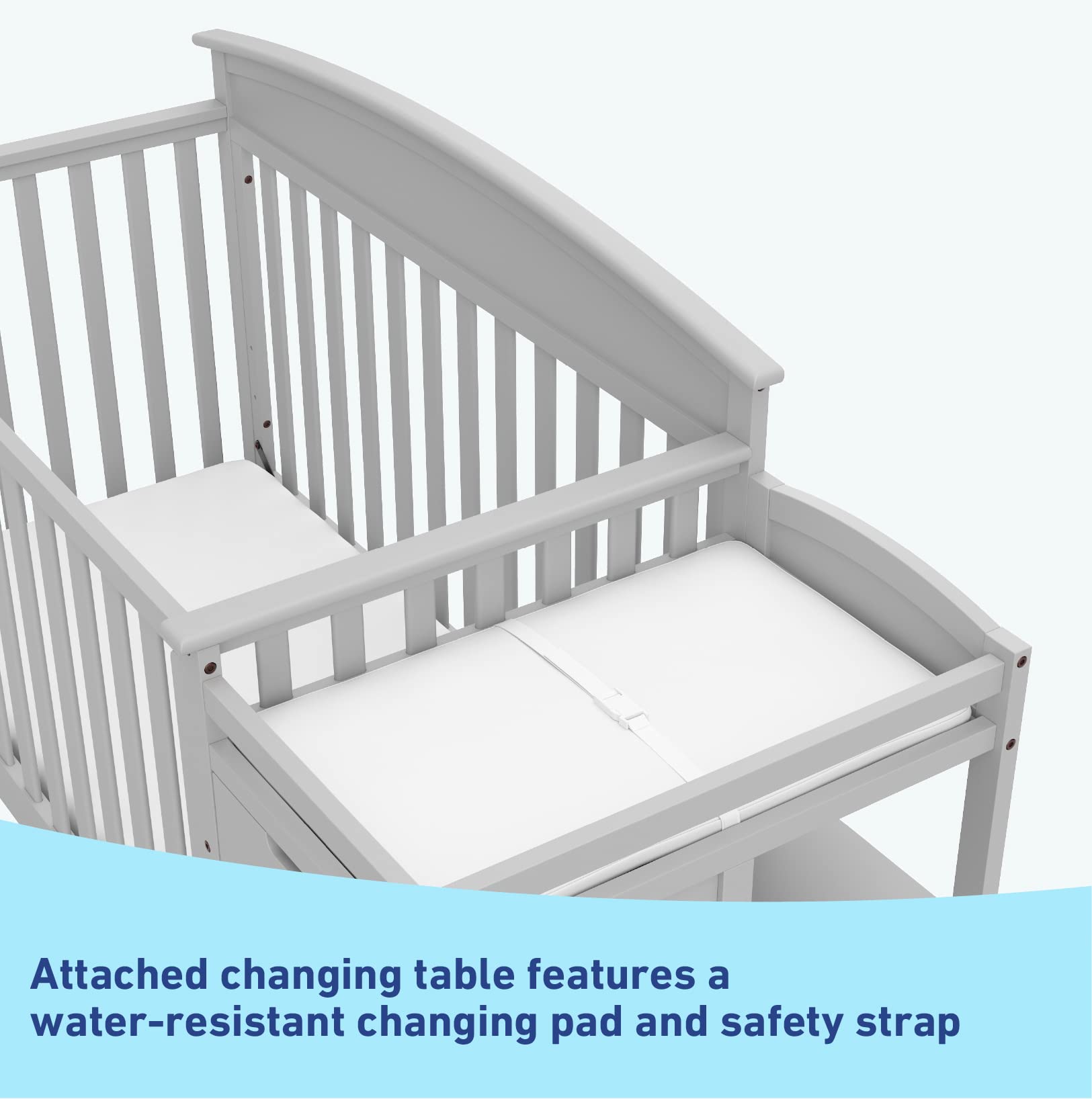 ATTACHED CHANGING TABLE WITH STORAGE: Baby crib with universal design to match easily with any nursery style; Attached changing table includes 3 enclosed storage drawers, 2 open shelves, and water-resistant changing pad with safety strap