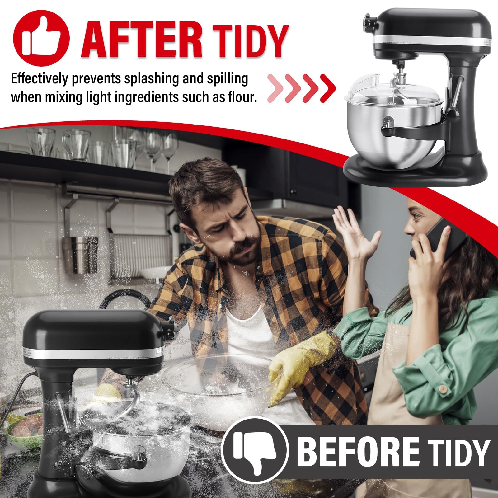 Splash and Spill Prevention: Mixer Stainless Steel Bowl cover fully encapsulated design prevents splashes and spills when mixing lightweight ingredients such as flour, minimizing countertop messes.