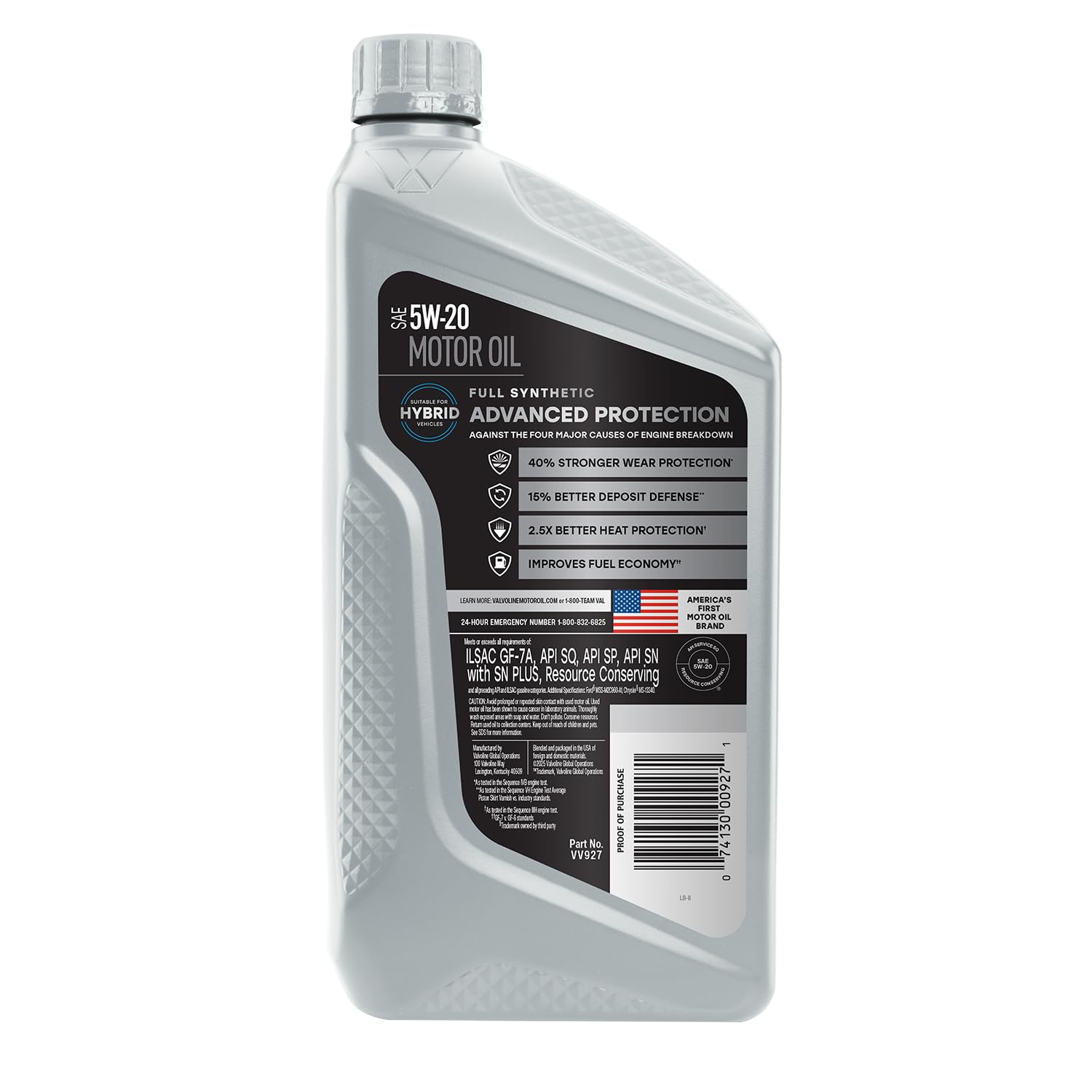 Proven to maximize engine life, Valvoline Advanced Protection Full Synthetic 5W-20 Motor Oil delivers outstanding performance and durability you can count on. Formulated with high-quality synthetic base oils, it provides 40% stronger wear protection, 15% better deposit defense, and up to 2.5X better heat protection than industry standards. Advanced additive boosters minimize the effects of excessive heat and defend against damaging sludge to improve engine cleanliness. Its full synthetic formula flows easily during low temperatures to reduce wear at cold starts — when most engine damage occurs — and enhances fuel economy for more efficient performance. Valvoline Advanced Protection full synthetic formula not only improves fuel economy but also safeguards against the four major causes of engine breakdown: wear, friction, heat and deposits. Suitable for hybrid cars as well as most Toyota, Honda, Nissan Chevy, Ford, Dodge and more. For confidence and protection you can trust in all kinds of driving conditions, switch to Advanced Protection Full Synthetic motor oil. From Valvoline, the Original Motor Oil brand.
