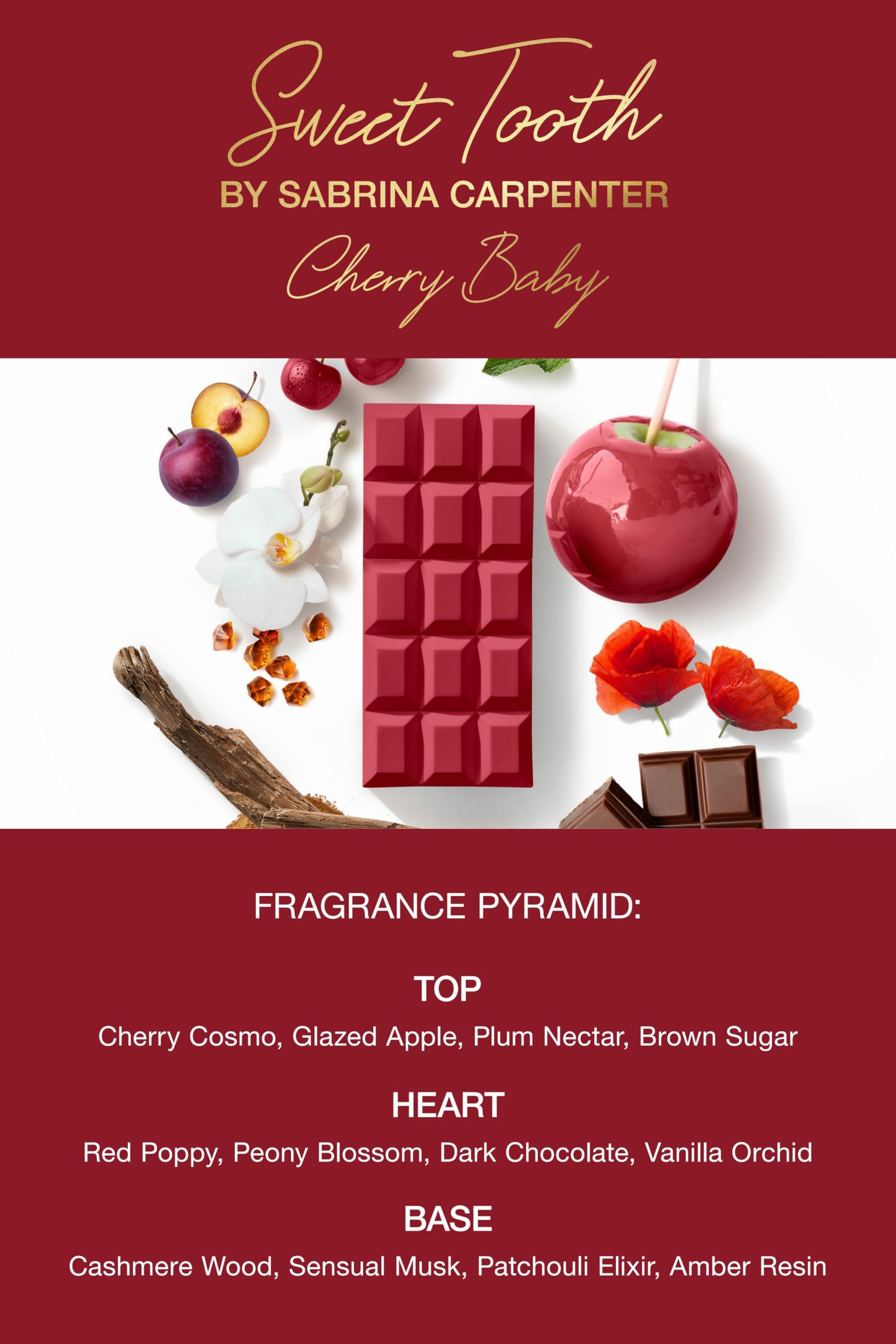 Cherry Baby Scent Notes: Features an indulgent aroma of cherries and chocolate that envelops you, swirling in a flirty mist of red poppy and peony
