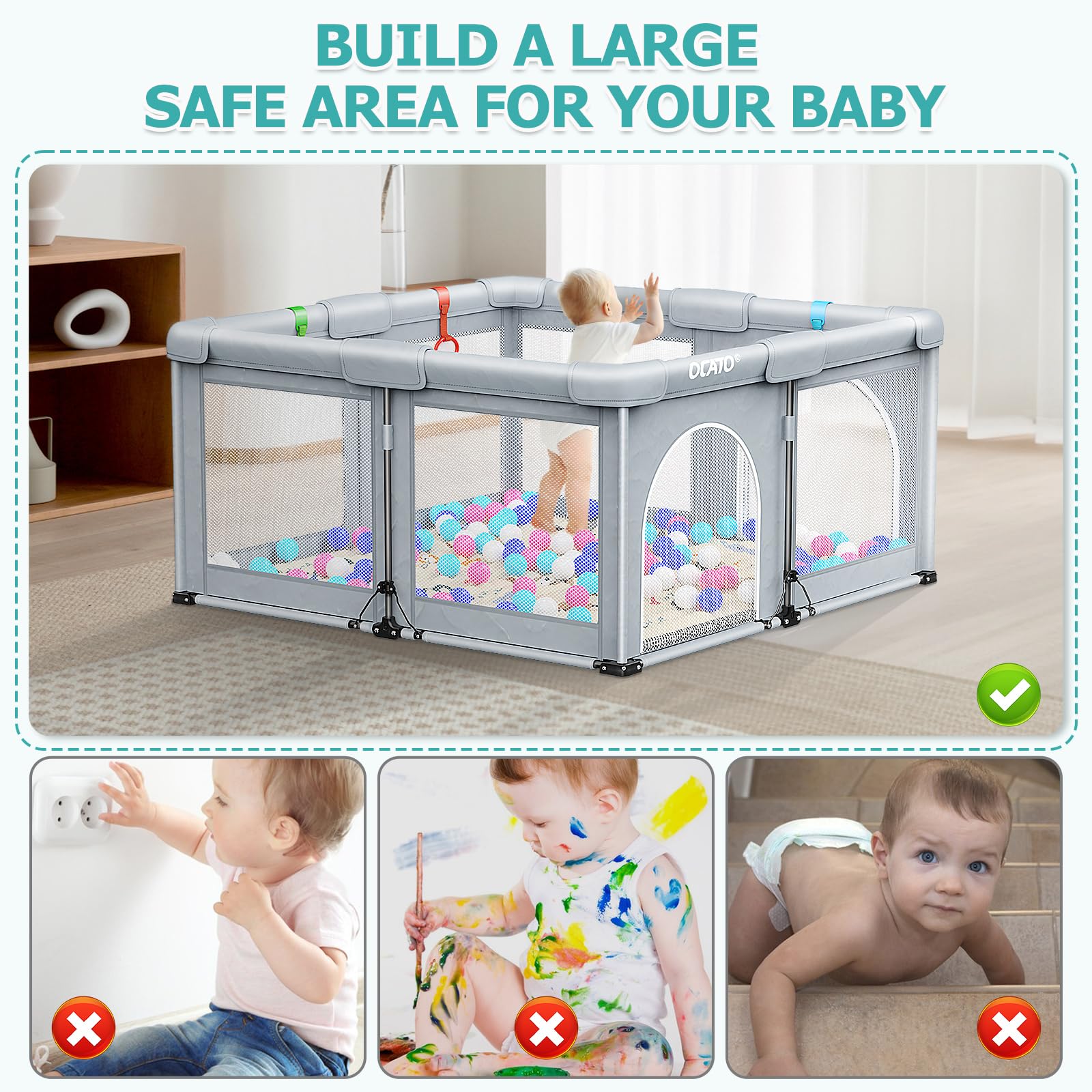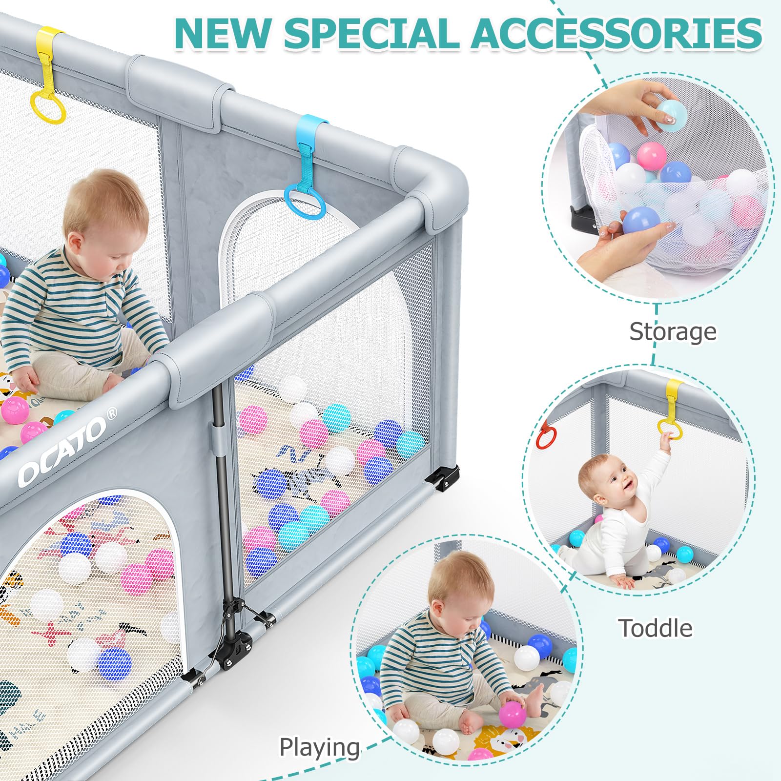 NEW SPECIAL ACCESSORIES: New upgraded baby gate playpen. Playpen for toddlers added ocean ball x50, hanging ring x4, storage bag x1, storage strap x2, playmat x1. When the mom is busy, the baby can practice standing and walking through the hang ring, perfect size and height for babys to grip. On the side of the fence, there is also a mesh door for storing the ocean balls. Bright ball catches baby‘s attention, baby boy gifts and baby shower gifts, great entertaining extra large playpen for toddlers