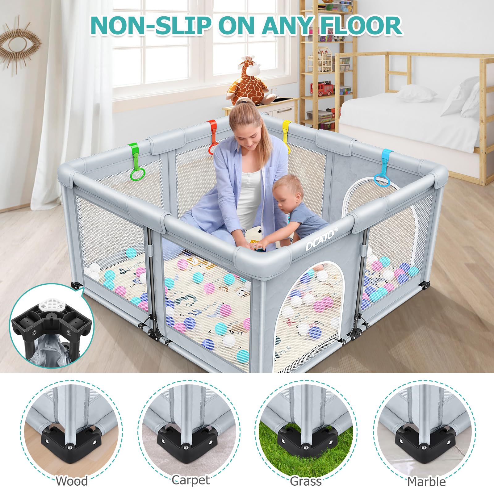 NON-SLIP ON ANY FLOOR: Non-slip base provides further stability. Suitable for any floor, such as wood, carpet, grass, marble, etc. Baby play yards maintain stability when baby is excited. For indoor and outdoor use, including home, park, grassland, beach. Spacious outdoor baby playpen that can accommodate multiple toddlers and parents. A quick pop up and lock system, four sizes complete, great toddler gifts play pen for toddlers 1-3 years, amazing chose for new parent