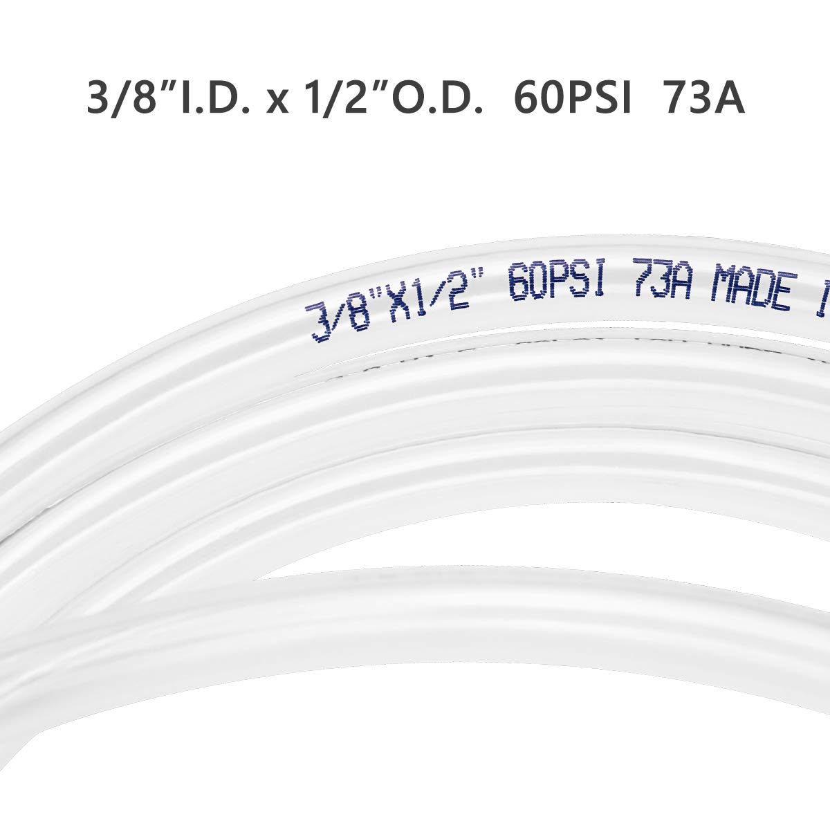 Tubing Details - PVC vinyl tubing, ID: 3/8", OD: 1/2", 50 feet, Wall thickness: 1.6mm; Hardness: 73A (firm); Temperature Range : 23°F to 149°F (-5°C to 65°C); Working Pressure: 60PSI.