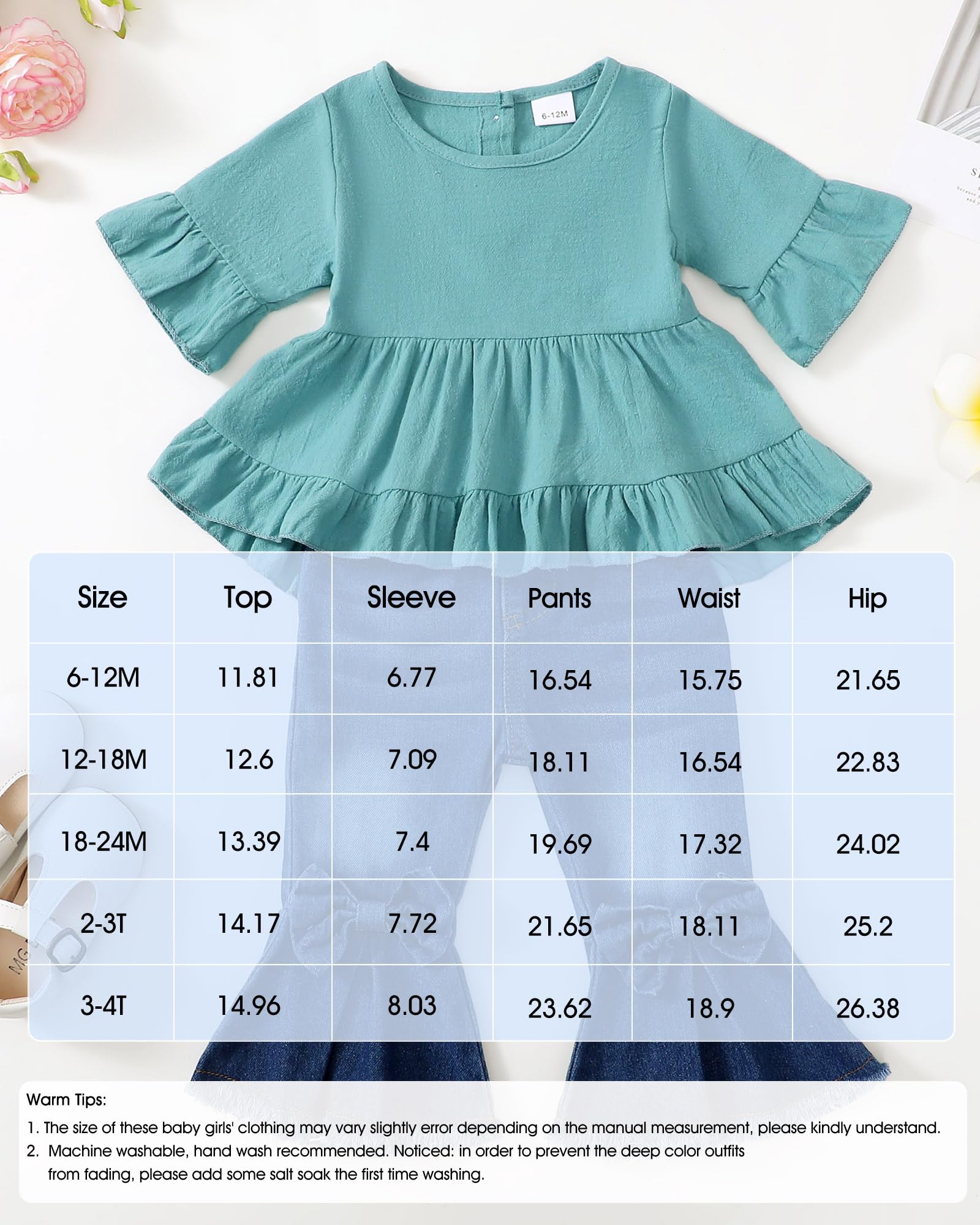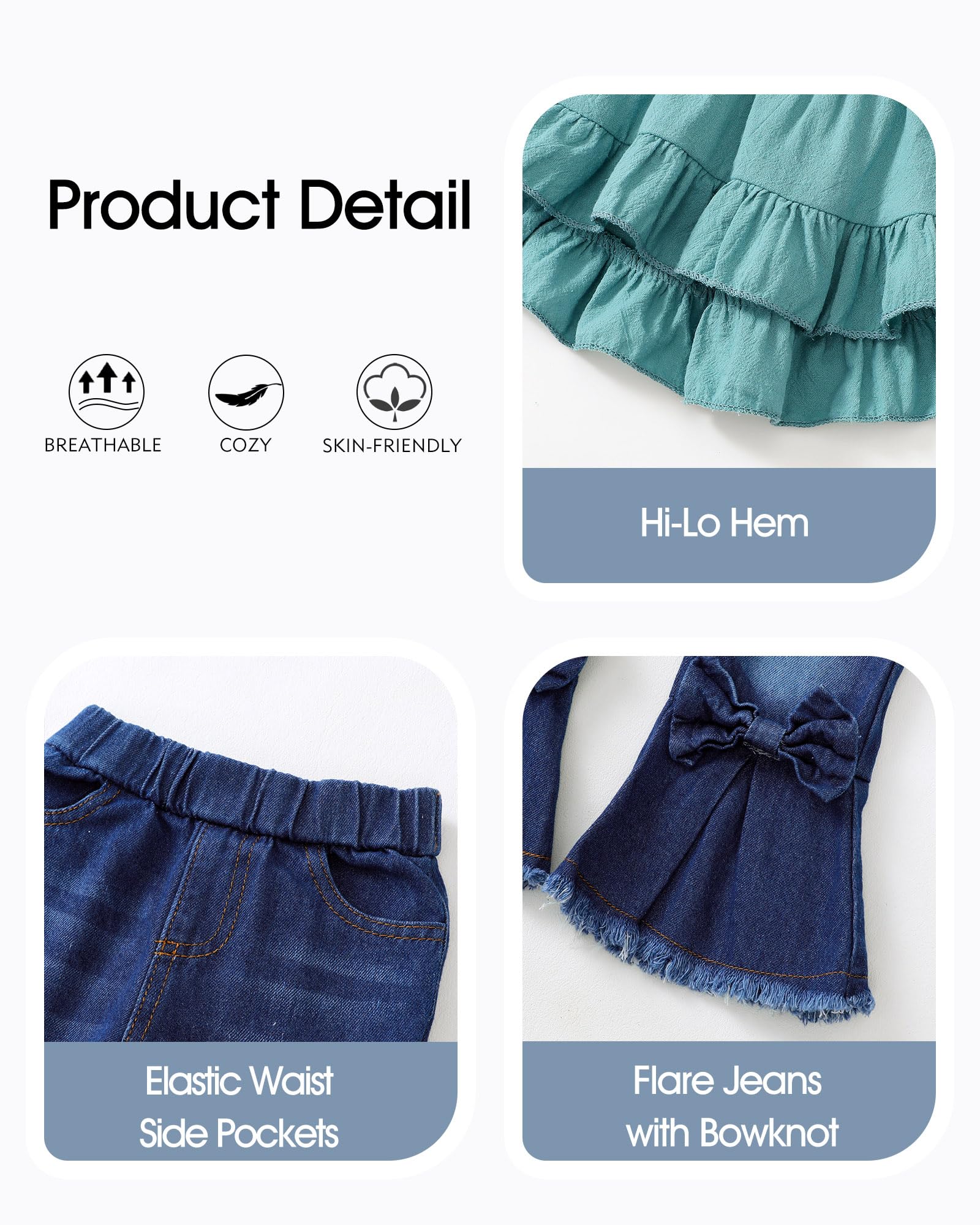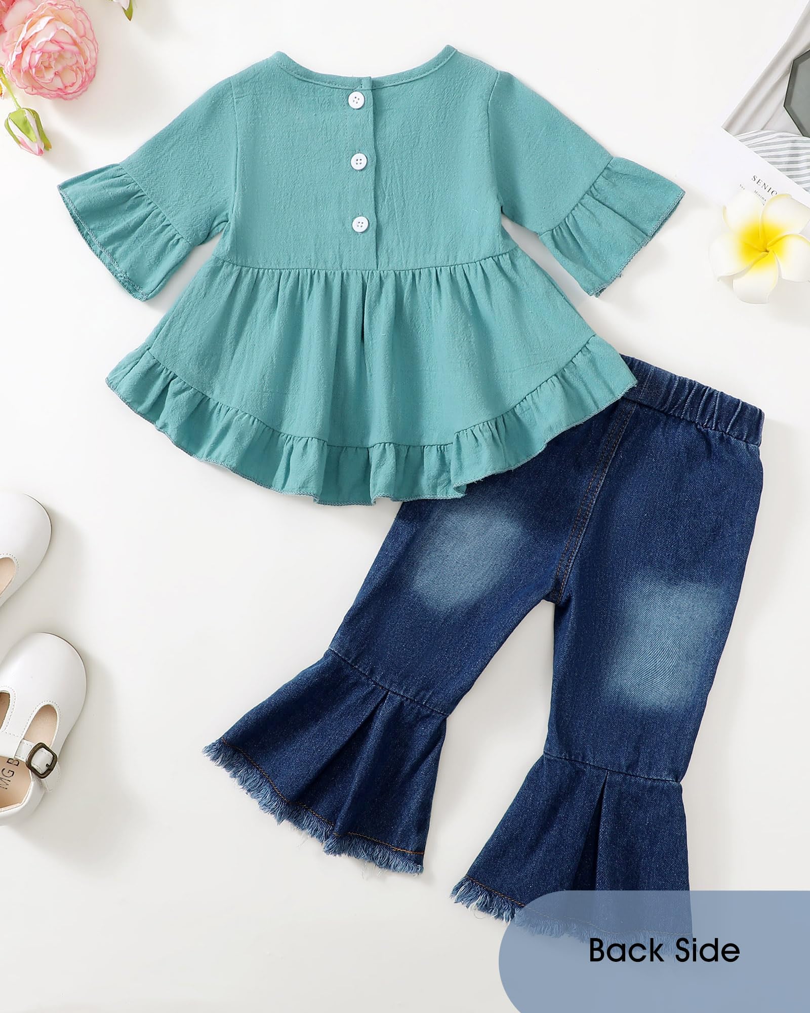 Cute and Trendy: This two pieces girls outfit includes a ruffle top with a hi-lo hem design,buttons closure and 1/2 ruffle sleeves we love,and pull on denim jeans with elastic waist and bell bottom. A top choice for little girl summer fall clothes,that's sure to get compliments.