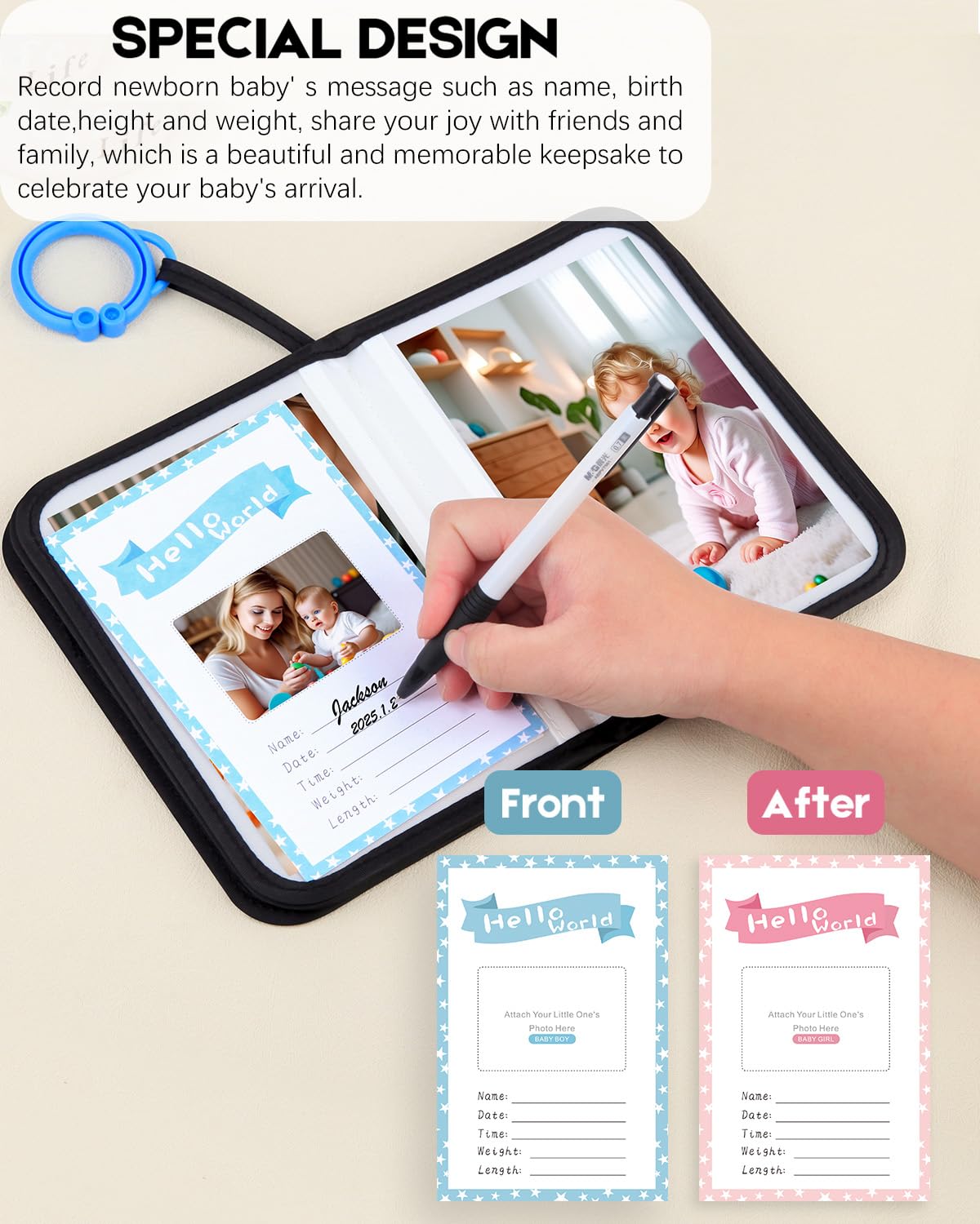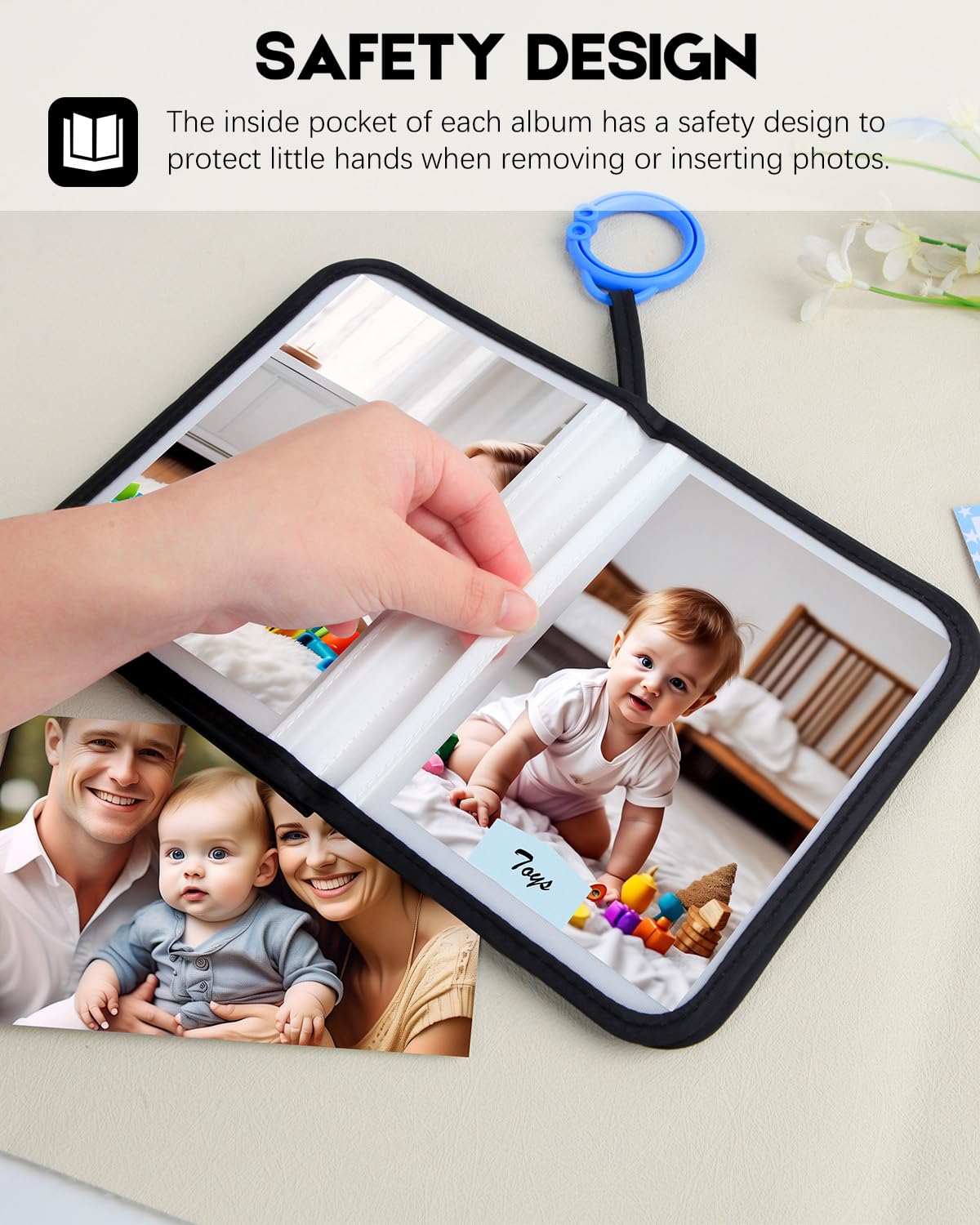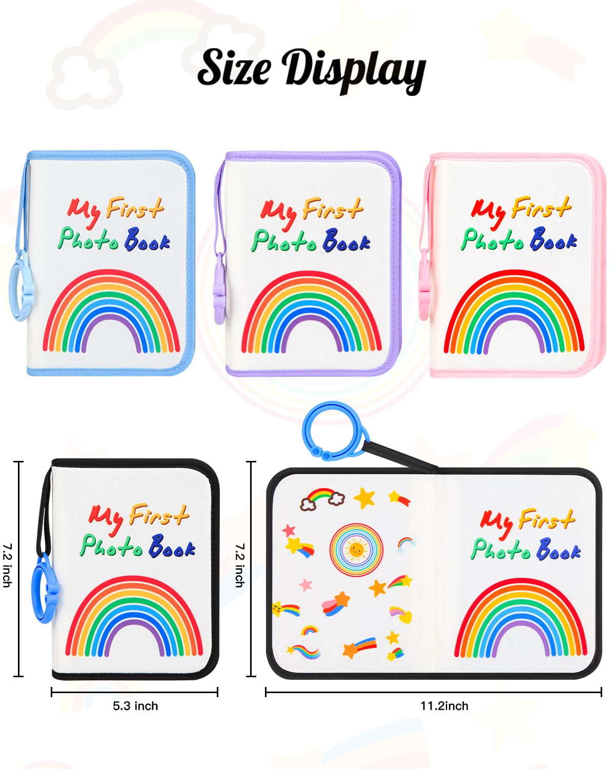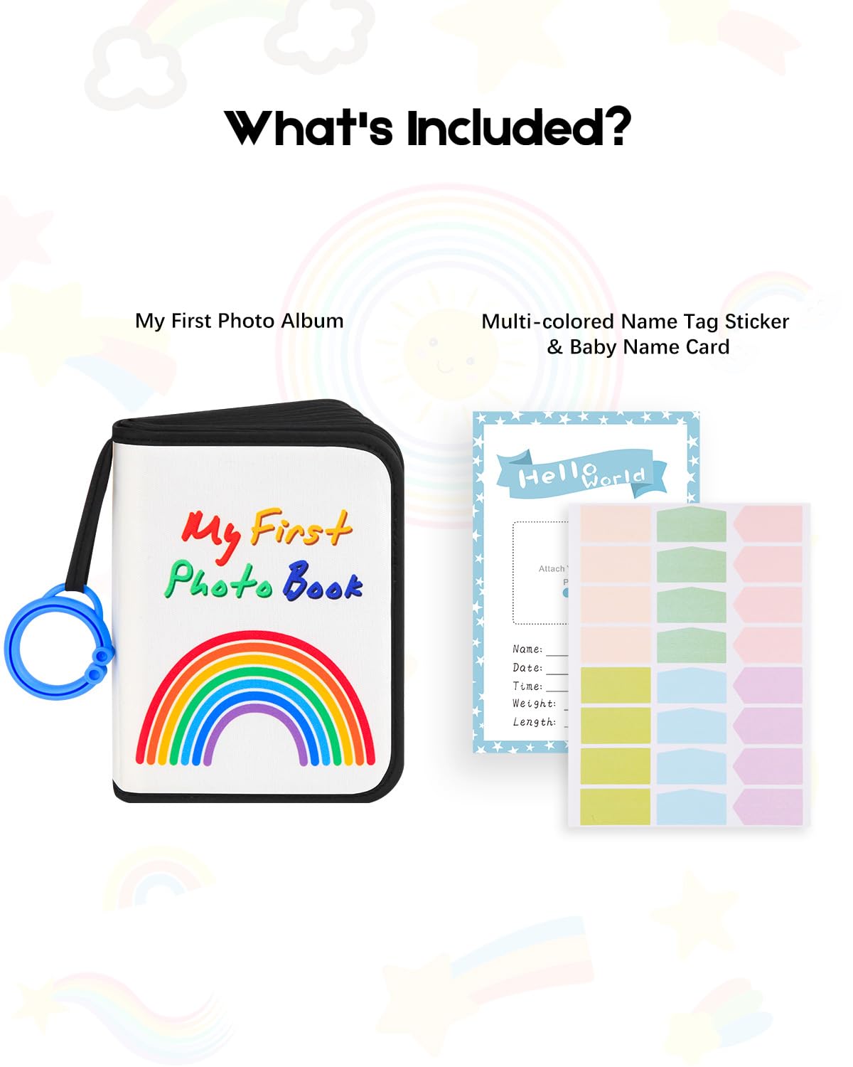 PERFECT SIZE: This small baby photo book is perfect for baby's tiny hands. Holds up to 21 4x6 inch photos. Clear photo pockets, can protect pictures from baby's drool, pictures won't stick to pockets, easy to insert and remove. The star hook can be easily attached to the cot, pram, etc. Child safety mirror on one side in the middle of the last page of the album.