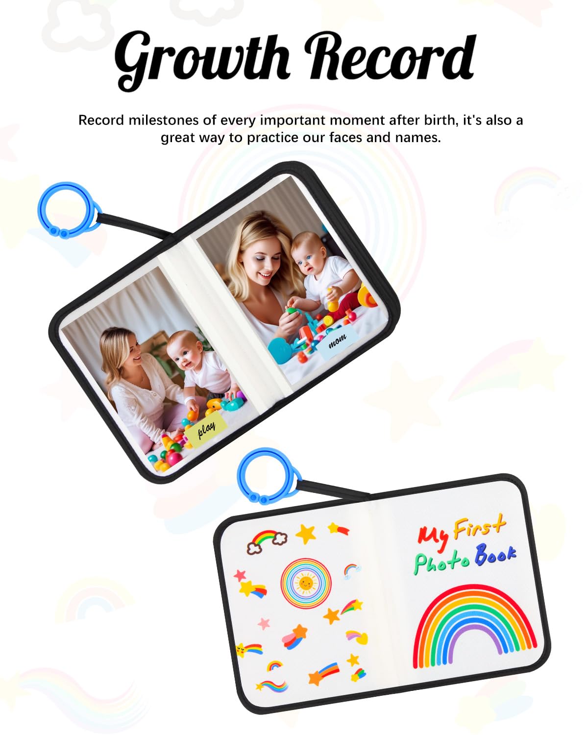 page of the album. NAME TAG STICKERS: Cultivate children's imaginations and stimulate their curiosity, using family photos with name tags helps promote early brain development, social skills, literacy and communication skills. The familiar faces in this baby photo book help to stimulate the brain. Photographs and baby-safe mirrors stimulate your child's imagination and curiosity. The soft photo book is a great way to teach your baby about family members.