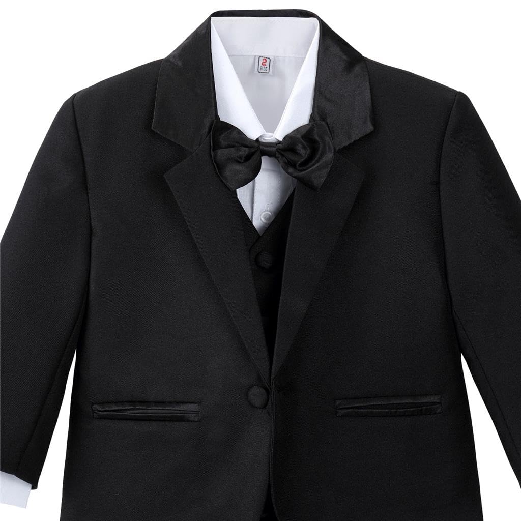 [5 Pieces Little Boys Tuxedo Suit Set] This smart 5-piece gentleman suit set formal outfit includes blazer jacket, white dress shirt, adjustable bow tie, vest and pants. Made of luxurious polyester and cotton fabric. Breathable and comfortable.[Colors] Black, White, Ivory, Light Gray, Silver Gray, Royal Blue, Khaki Beige, Dark Navy Blue, Charcoal Gray, Burgundy Red, Iron Gray. (NOTE: Product color may slightly vary due to the lighting of photo shooting.)