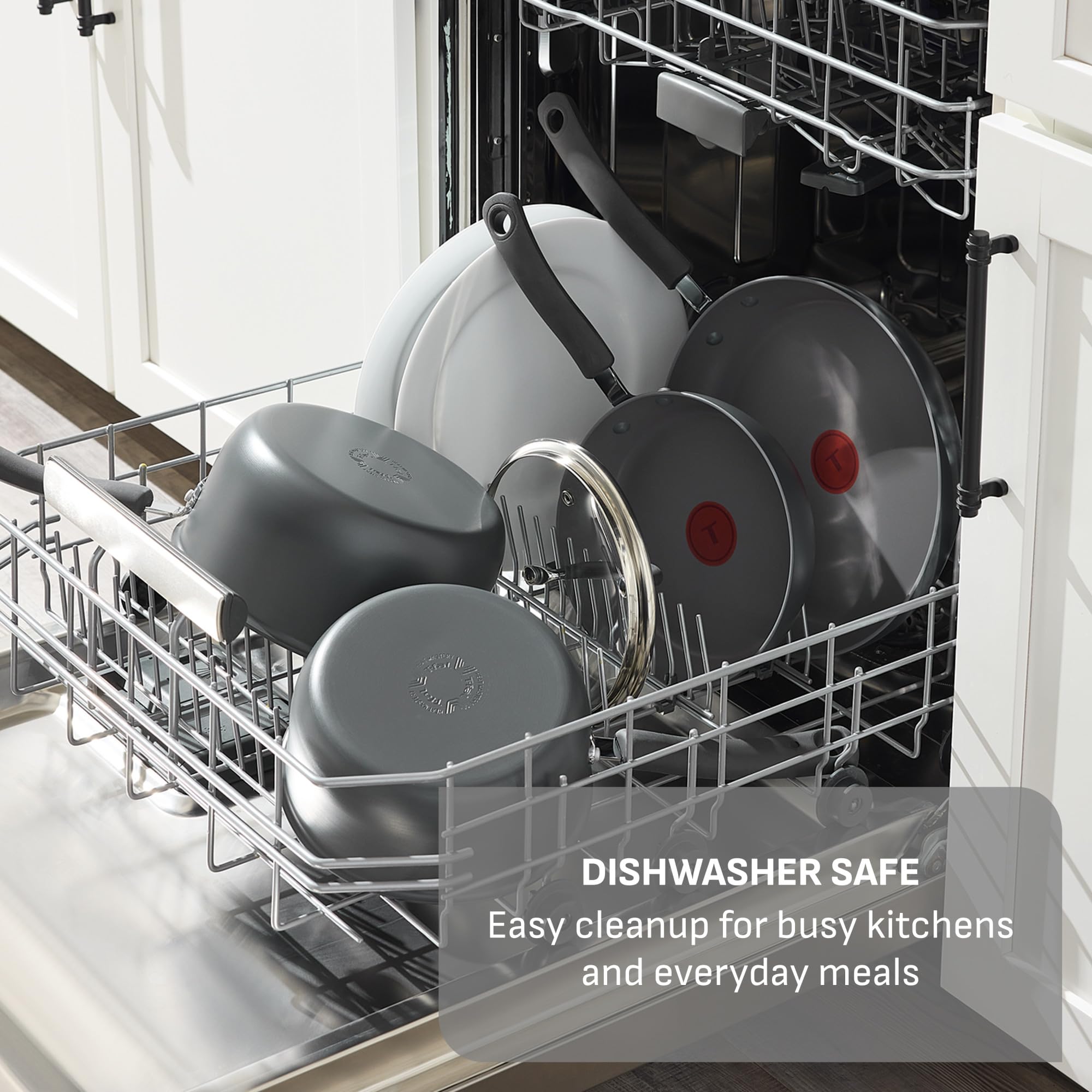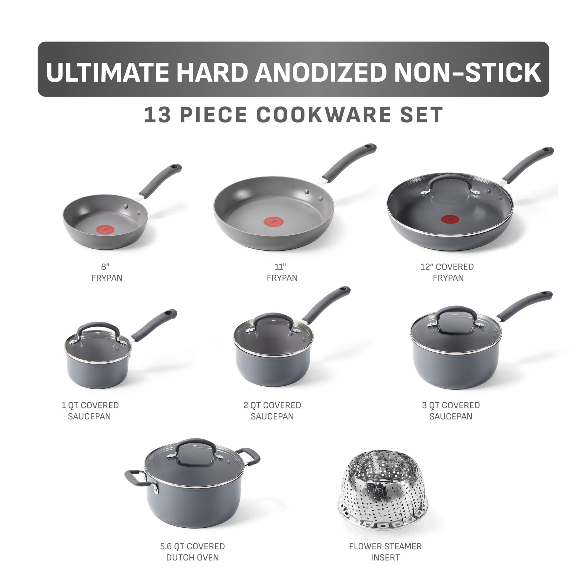 Prepare for culinary adventures with the T-fal Ultimate Hard Anodized 13 piece pots and pans cookware set. It’s hard-anodized aluminum exterior and forged design ensure durability to stand the test of time. The Titanium non-stick coating provides effortless food release, while Thermo-Spot® Technology ensures perfect preheating for consistent results every time. The anti-warping and even heat base prevents hot spots, allowing you to seal in juices and flavors. Silicone handles provide a secure grip enhancing comfort and confidence while cooking. Dishwasher and oven safe up to 400°F (lids up to 350°F), and compatible with all cooktops, excluding induction. This set is Ideal for weekday dinners, laid-back brunches, and hosting holiday gatherings, elevating your culinary experiences.