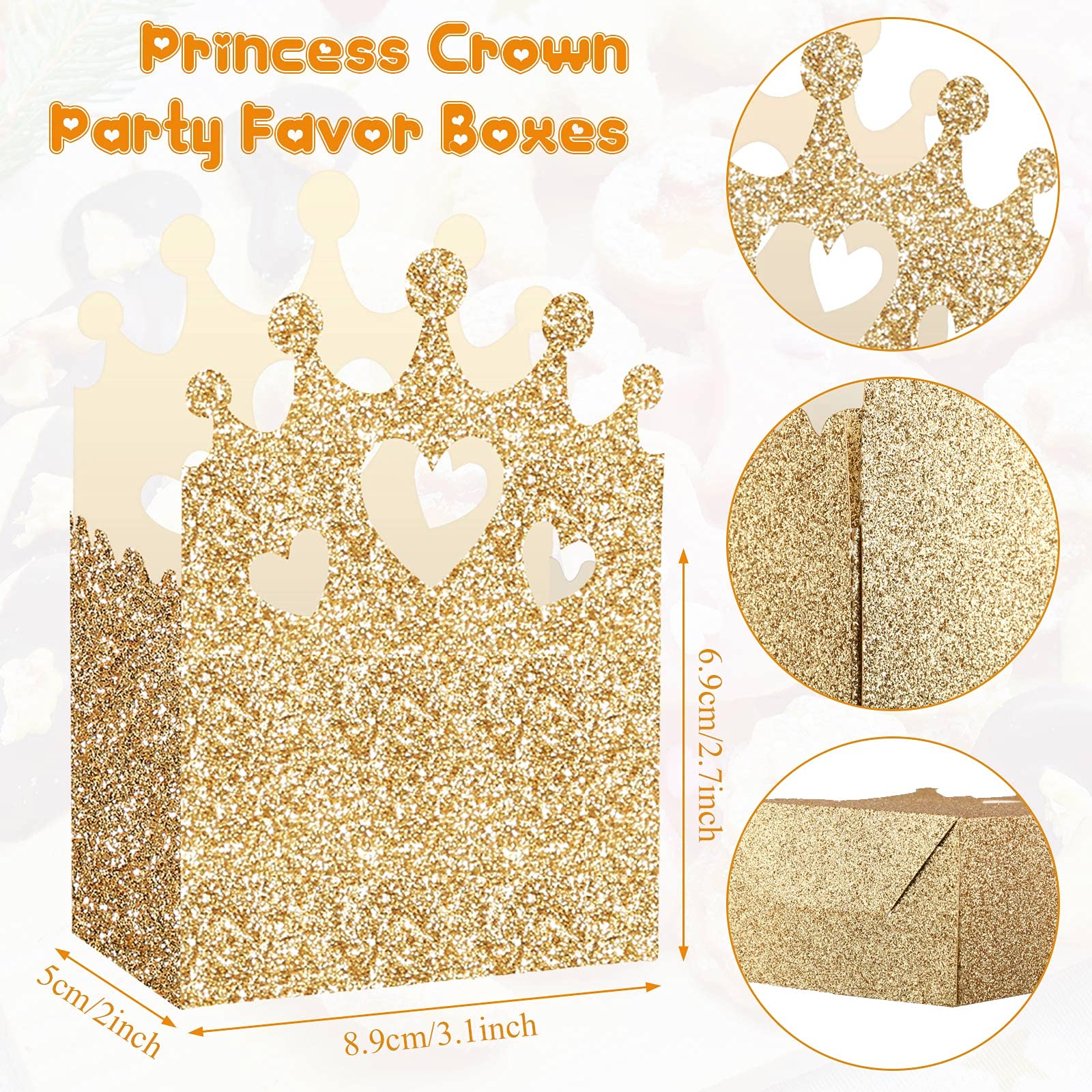 Special design: the gold crown party favor boxes are designed as a princess crown shape, with gold sequins, which highlight the grace, and meet the tastes of most people; The exquisite candy boxes make your party look shiny and eye-catching