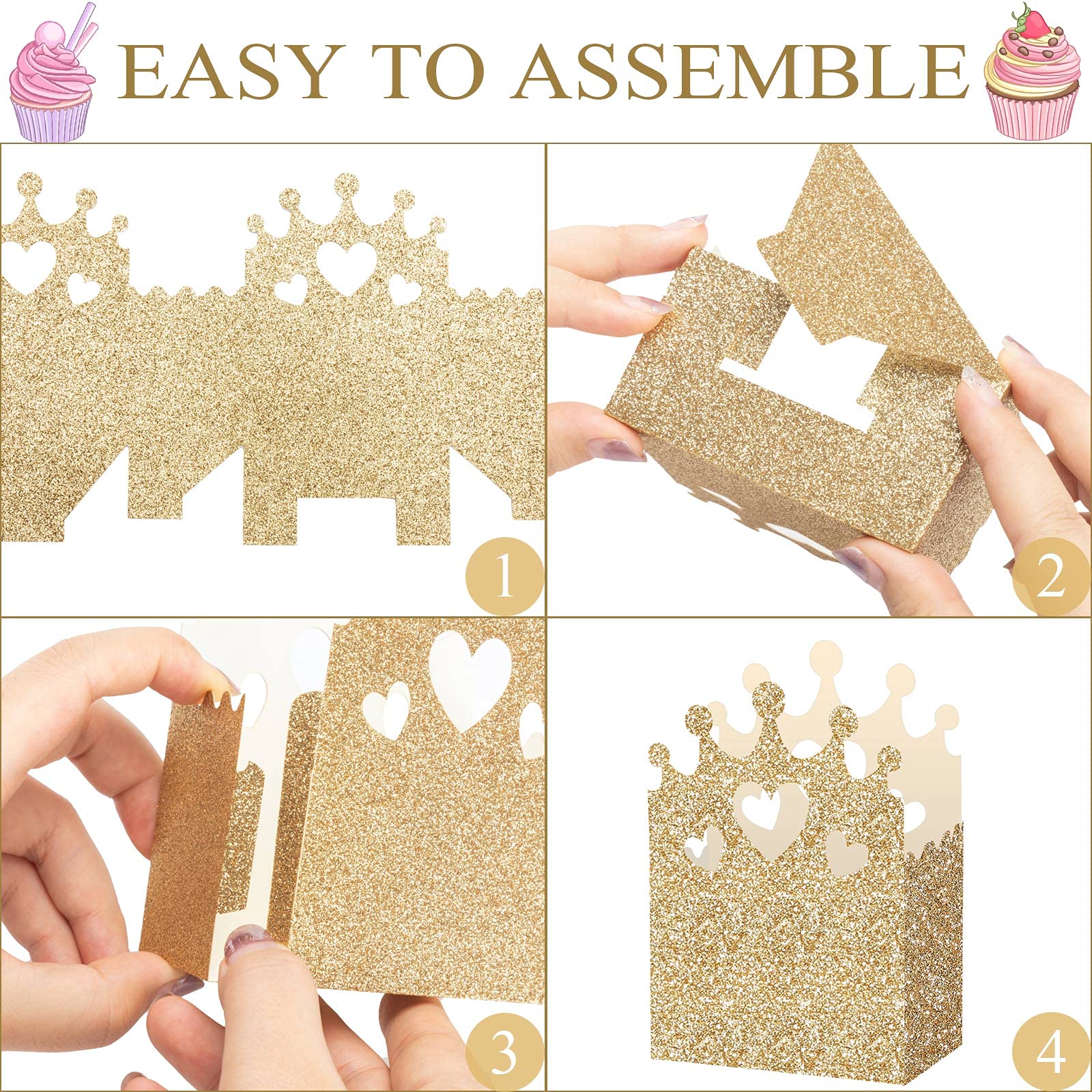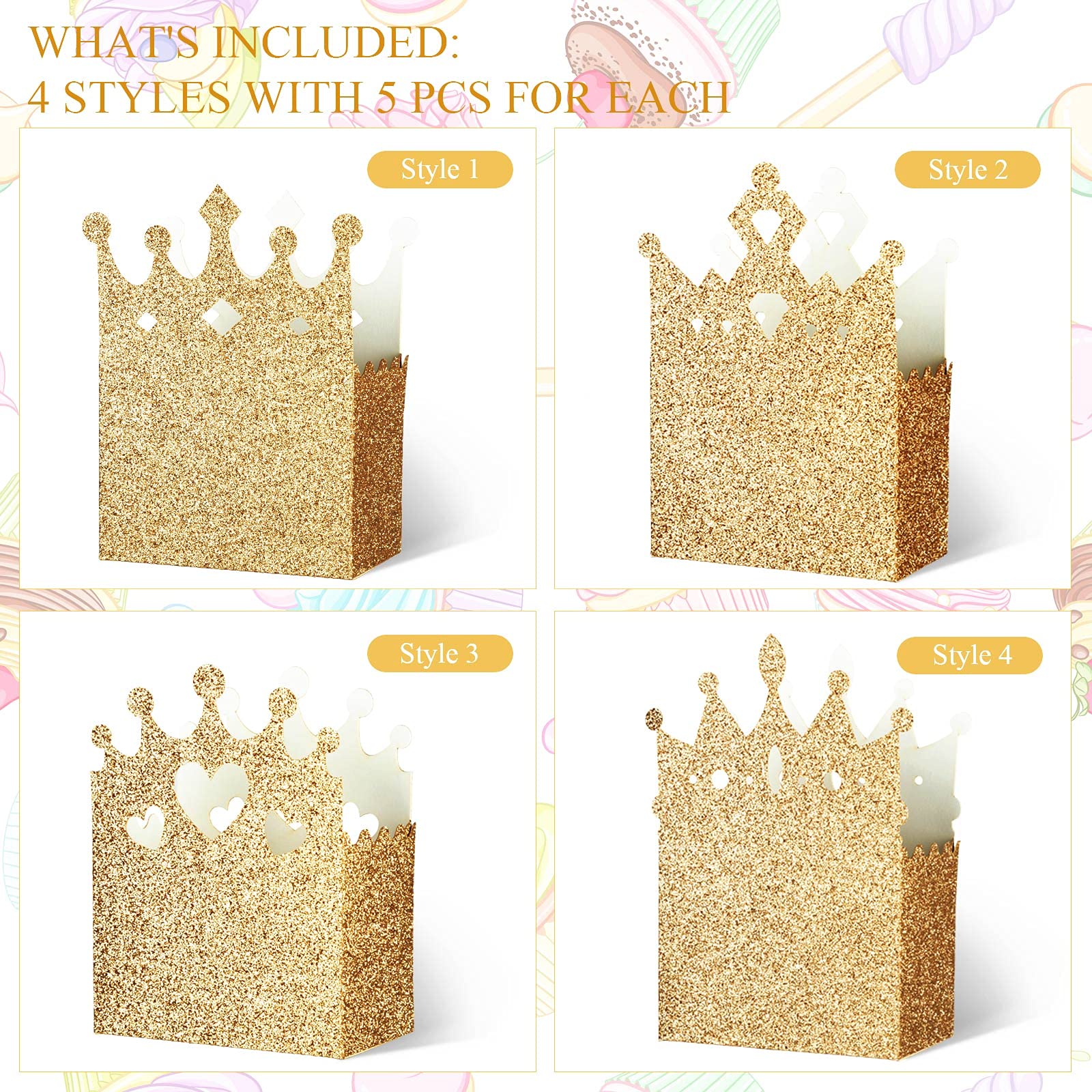 The package includes: you will receive 20 pieces of princess crown shaped candy boxes with 4 different styles, which look very gorgeous and beautiful, and provide enough quantity to satisfy your decorative needs, as well as bring you a happy princess-themed party time