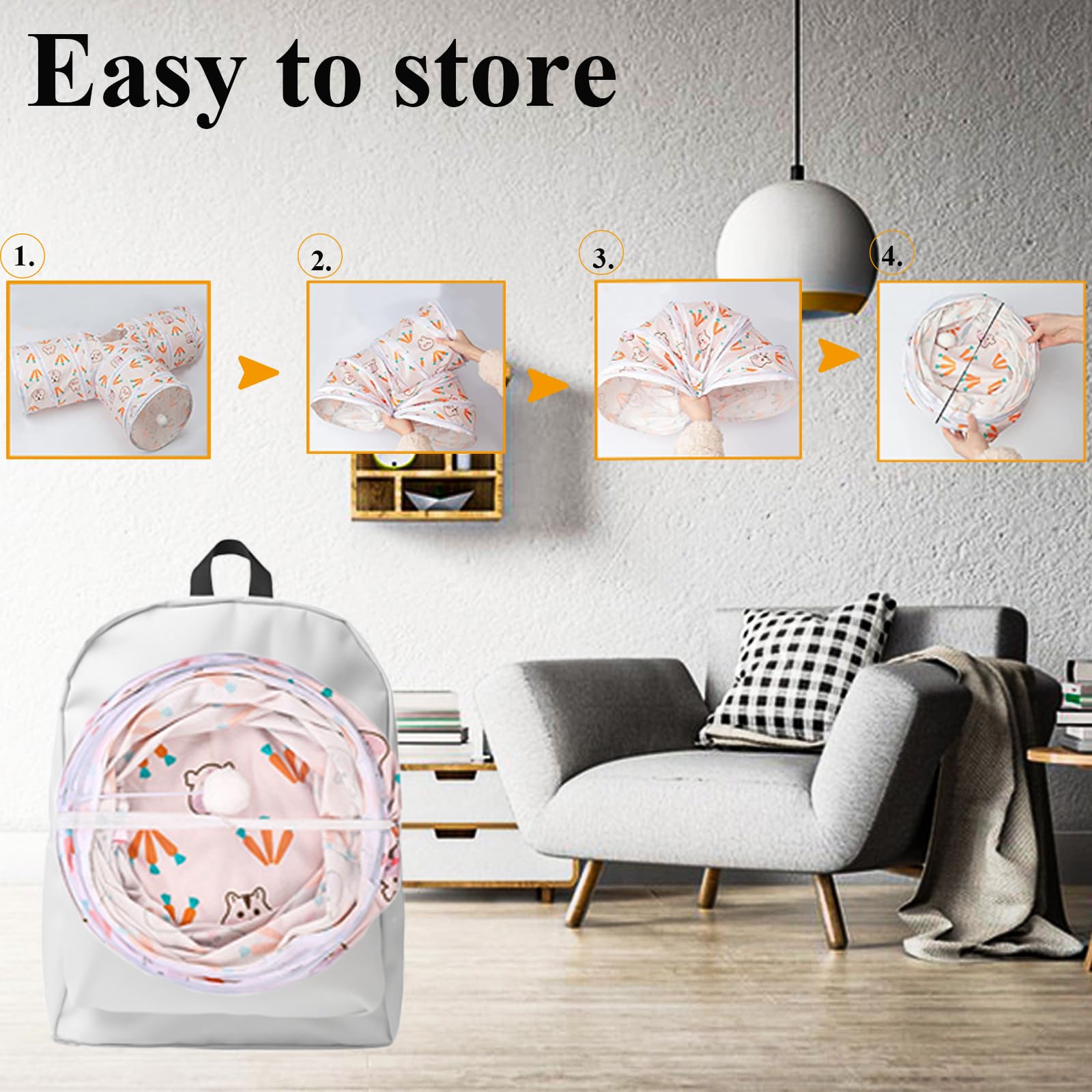 3 Way Play Tunnel: The cute cartoon pattern of rabbit and carrot is more suitable for your cute furry pet and attract their attention. There's also a hanging ball inside the tunnel, which is the perfect bunny hideout for your bunny. It will play, hang out, nap and lie down in tunnels. Your pet can jump in and pop out of the hole at the top.
