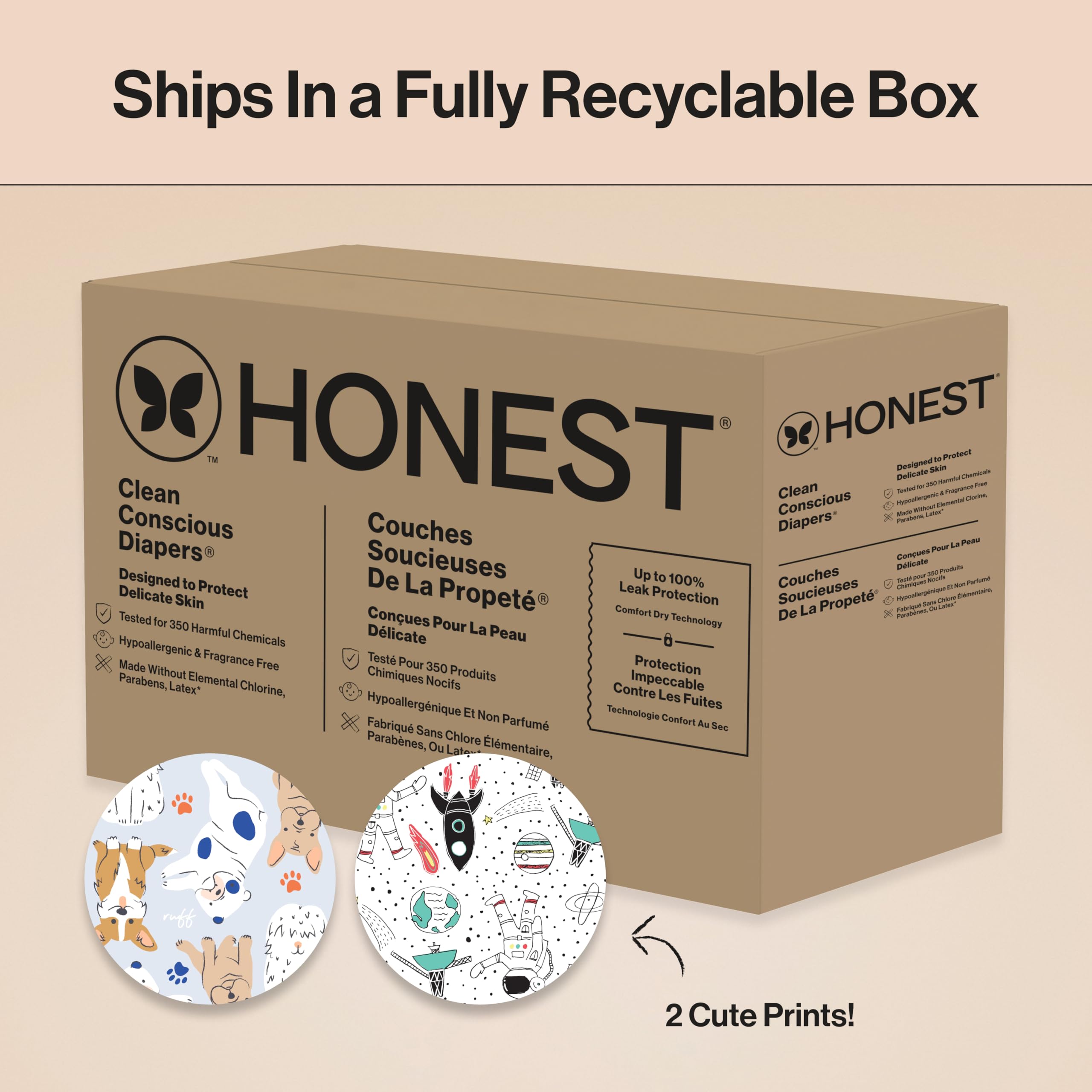 Designed to protect delicate skin, Honest Clean Conscious Diapers keep baby comfortable and dry through all the wiggles and wobbles! Our softest diaper yet delivers up to 100% leak protection with Comfort Dry Technology. The hypoallergenic, plant based inner liner, flexible stretch wings, super absorbent core, and channel technology provide a comfy, secure fit for all ages and stages. Because safety is top priority, these diapers are OEKO-TEX STANDARD 100 Certified, a 3rd party that tests for 350 harmful chemicals, and made with FSC Certified Fluff Pulp and other controlled materials. And for cuteness overload, each diaper features a super cute print!