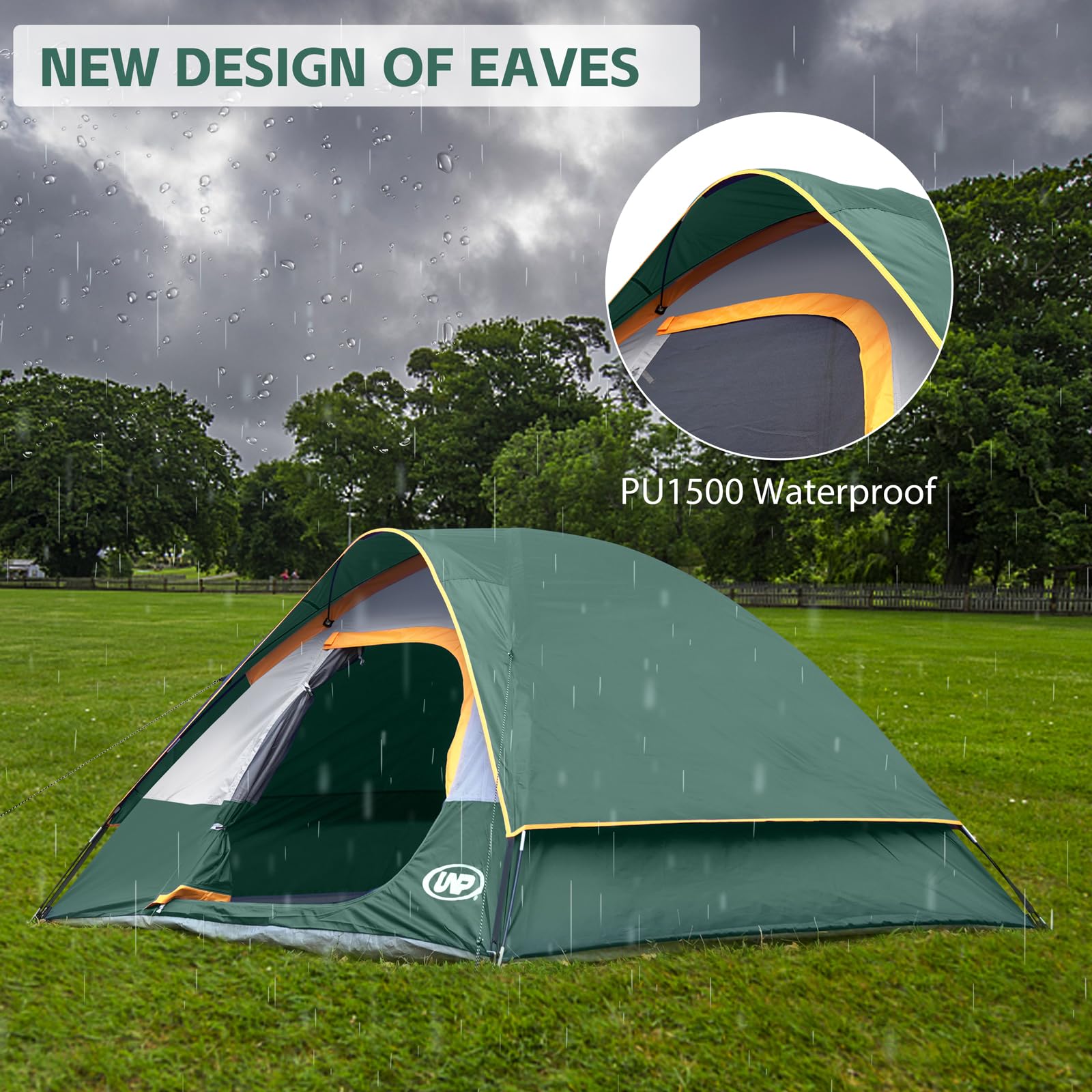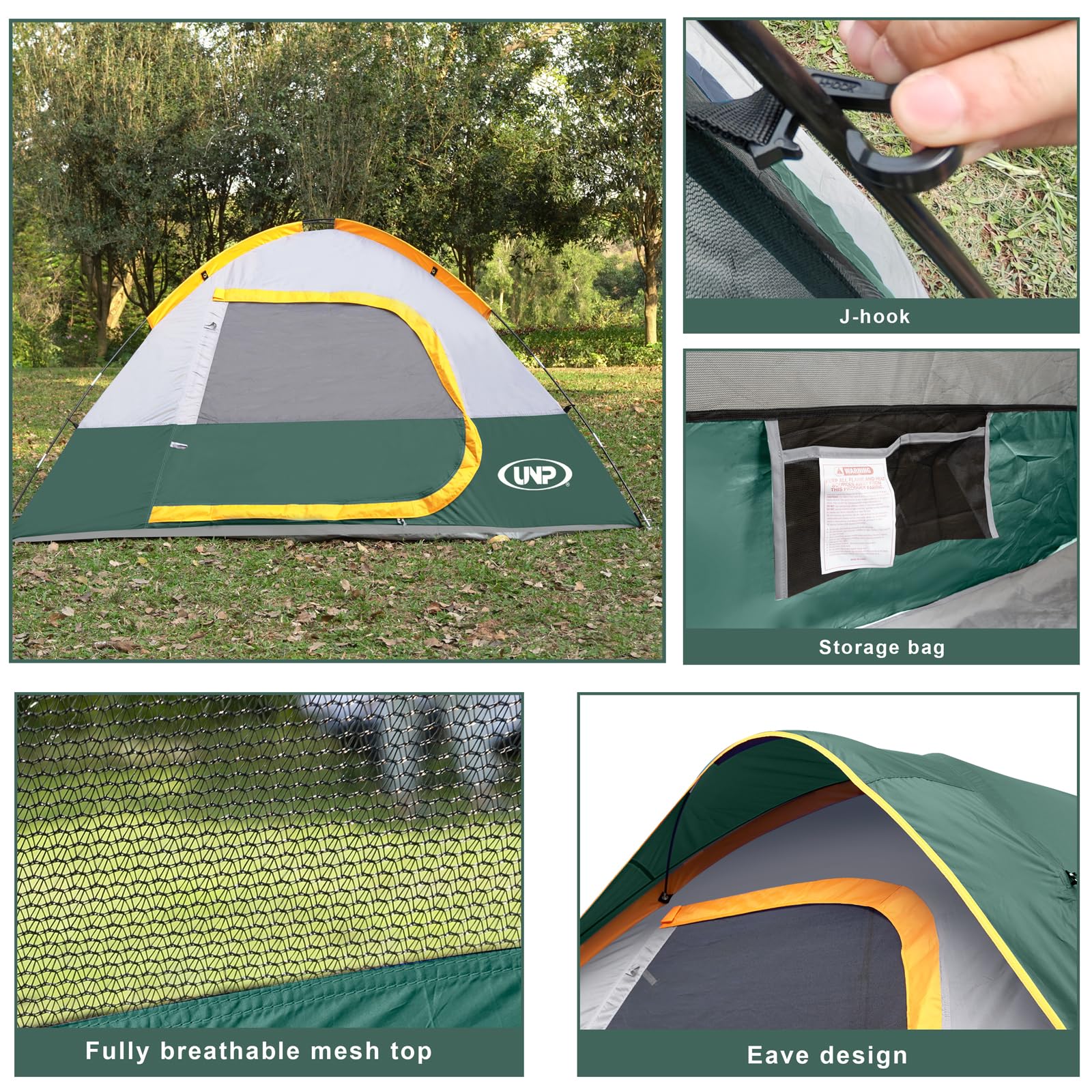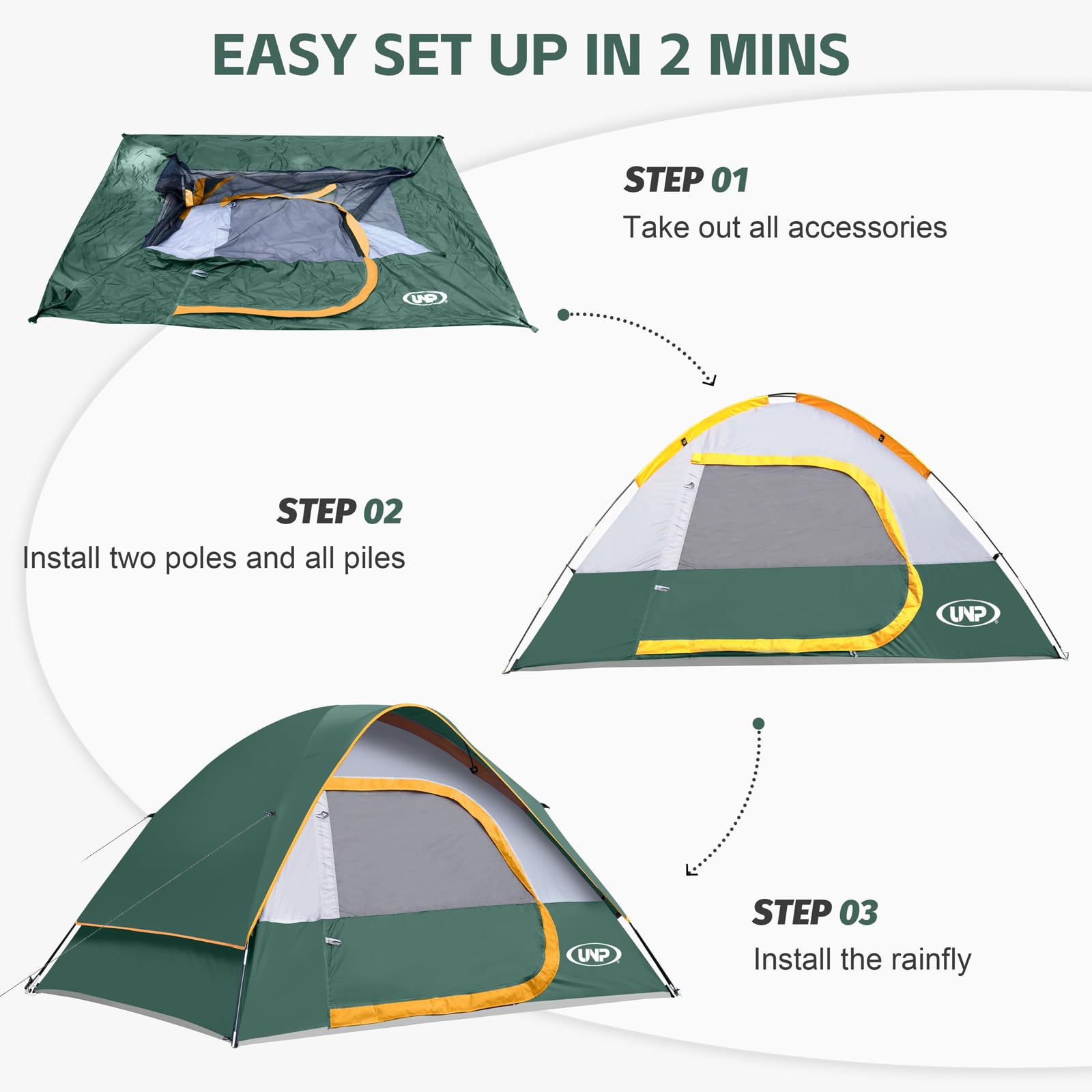 Windproof & Rainproof : The camping tent is made of stronger tear-resistant polyester. It comes with a removable rainfly, the special eave and zippers designed for keeping the rain outside the tent. The ropes of tent and piles ensure safety and stability