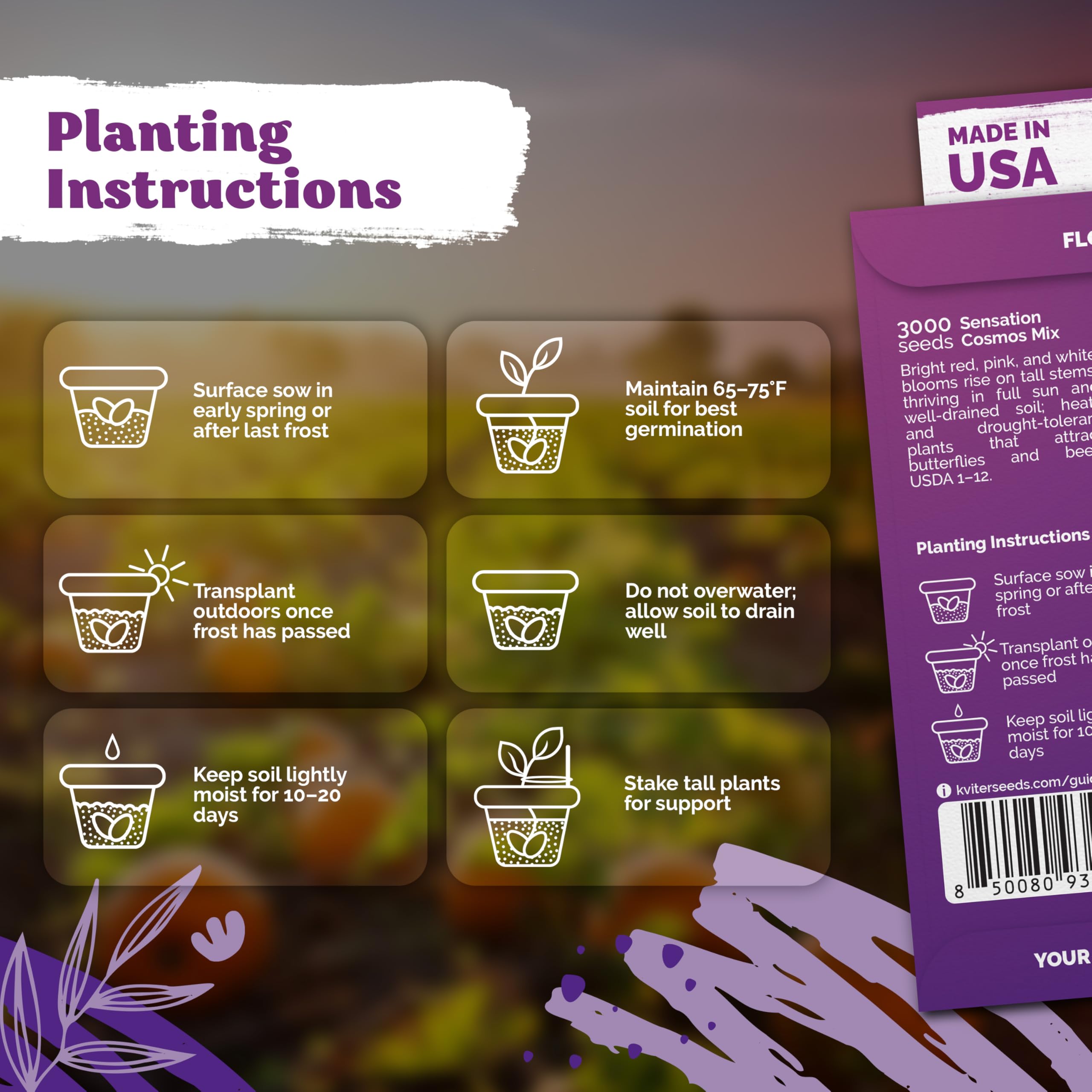 Vibrant Sensation Mix Blooms: Annual Cosmos seeds produce tall cosmos flowers in white, pink, and red, growing up to 60 inches tall. Ideal cosmos seeds for planting outdoors in sunny flower garden and beds.