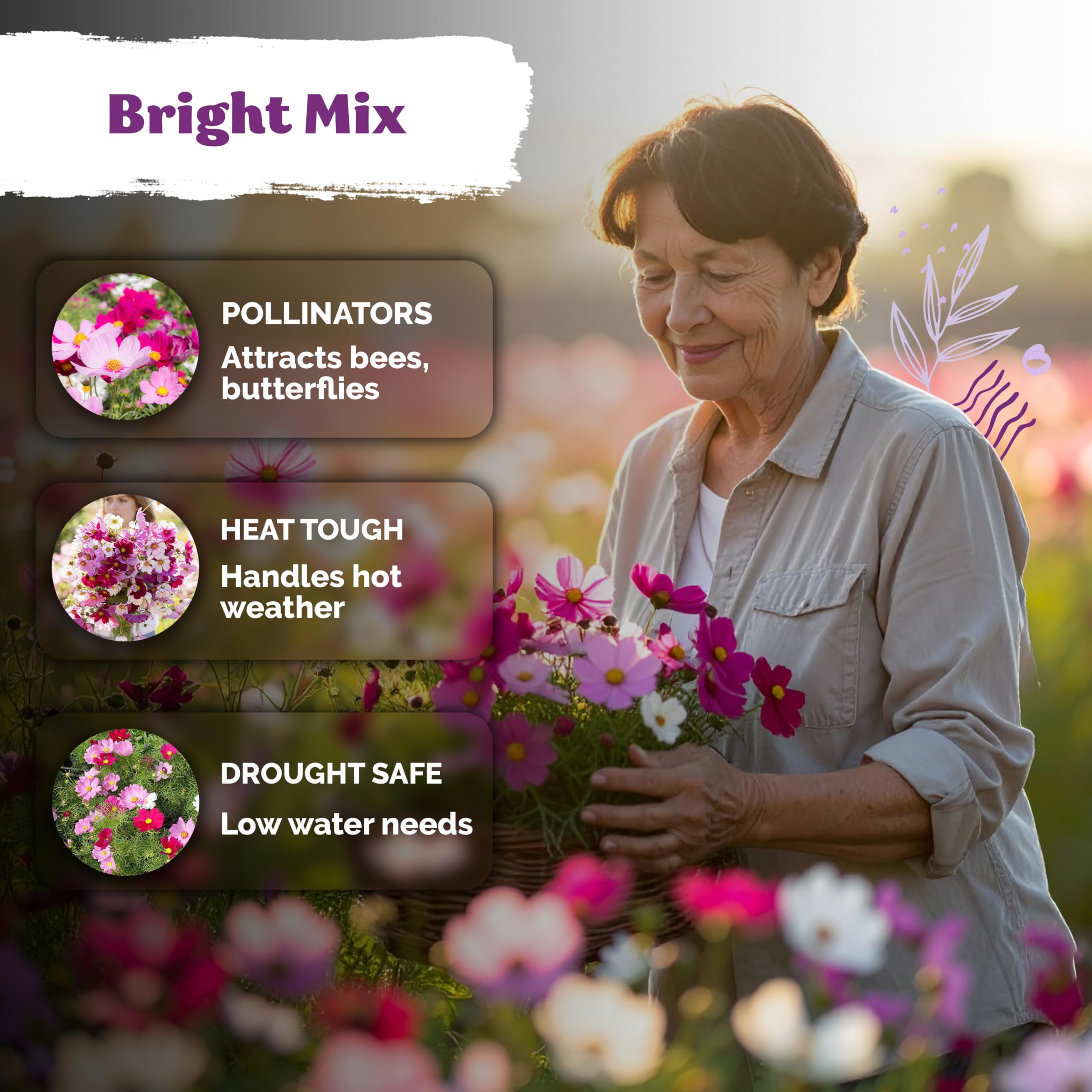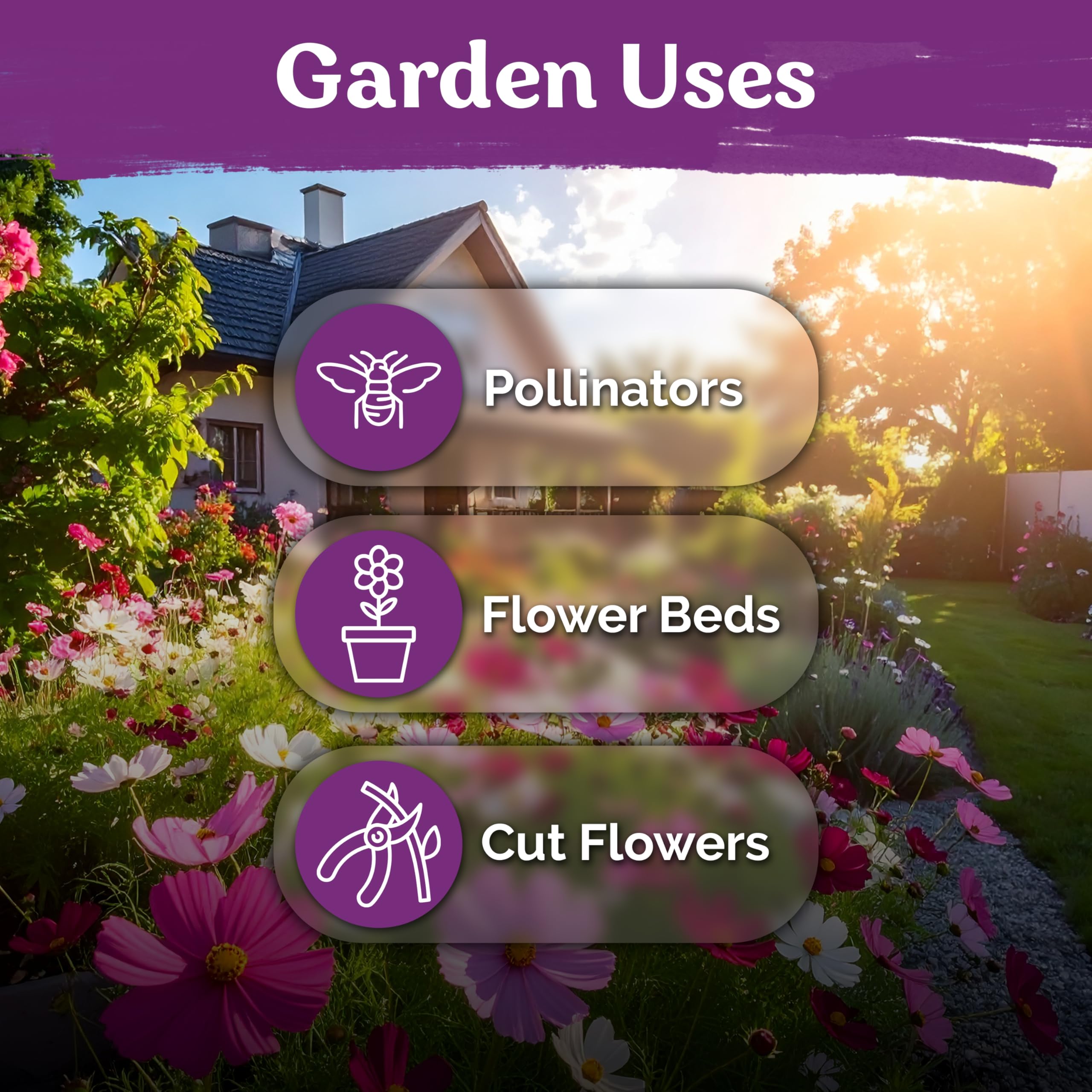Pollinator Friendly Flowers: These bulk Cosmos seeds attract butterflies, bees, and birds, making this flower mix seeds ideal for pollinator seed mix gardens, cottage landscapes, and natural flower beds across USDA zones 1–12.