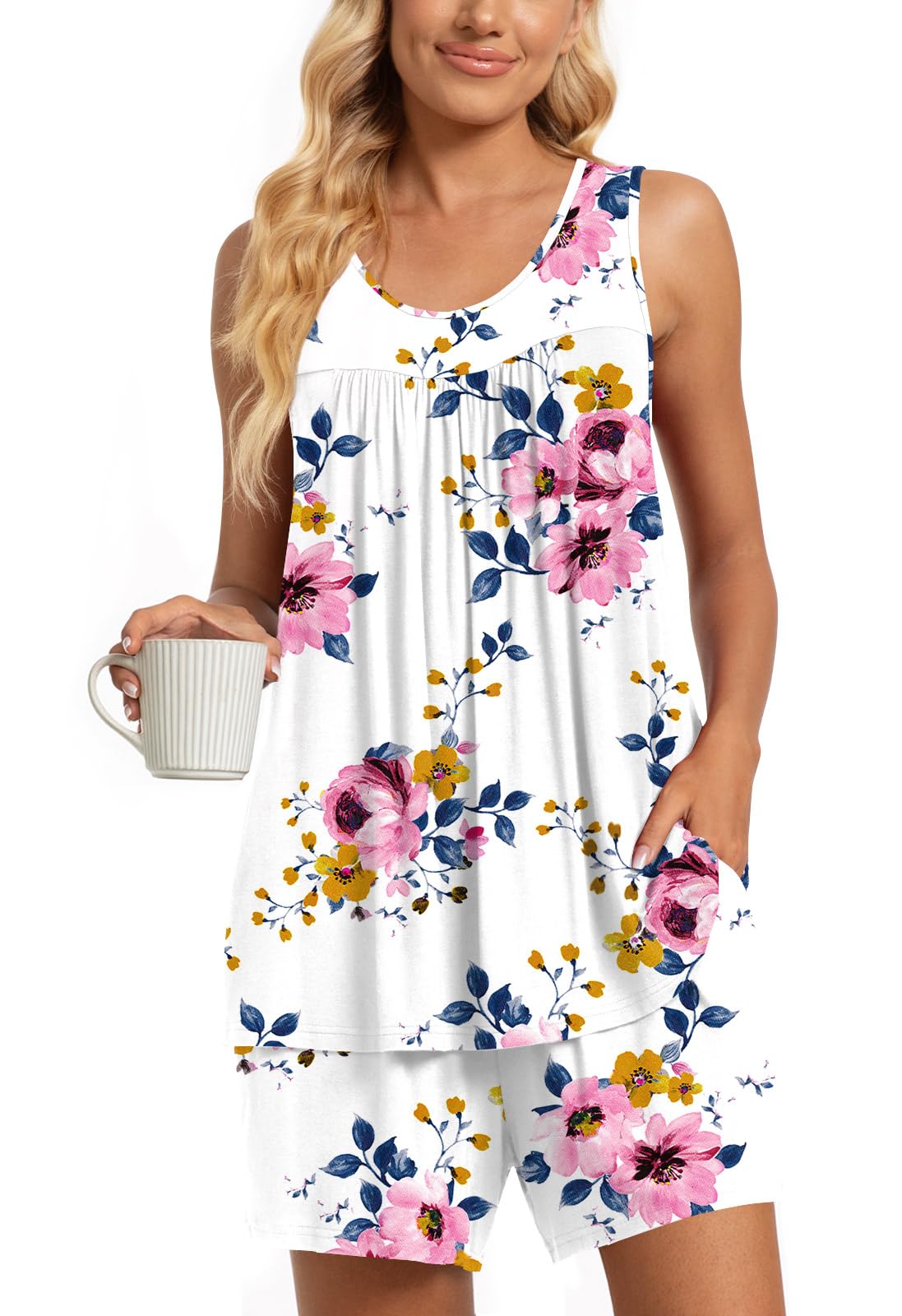 Comfortable pajama set: This casual sleeveless pajama set is made of 95% rayon with 5% spandex. This material is soft and comfortable, has great stretch, washes and dries well, and doesn't wrinkle
