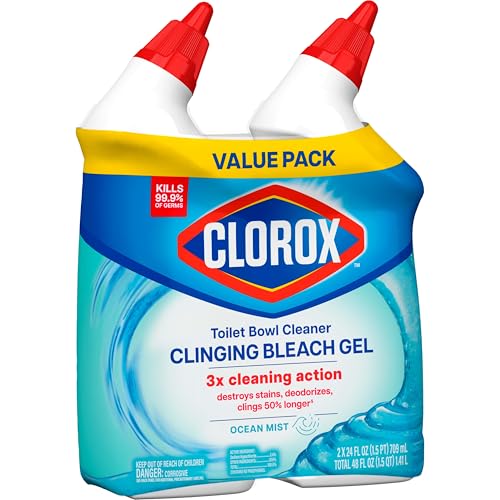 Trust the thick clinging gel formula of Clorox Toilet Bowl Cleaner Clinging Bleach Gel for a sparkling clean. This Clorox toilet cleaner delivers 3X cleaning action. It destroys stains, deodorizes, and clings 50% longer (1). It also kills 99.9% of germs (2) and clears toilet bowl odors from your bathroom with an Ocean Mist scent. The wide dispensing bottle and clinging gel formula coats the bowl and rinses away unsightly pink toilet rings as well as mold and mildew stains. Use this Clorox toilet bowl clinging gel to whiten and brighten your bowl and leave it refreshed for the next go. (1) Vs. Clorox Toilet Bowl Cleaner with Bleach, Rain Clean. (2) When used as directed on hard nonporous surfaces.