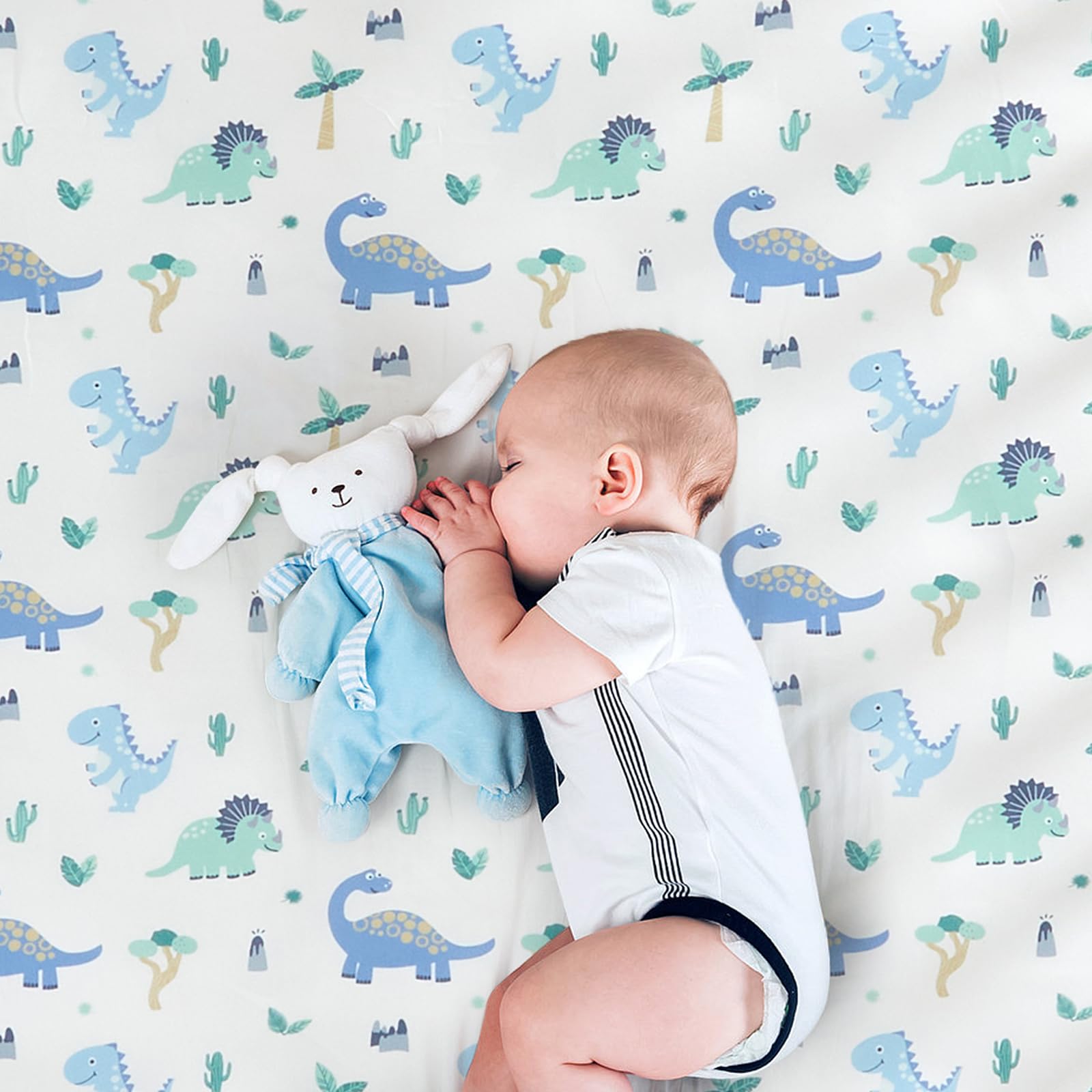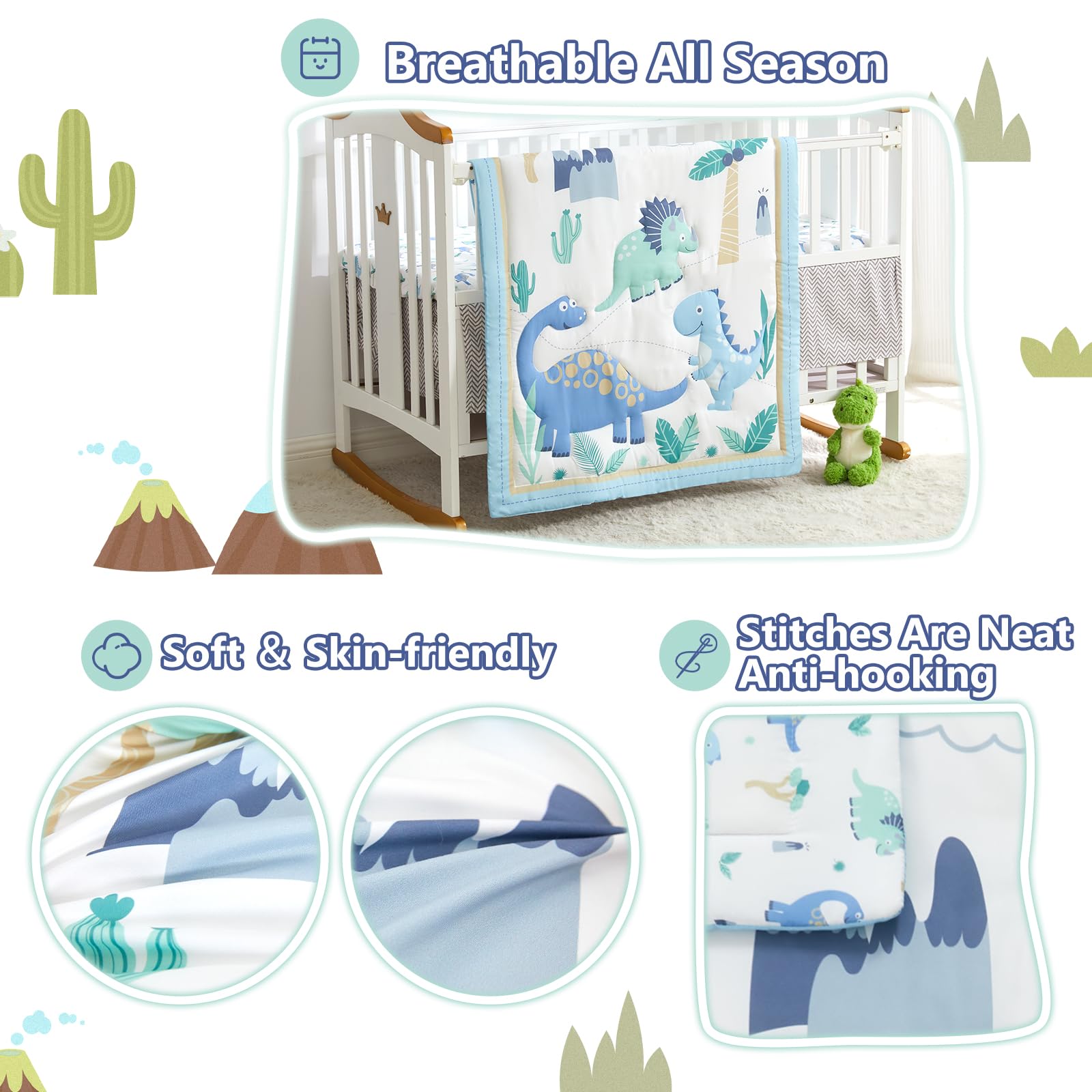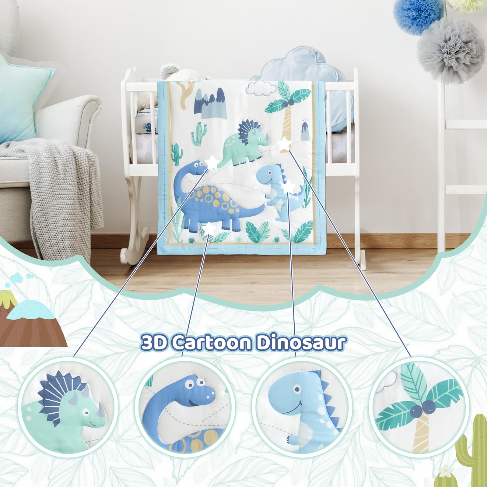 Dinosaur Theme: The baby boy crib bedding set features dinosaurs in light blue. It creates a dreamy bedroom, bringing more color and warmth to life. You will find your baby getting a restful sleep