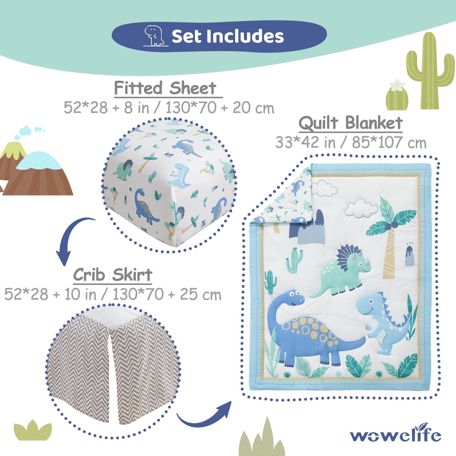 Packing List: Dinosaur crib bedding set for boys includes 1 comforter (42 X 33 inch), 1 crib skirt (52 X 28 + 10 inch deep pockets) and 1 crib fitted sheet (52 X 28 + 8 inch drop). Suited for crib bed (52 X 28 inch)