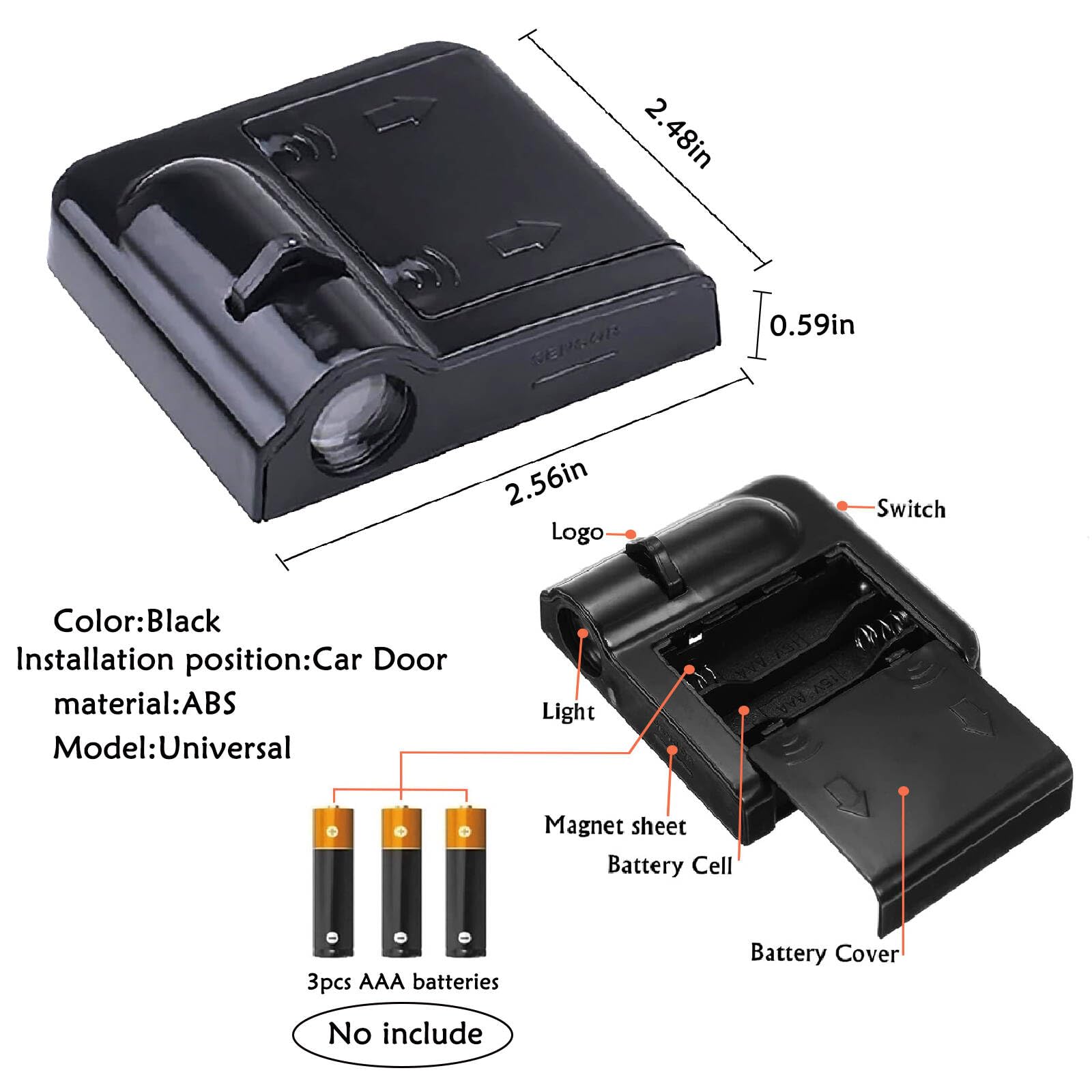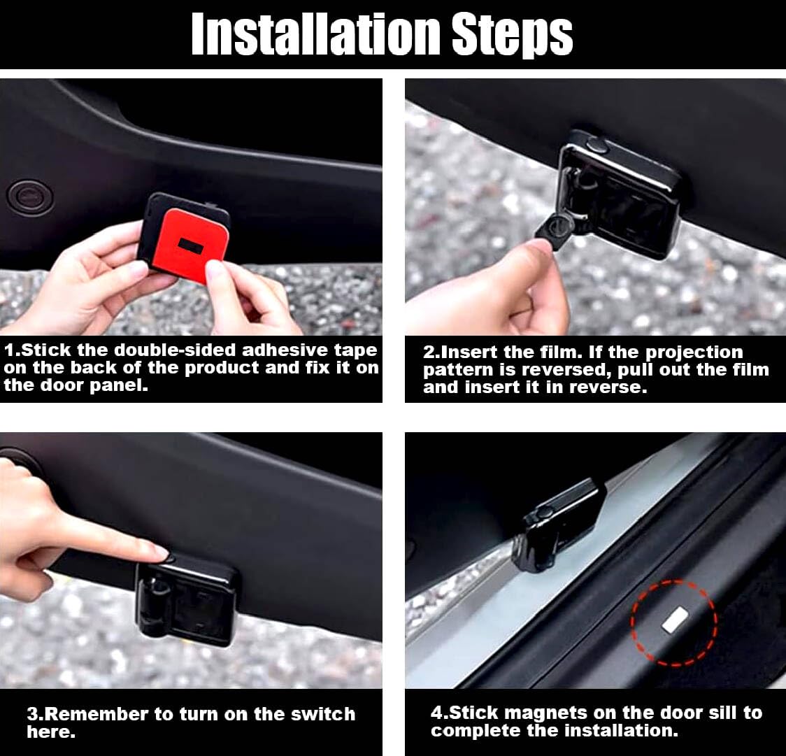 Easy to Install:Car door projector no drilling, , super easy to install, there are two car door projector lights in the package, just stick the car lights on the left and right door panels, no need to worry about falling off,the stickers are super sturdy and durable, No damage to your car at all. Car puddle light powered by 3pcs AAA batteries(package not included).
