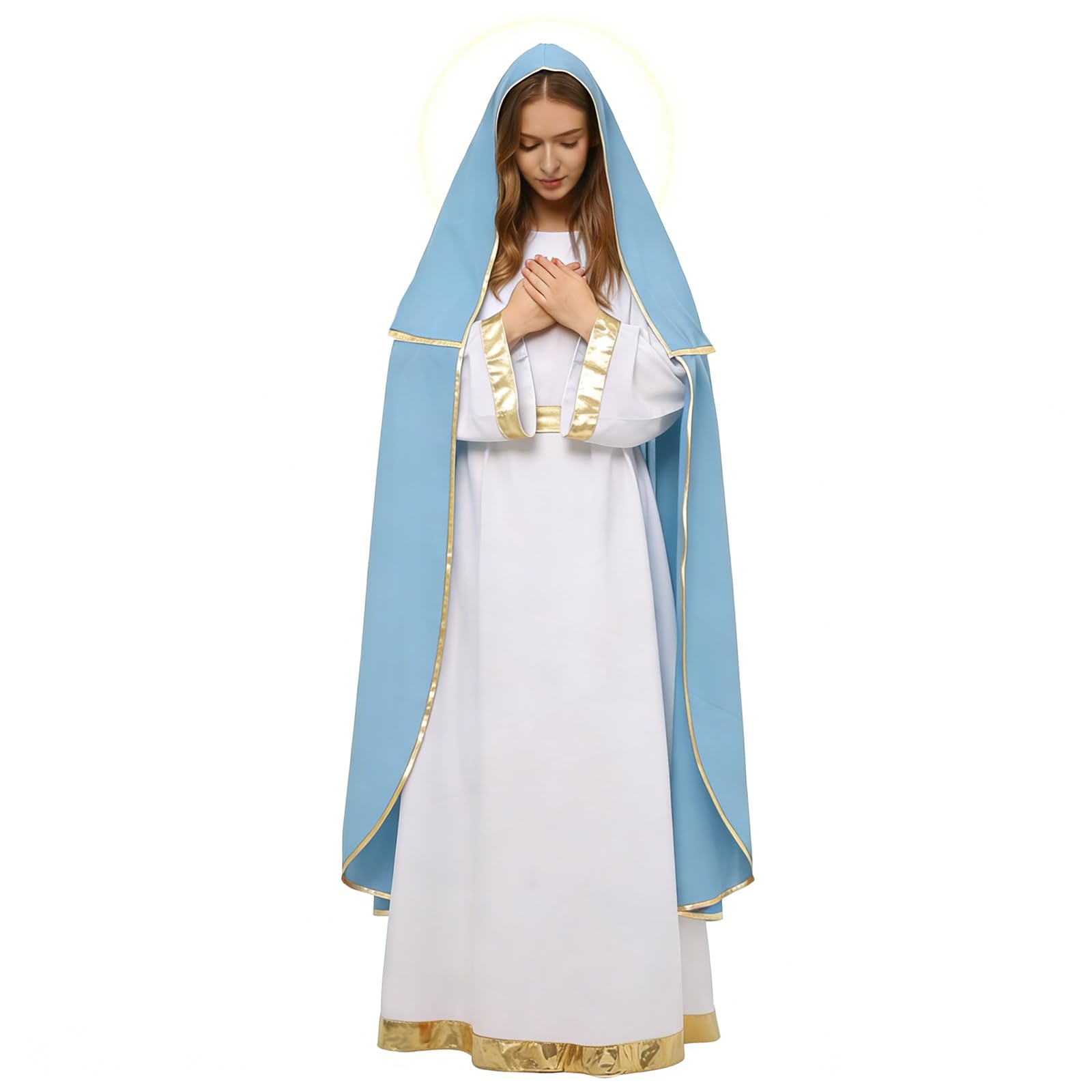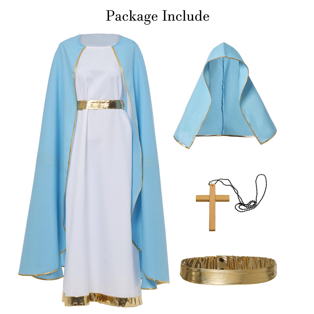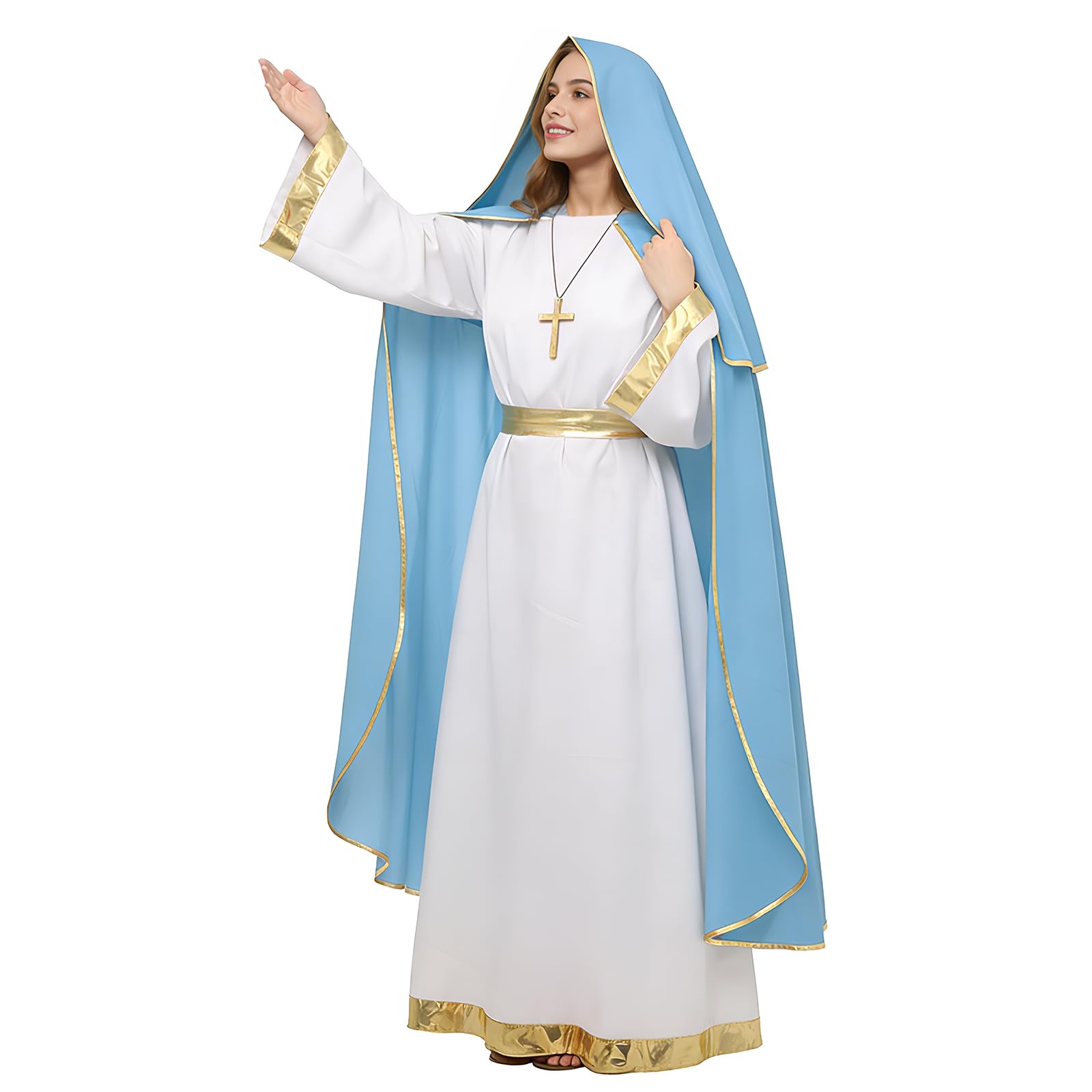 Package Includes: This adult Mary costume set includes a long robe with cape, a headscarf, a golden belt, and a cross necklace. Everything you need for nativity plays, church performances, Easter pageants, or other biblical-themed events
