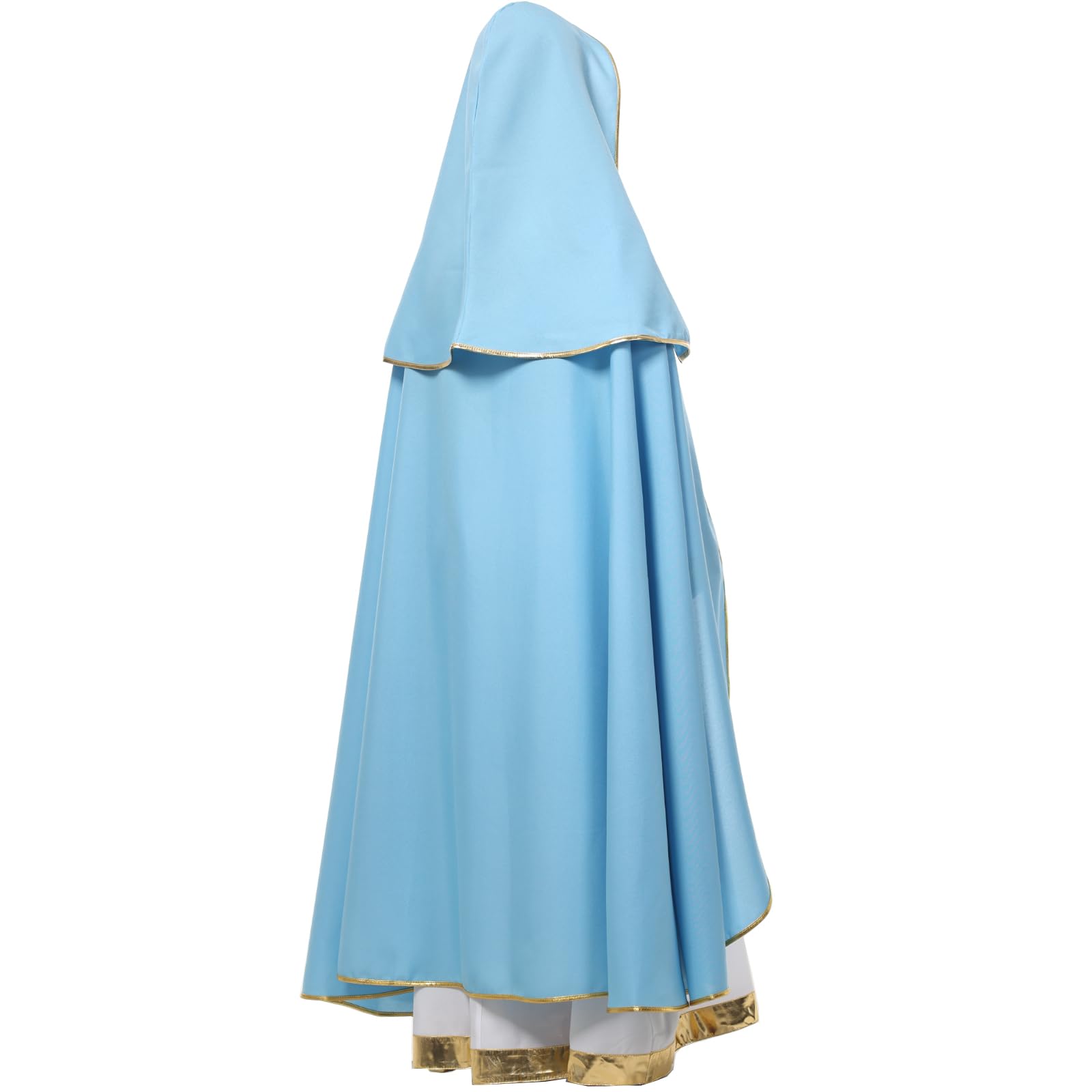 Classic Design: Features a traditional Mary-inspired look with a flowing robe, cape, and gold trim. The loose fit makes it easy to put on and allows comfortable movement during performances
