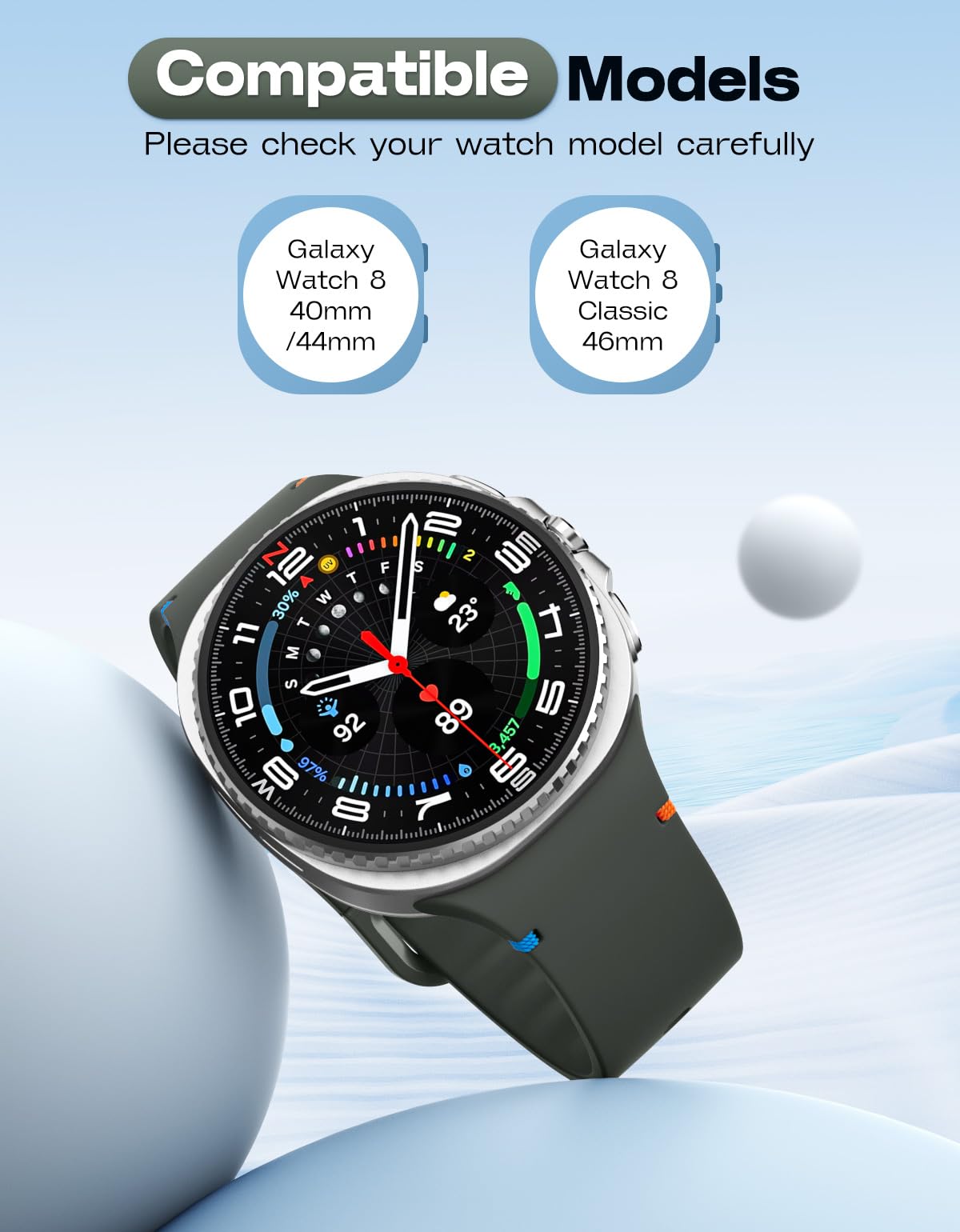 Compatible Models: This soft silicone band is only compatible with Samsung Galaxy Watch 8 band 40mm/44mm and Galaxy Watch 8 Classic band 46mm. Note: Smartwatches are not included.