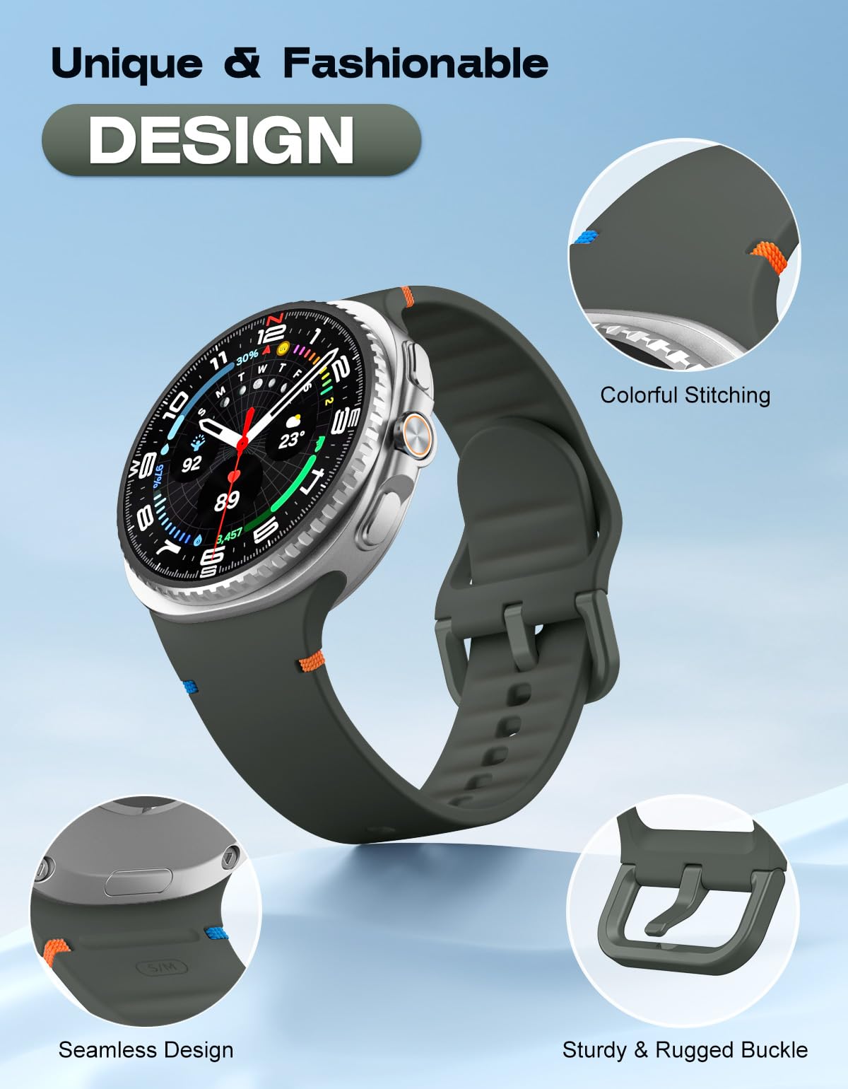 Seamless Design: The Galaxy Watch 8 band is accented with colorful stitching, adding a touch of elegance to your wrist, and the rippled design inside the band allows for easy drainage and quick drying of sweat. It has a lugless design that blends seamlessly into the body of the watch, ensuring a sleek look and comfortable fit, especially during intense exercise.
