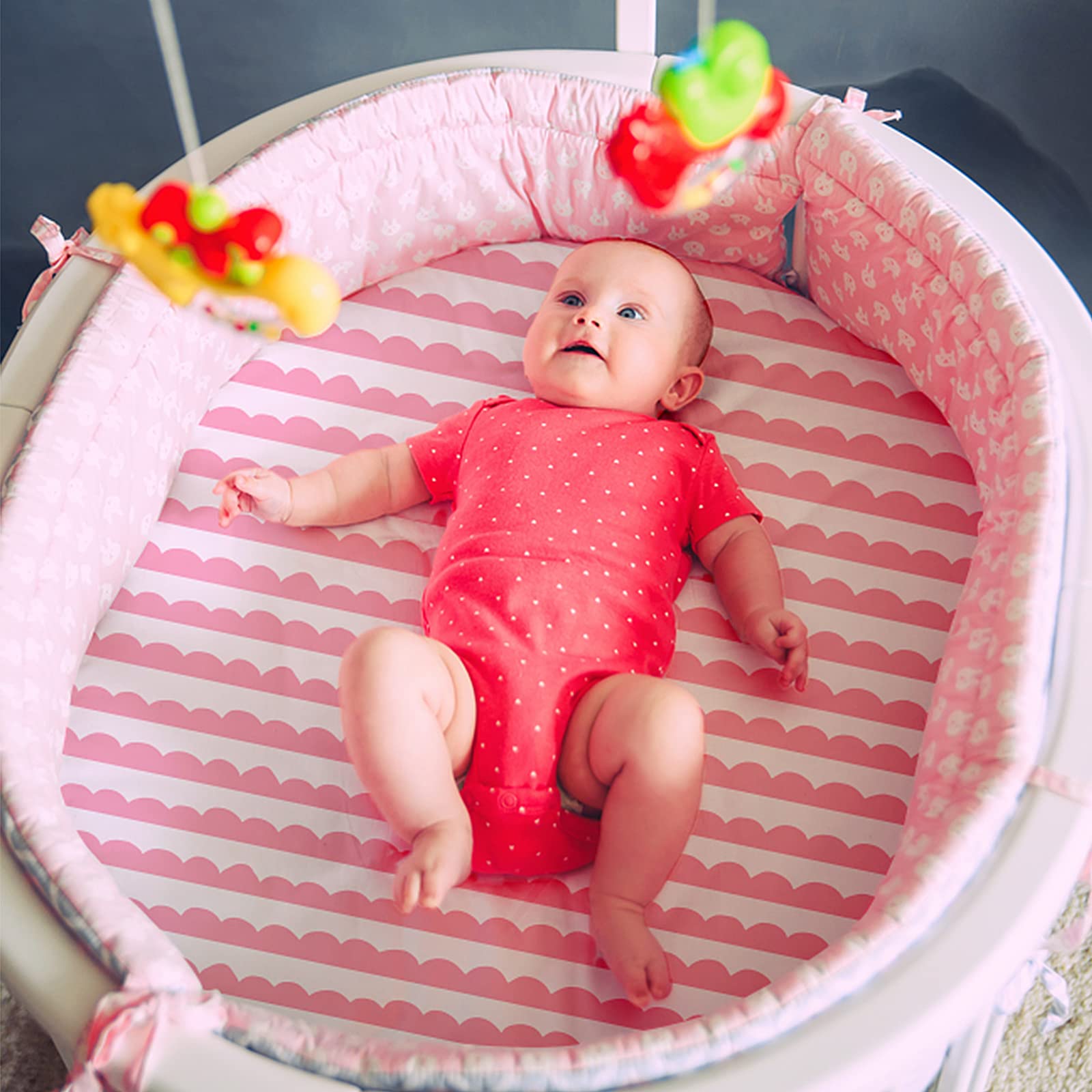 SUPER SOFT FABRIC: Our bassinet sheets are made from super soft and breathable fabric that feels great against babyβs skin. The full elastic band ensures a secure fit around the standard bassinet mattress, preventing slipping and providing a comfortable, stable sleeping space for your baby. Rest assured, every product meets the OEKO-TEX Standard 100 for safety