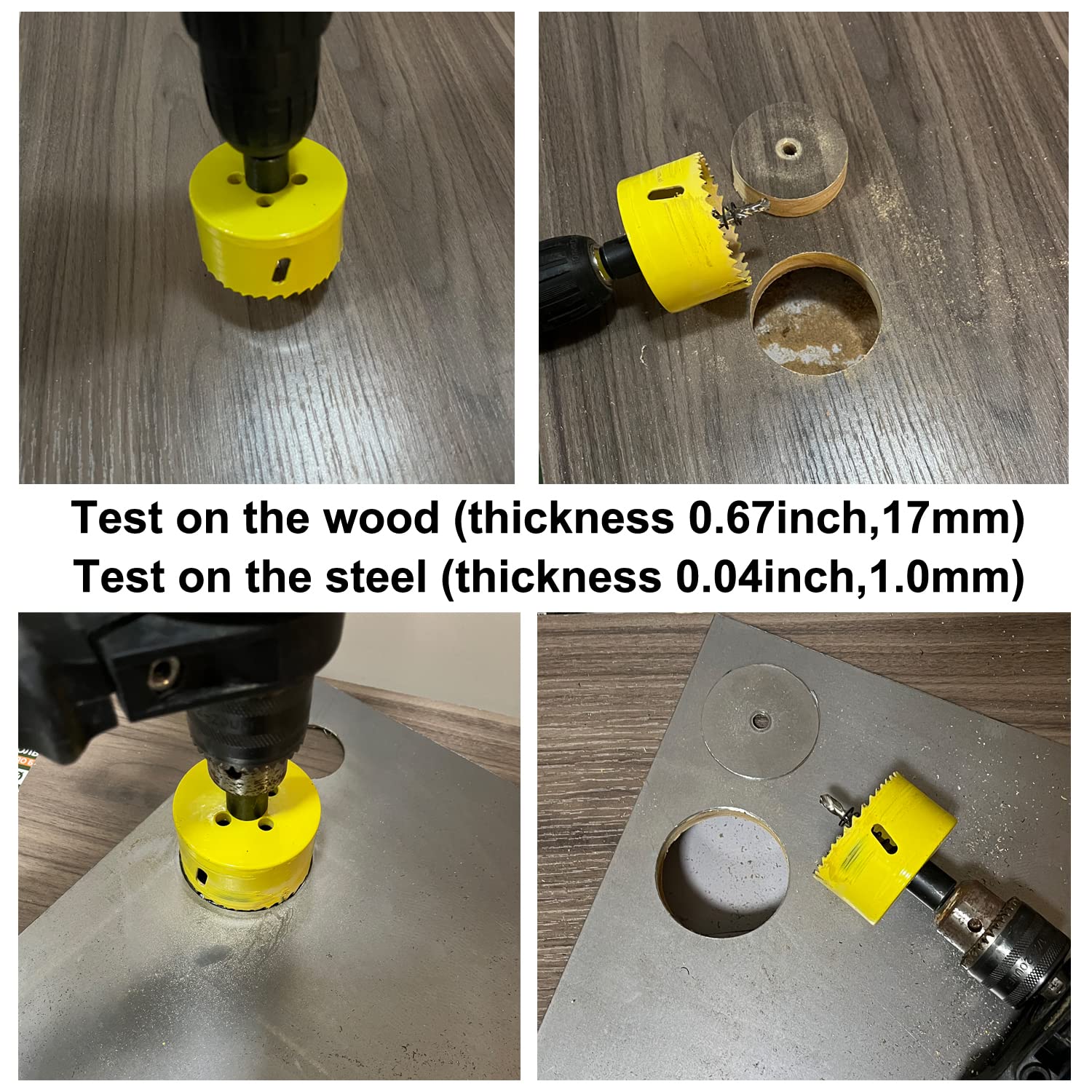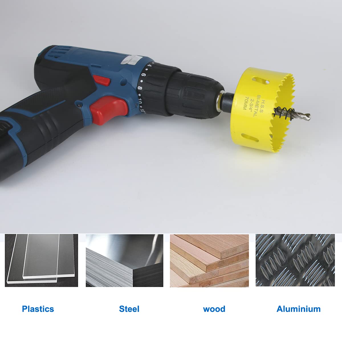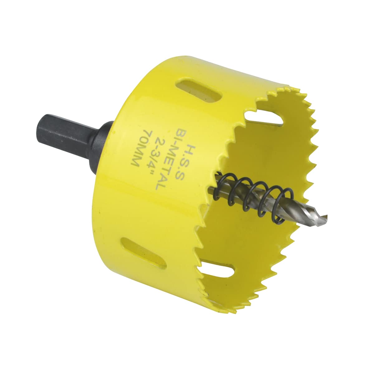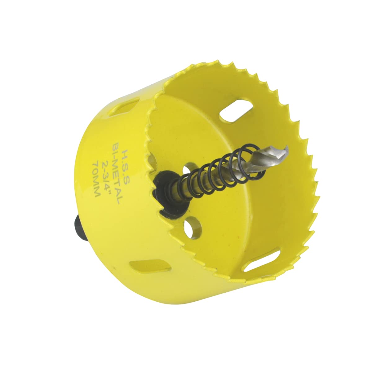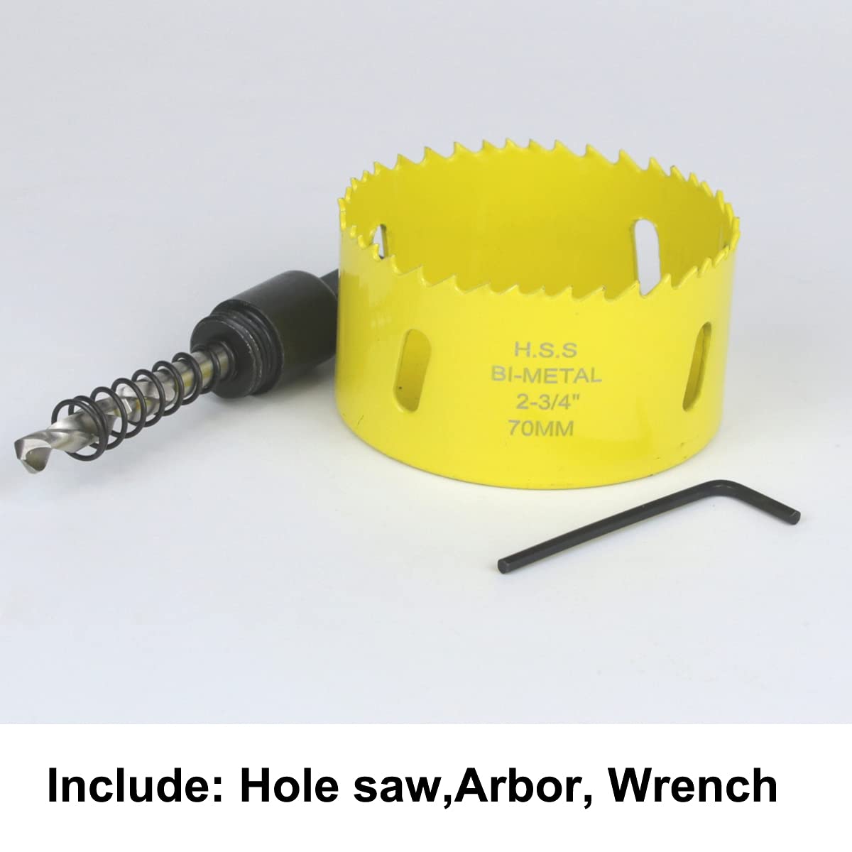 HSS M42 Bi-metal 2-3/4 Inch Hole saw : 1.diameter 2-3/4" (70mm) 2.Cutting depth 1.24 inch (32mm) 3.include 1pcs bimetal hole saw 2-3/4 inch,1pcs mandrel with pilot drill bit and spring,1pcs wrench. 4.This hole saw of 2-3/4 inch is good for wood working, also can make some holes on thin soft steels. and the big mandrel is better for fixing the hole saw, so that it is more stable and efficient when drilling,and the service life for hole saw is longer 5.please use low rotation speed for these big hole saws in first, and later with higher speed. 6.It is useful to make 2-3/4 inch holes for cornhole boards, air ducts, ceiling lights, speakers and more