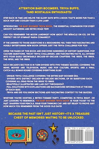 Attention Baby Boomers, Trivia Buffs, and Nostalgia Enthusiasts! Step back in time and relive the glory days with a book that's more fun than a sock hop and cooler than a lava lamp. Introducing The Baby Boomer Trivia Book, the essential companion for every groovy gathering and retro road trip! Can you remember the Moon landings? How about the Miracle on Ice, or the perfect 10s of gymnast Nadia Comaneci? If the answer to those questions is a resounding yes, then this fascinating and hugely entertaining new book offers just the trivia challenge for you! Open the pages of this book and discover hundreds of history questions, pop culture questions, tricky trivia challenges, and fascinating facts, all divided into four easily browsable decade-by-decade chapters: the 1950s, the 1960s, the 1970s, and the 1980s. Each decade’s section is in turn divided into five themed quizzes, covering the news, movies and television, music and pop culture, sports, and a final catch-all bonus round covering everything else! Unique trivia challenge covering the entire Baby Boomer era Divided into distinct decade-by-decade sections, of 50 questions each, covering all eras from the 1950s to 1980s Beautifully illustrated and laid out throughout Full solutions with explanations and background information at the end of each quiz Trivia and Did You Know sections add fascinating context to the quizzes Whether you’re hosting a retro-themed party, competing in trivia night, or just looking to reminisce, The Baby Boomer Trivia Book is your ticket to the past. Sharpen your pencils, grab your thinking cap, and get ready to prove just how much you remember from the good old days! Because the past isn’t just history—it’s a treasure chest of memories waiting to be unlocked.