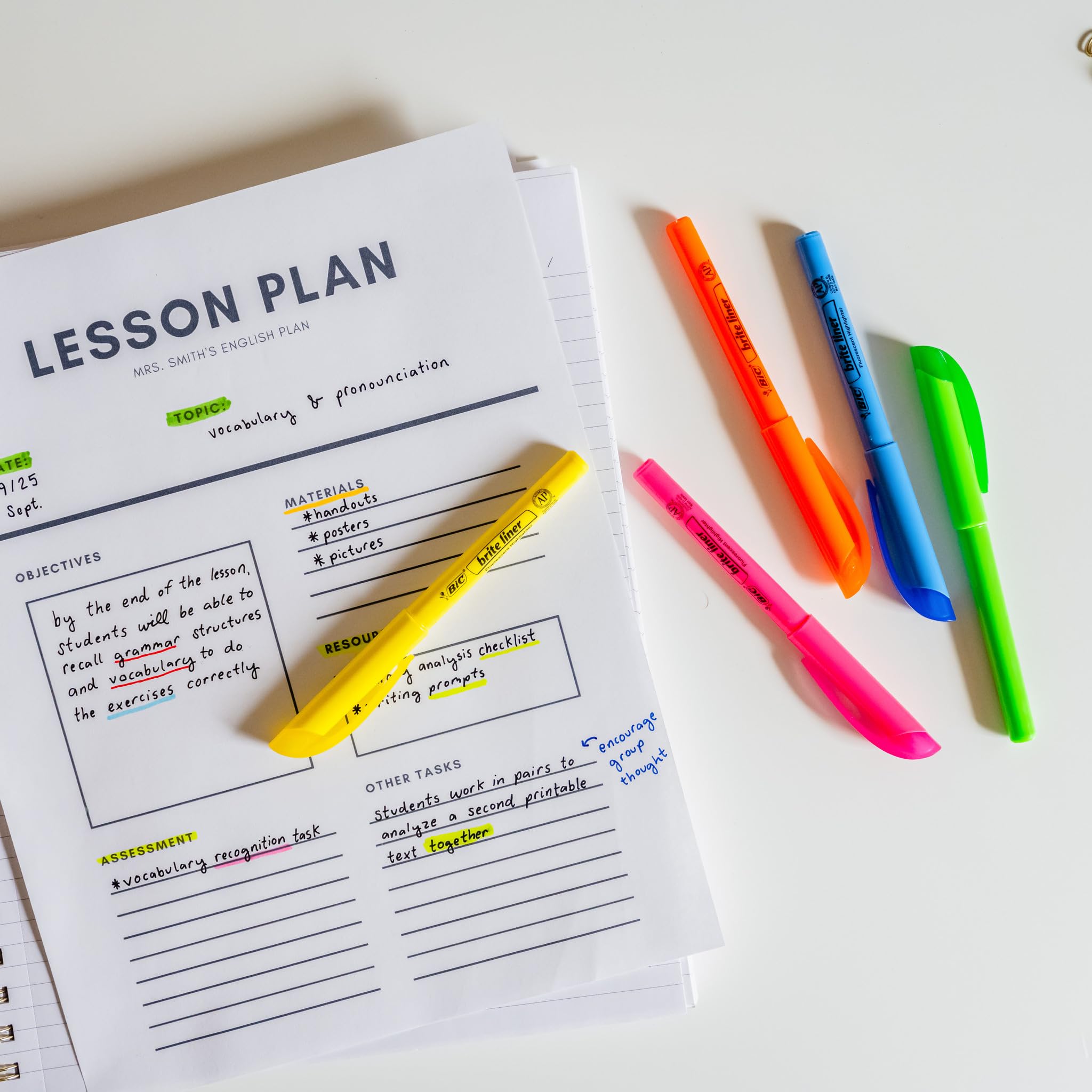 Make organization fun and easy with the BIC Brite Liner Green Highlighter Set. These highlighters have a chisel tip for broad highlighting or fine underlining, making them perfect for highlighting school or office documents. BIC's highlighter markers use translucent ink to emphasize what's important on the page without obscuring the text below. Reliable and long-lasting, each BIC Brite Liner highlighter writes for up to eight hours without a cap and does not dry out, so you can work with confidence. The convenient pen-shaped design lets you easily grip and comfortably use the highlighters chisel tip to organize your notes or underline passages in textbooks, notebooks and documents. Looking for classic highlighters for journals or green marker sets for adults? BIC Brite Liner Green Highlighters add a fun pop of color to your art, office or school supplies. Each pack contains 12 green chisel tip highlighter markers. BIC highlighters are ACMI-approved for a high-quality, safe product you can trust. Whether you're emphasizing text or just feel like getting creative, choose BIC Brite Liner Highlighters.