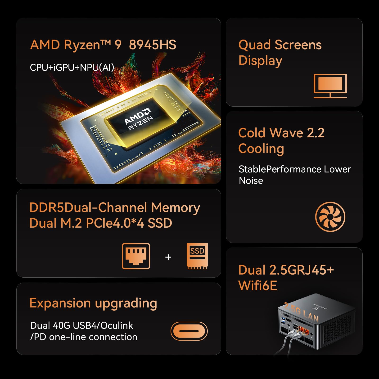 【Quad-Screen Display】UM890 Pro mini pc 8945HS is equipped with HDMI 2.1, DP 1.4 , and 2 x USB4, supporting maximum resolution of 8K at 60Hz/4K at 144Hz, providing a variety of video output options and with more flexible and efficient work space.