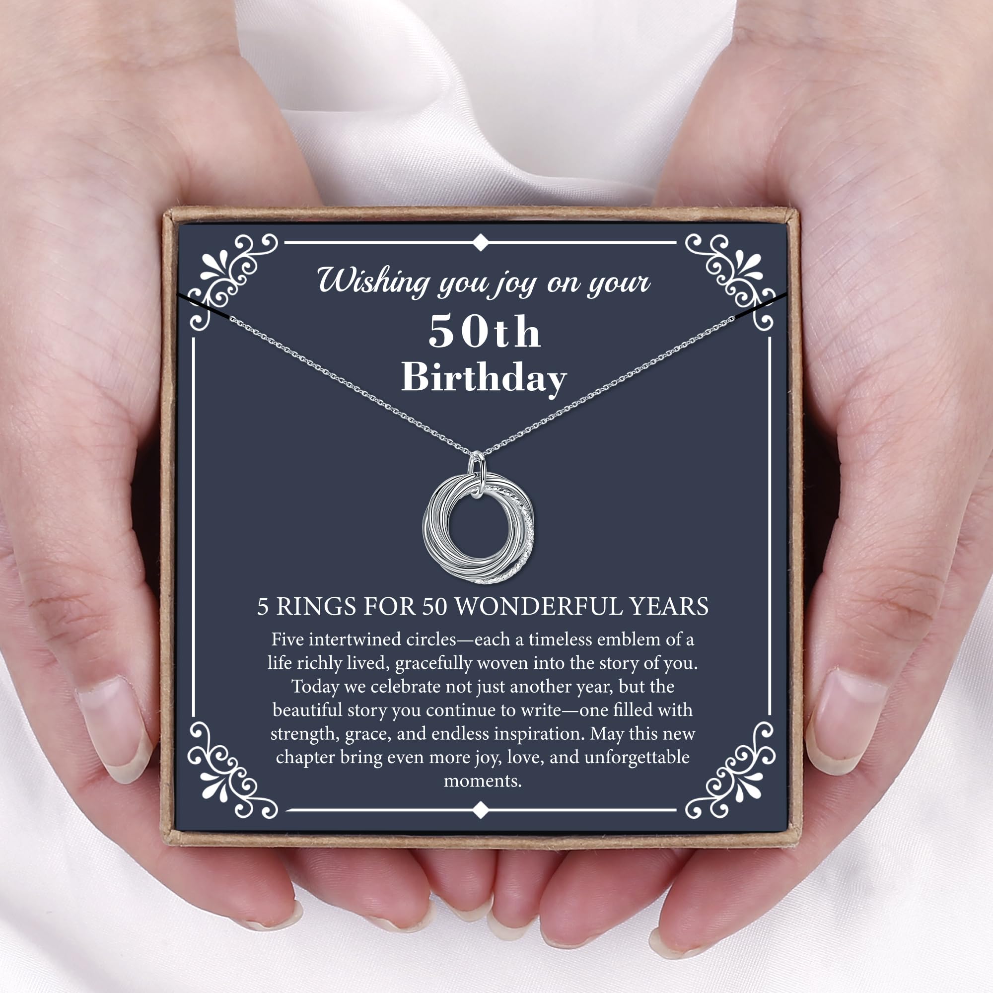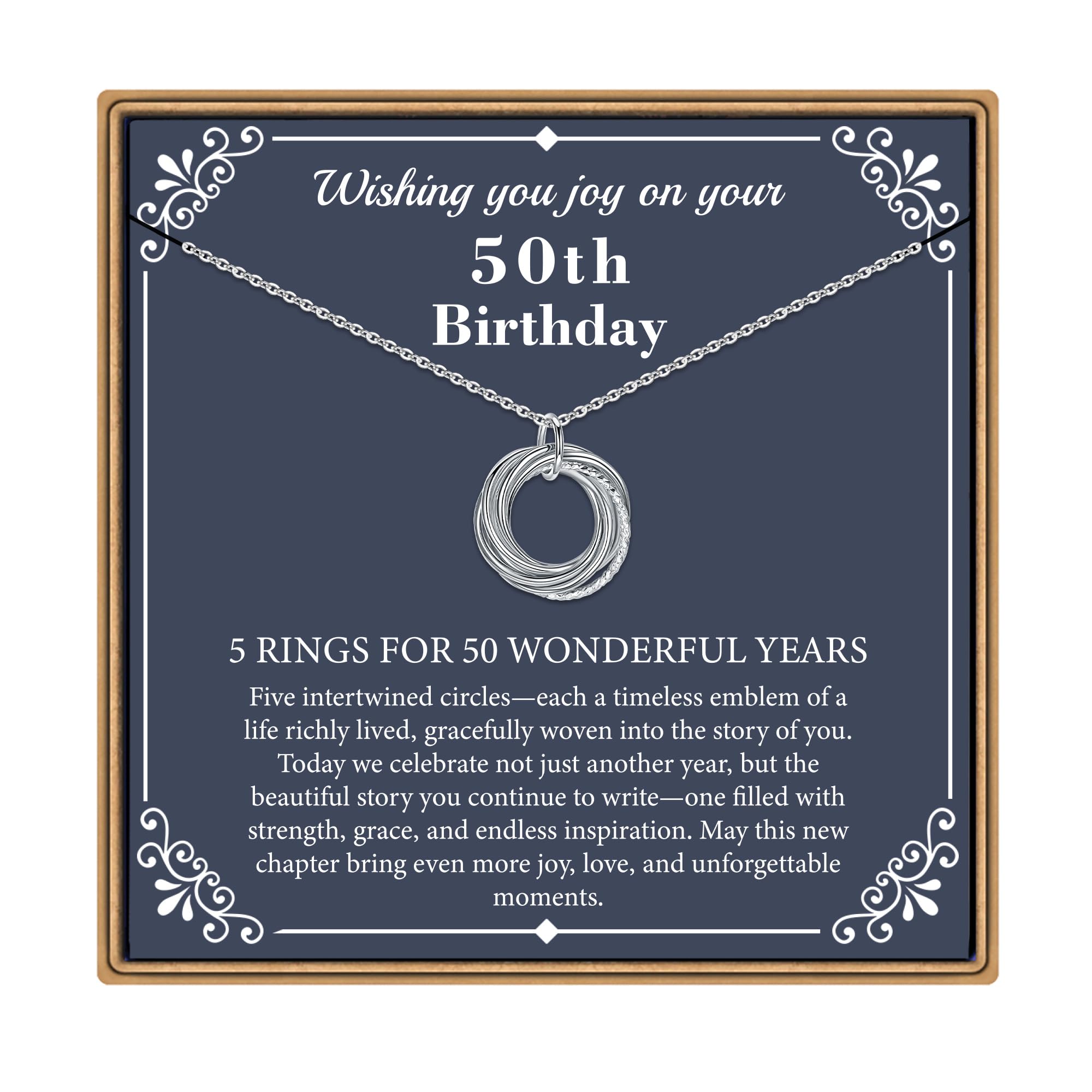 50TH BIRTHDAY GIFTS FOR WOMEN: Help her celebrate her milestone 50th birthday with the exquisite and memorable gifts. This 50th birthday necklace has five rings, each ring represents ten years, the rings are intertwined and hangs from a strong delicate chain. Circles symbolize infinite love, strength, protection and unity. 5 rings for 5 fabulous decades, 50th birthday gift idea for grandma, mom, sisters, friends and other person you love.