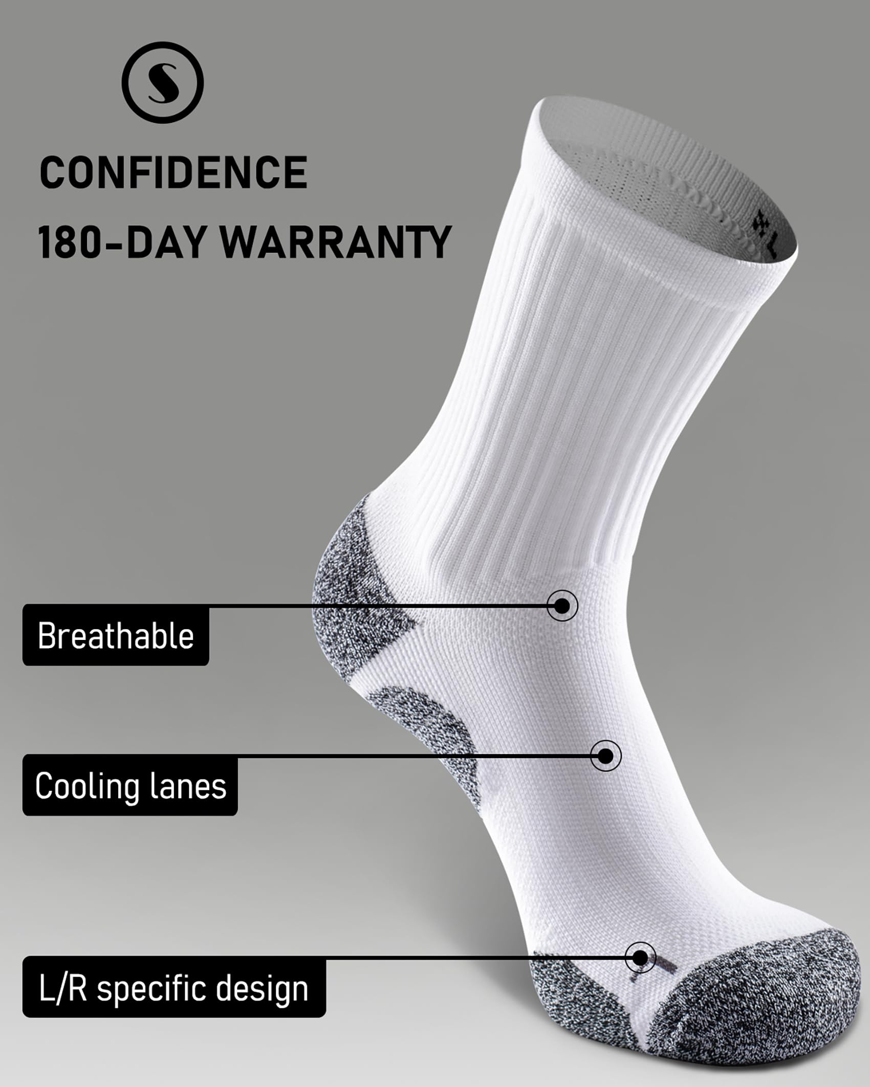 Ergonomic left and right foot design for a better fit; reinforced smooth toe seam structure to avoid hurting skin; breathable mesh to keep dry all day