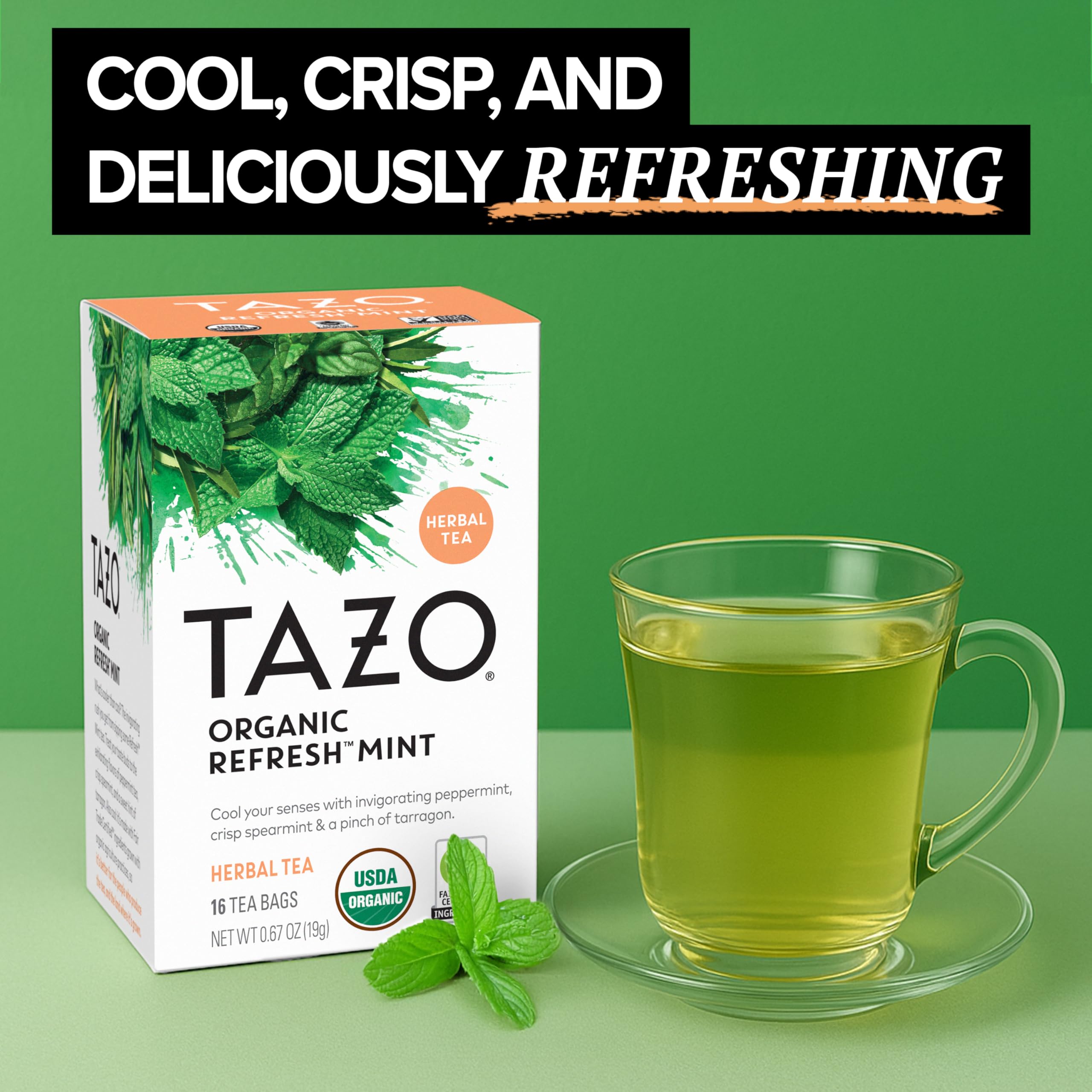 WHAT YOU'LL GET: TAZO Refresh Mint Herbal Tea, non-GMO and kosher certified, 16 tea bags per pack