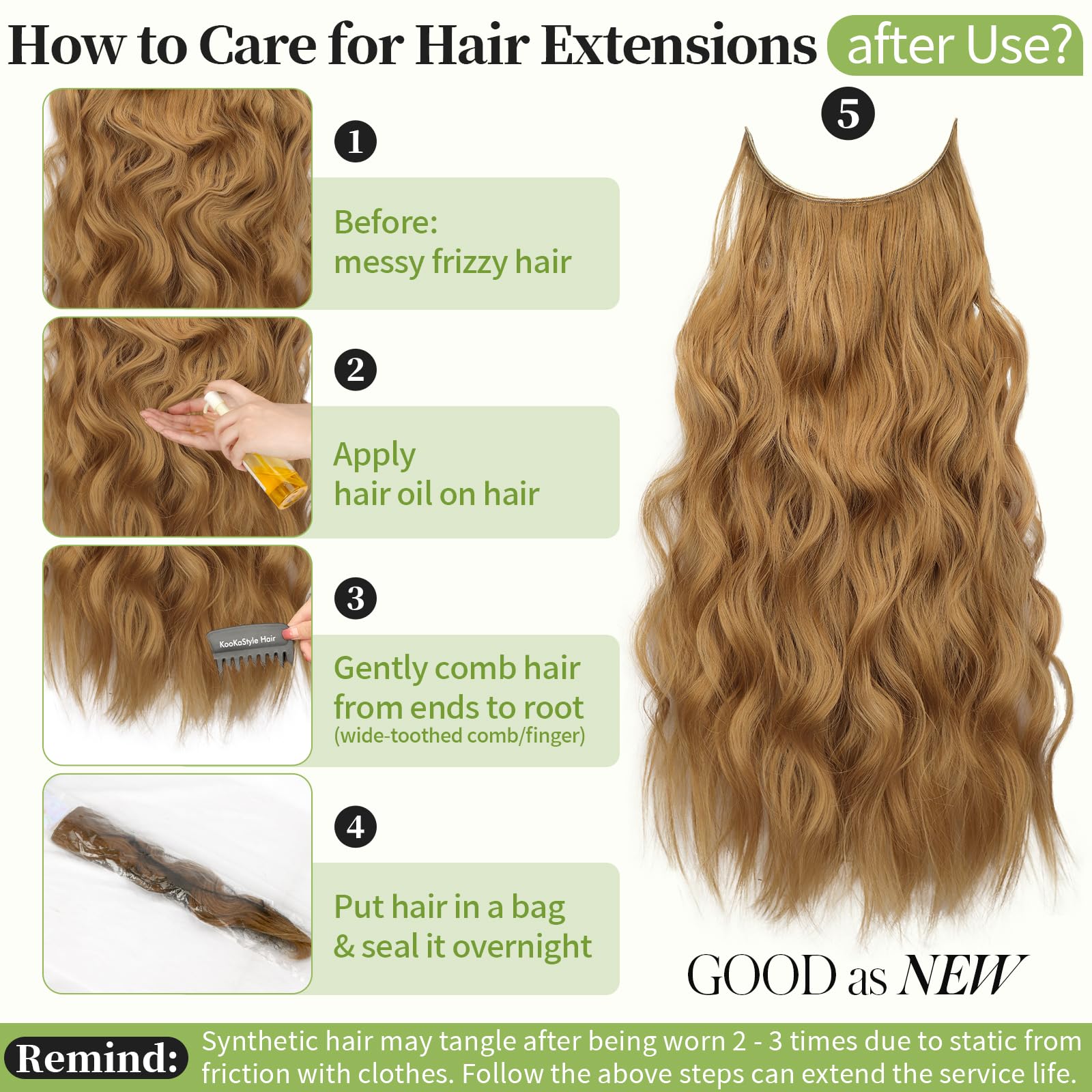 Care Tip: Unlike your own hair, hair extensions can tangle without nutrients. You can use detangle spray or get a spray bottle and put some conditioner in it and add water. If there is no conditioner, just spray some water, it will make the hair extensions not very dry and prevent tangling.
