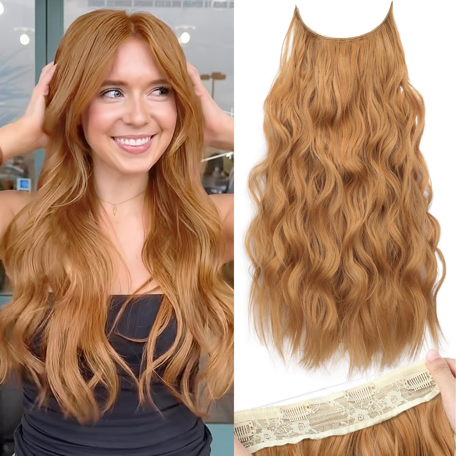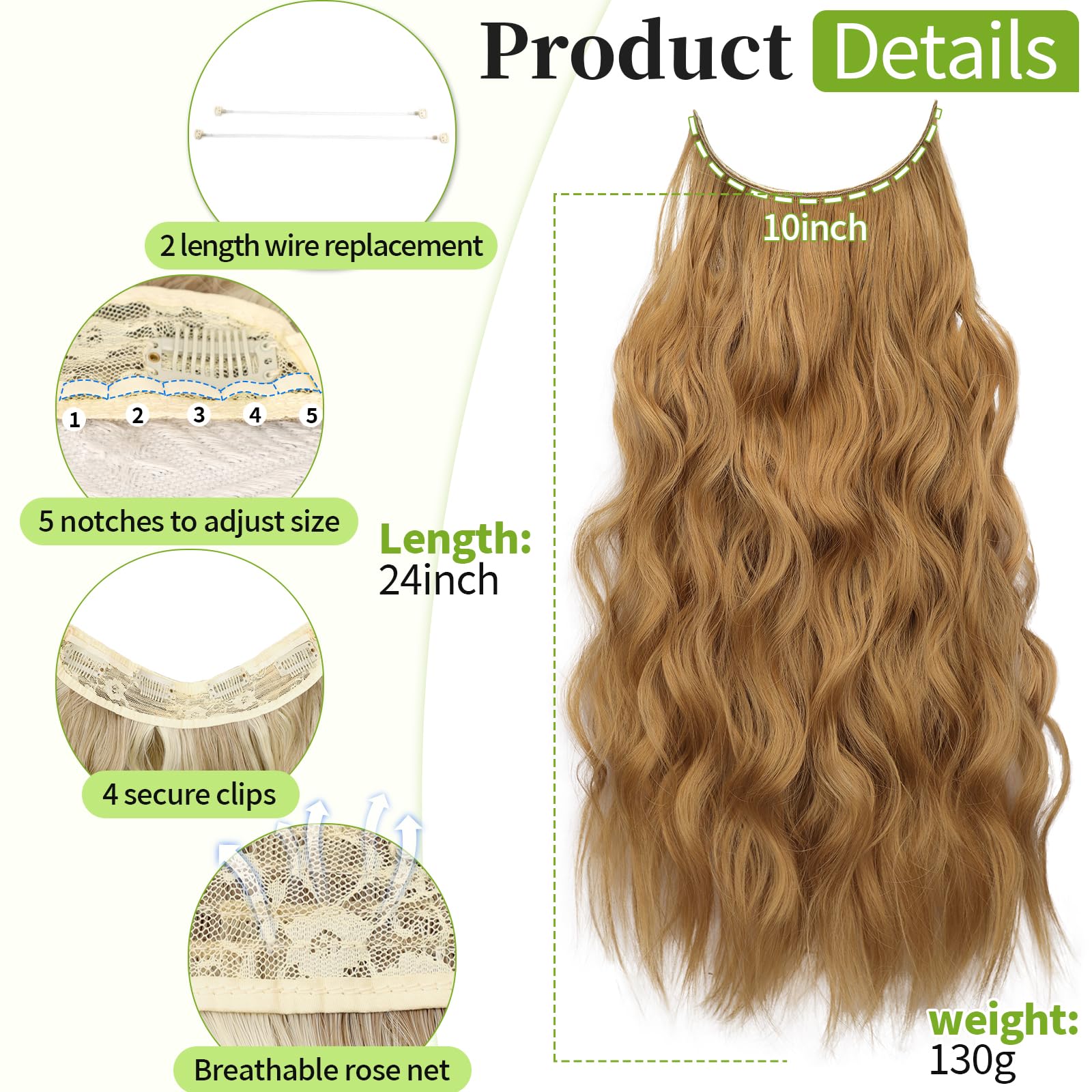 Specifications: Each package includes a hair piece containing 4 clips; 2 different lengths of fishing wire for replacement; You can adjust the suitable size according to your head circumference by putting the hook into the corresponding wire notches. The upgraded wire is thicker and more flexible, not easy to break and will not cause any stress to the scalp.