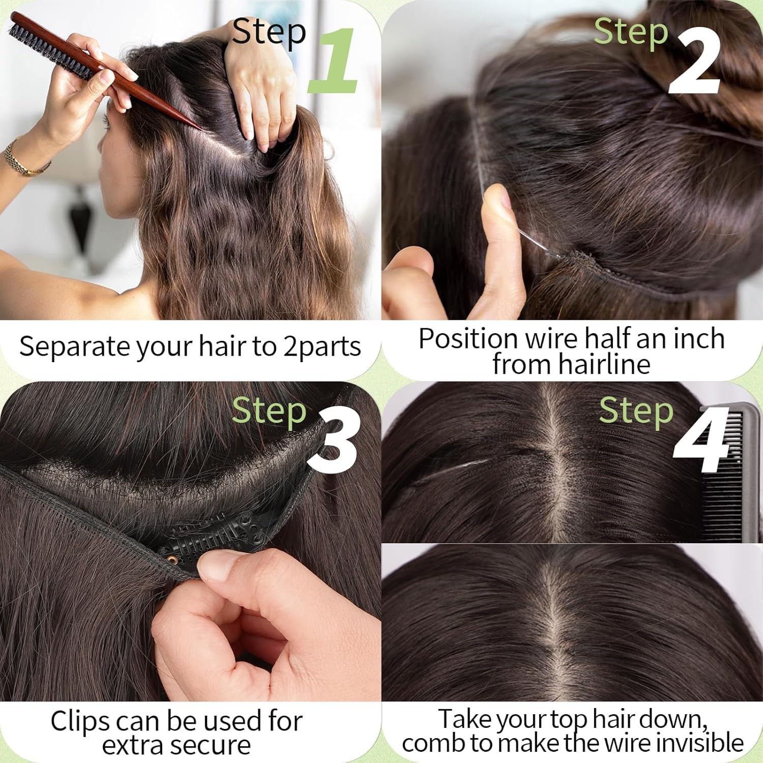 Different ways of wearing: 1. Position the wire hair extensions on your head like a hairdband, secure them with 4 clips, and hide the wires with your own hair.2. Only use invisible wires, suitable for easy hair loss and sensitive to bobby pins customers. 3. Only use 4 hair clips, suitable for customers with soft and sparse hair on the top of the head.It can meet various wearing situations.