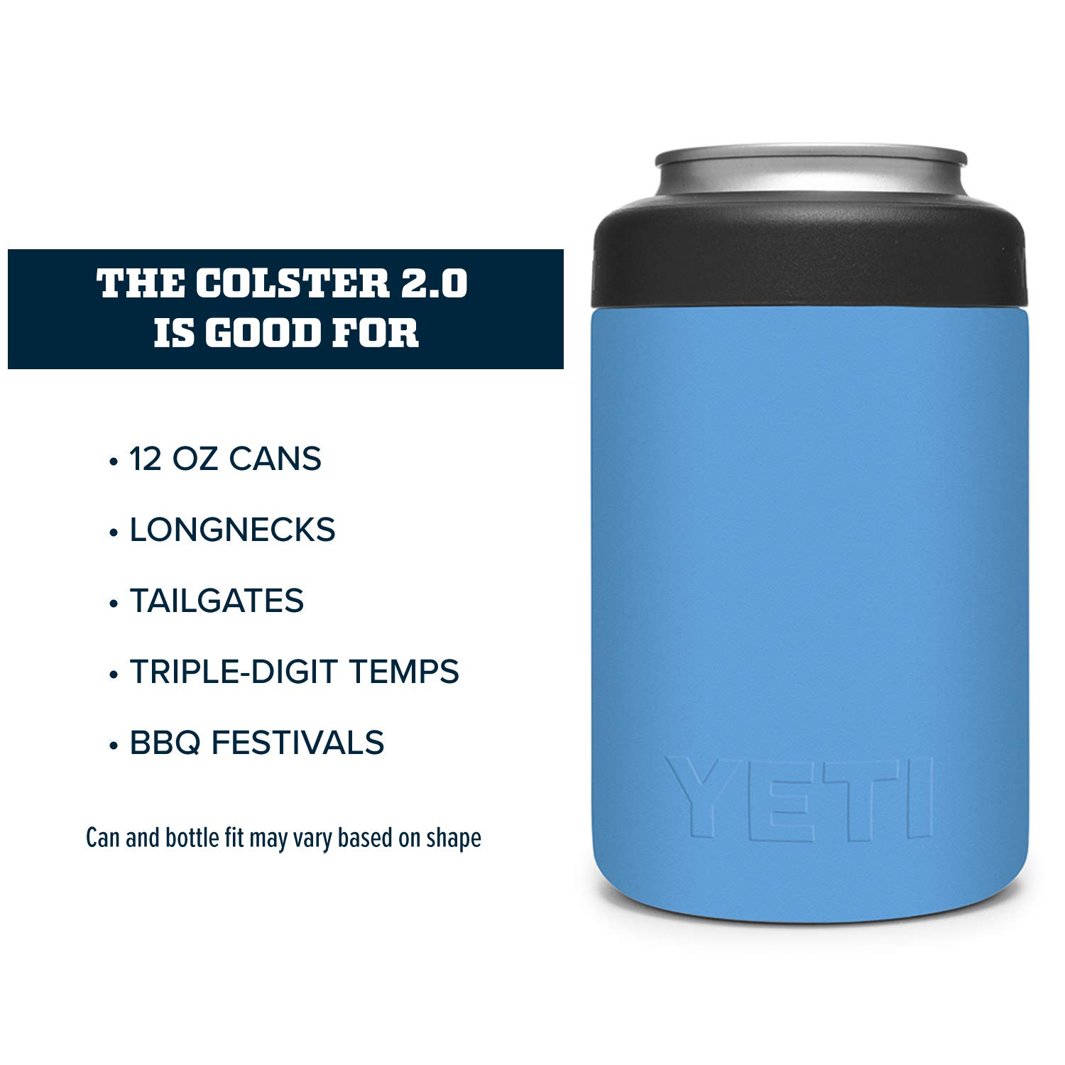 The YETI Standard Colster 2.0 is good for: Standard 12 oz. Cans, Longnecks, Tailgates, Triple-digit temps and BBQ festivals. Can and bottle fit may vary based on shape