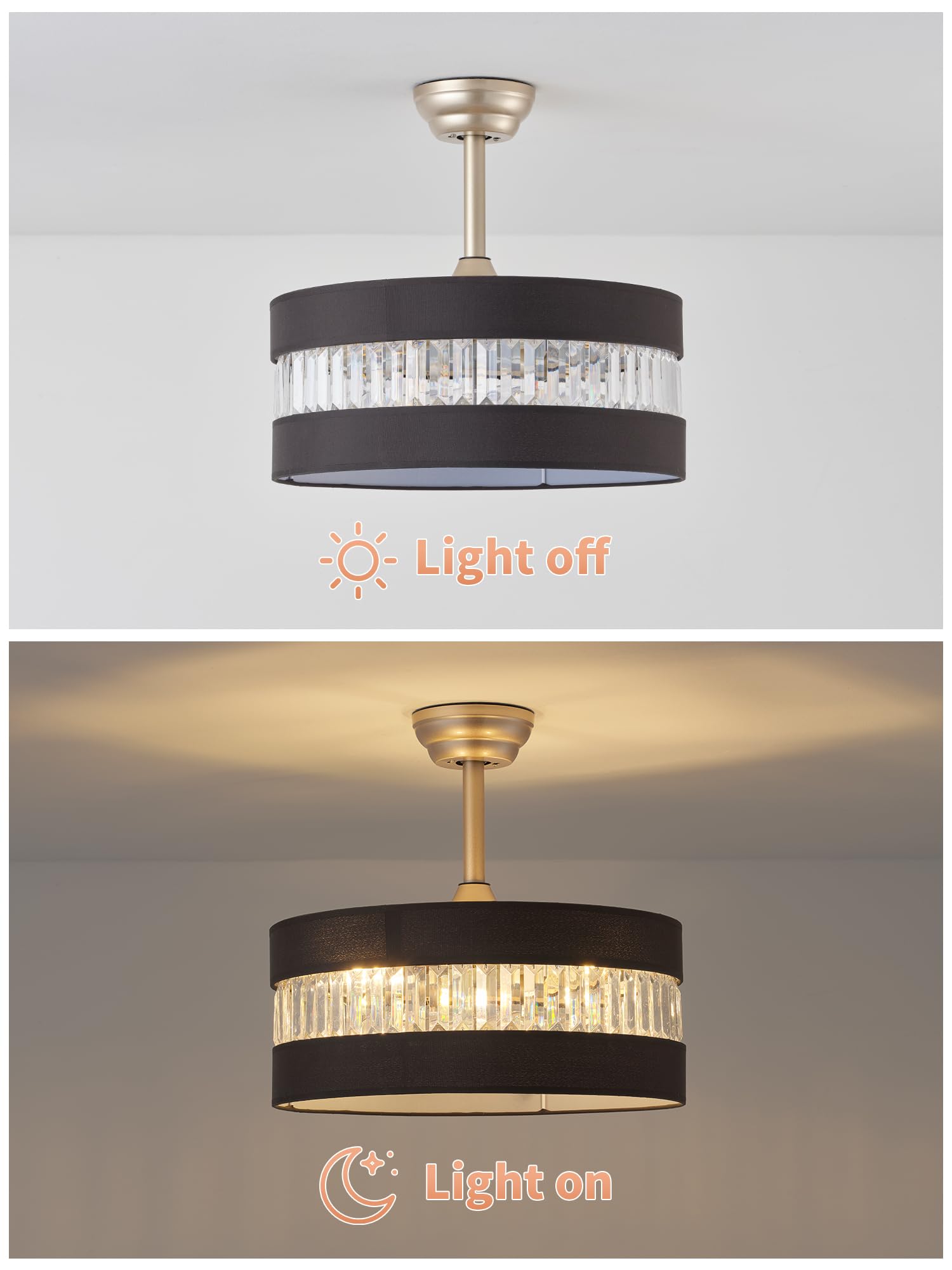 like Dream Light: Make every night full of magic! Our black and gold crystal ceiling fan with light is equipped to create soft light and shadows like flowers, and you can adjust the brightness as you like. Compatible with LED, CFL or incandescent bulbs (up to 60W), it can create an irresistible and beautiful atmosphere, whether it is a cozy reading or a dreamy party, just like the gentle swaying of candlelight in the garden.