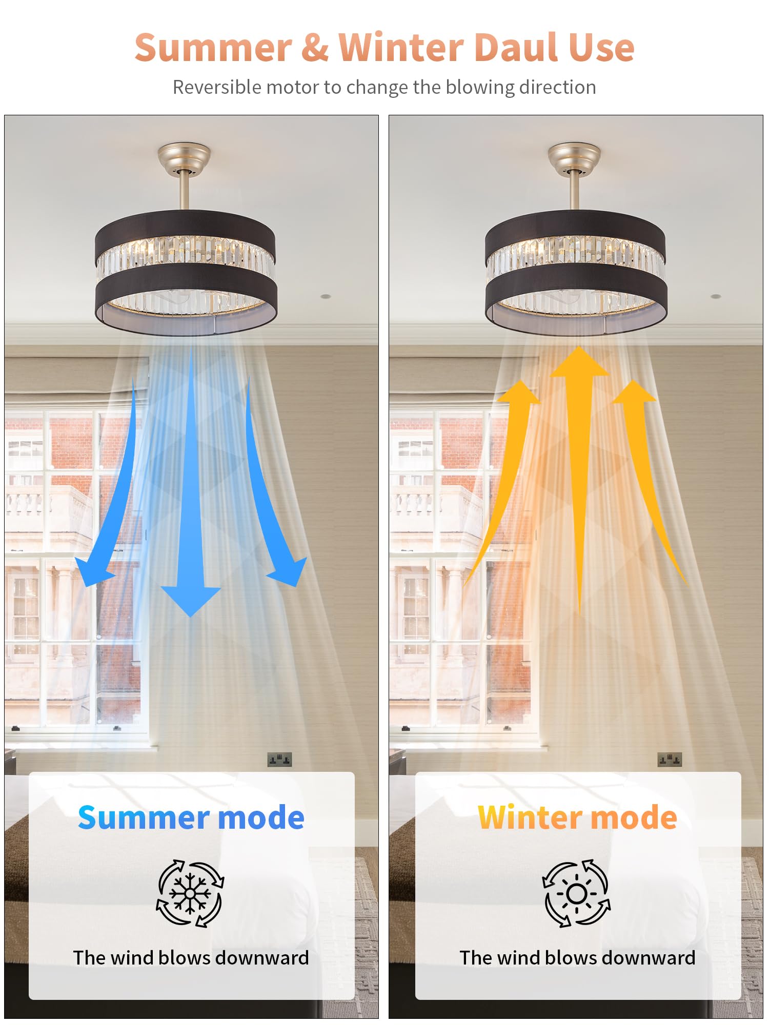 Personalized Experience: Our black and gold Crystal Ceiling Fan with Light is the perfect companion for your home. By adjusting the fan speed (1-6 levels) independently, you can create the ideal atmosphere at any time. The reversible motor ensures that you stay cool in the summer and comfortable in the winter. Whether it is an elegant dinner party or a cozy personal time, the black and gold Crystal Ceiling Fan with Light ensures that you can enjoy tranquility and make every relaxation as peaceful as in the garden.