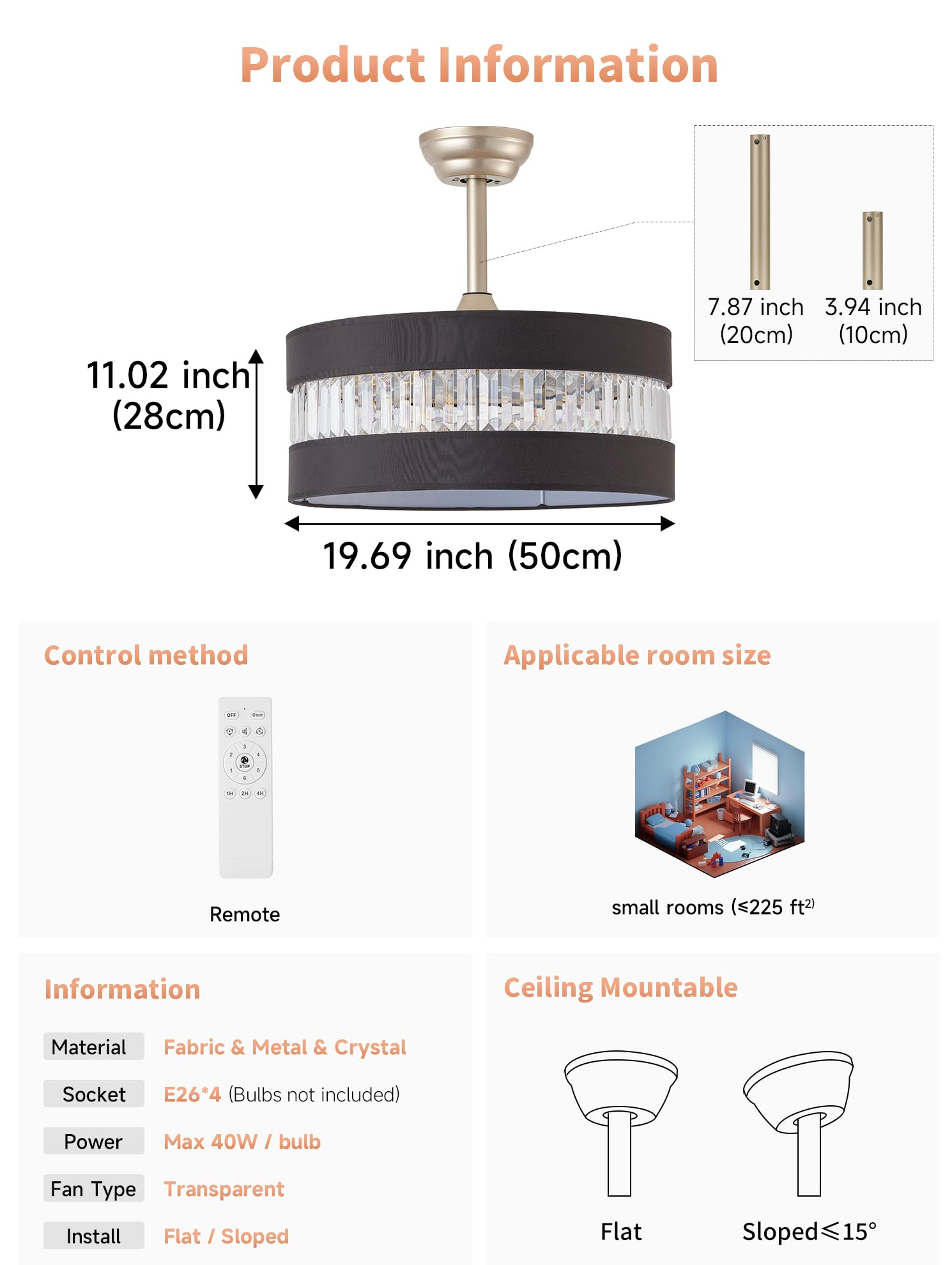 Easy and worry-free installation: We know that complicated installation is not what you want. Our black and gold crystal ceiling fan with light is pre-assembled. This crystal ceiling fans with lights comes with two adjustable height poles (7.87 inches + 3.94 inches) suitable for installation on any type of ceiling, making it easy to decorate your home. Choose your favorite place and easily add style and elegance to create your own garden-like home atmosphere.