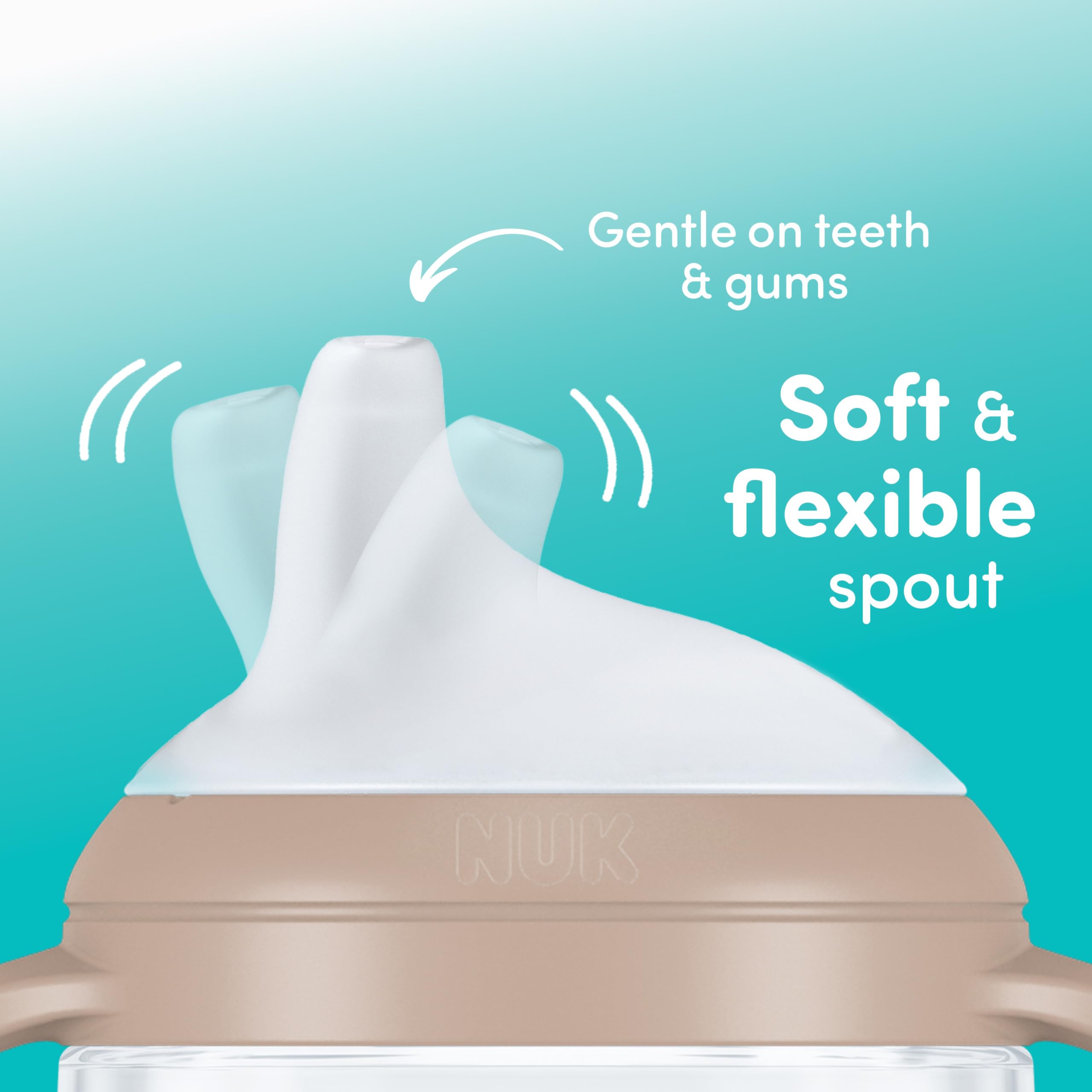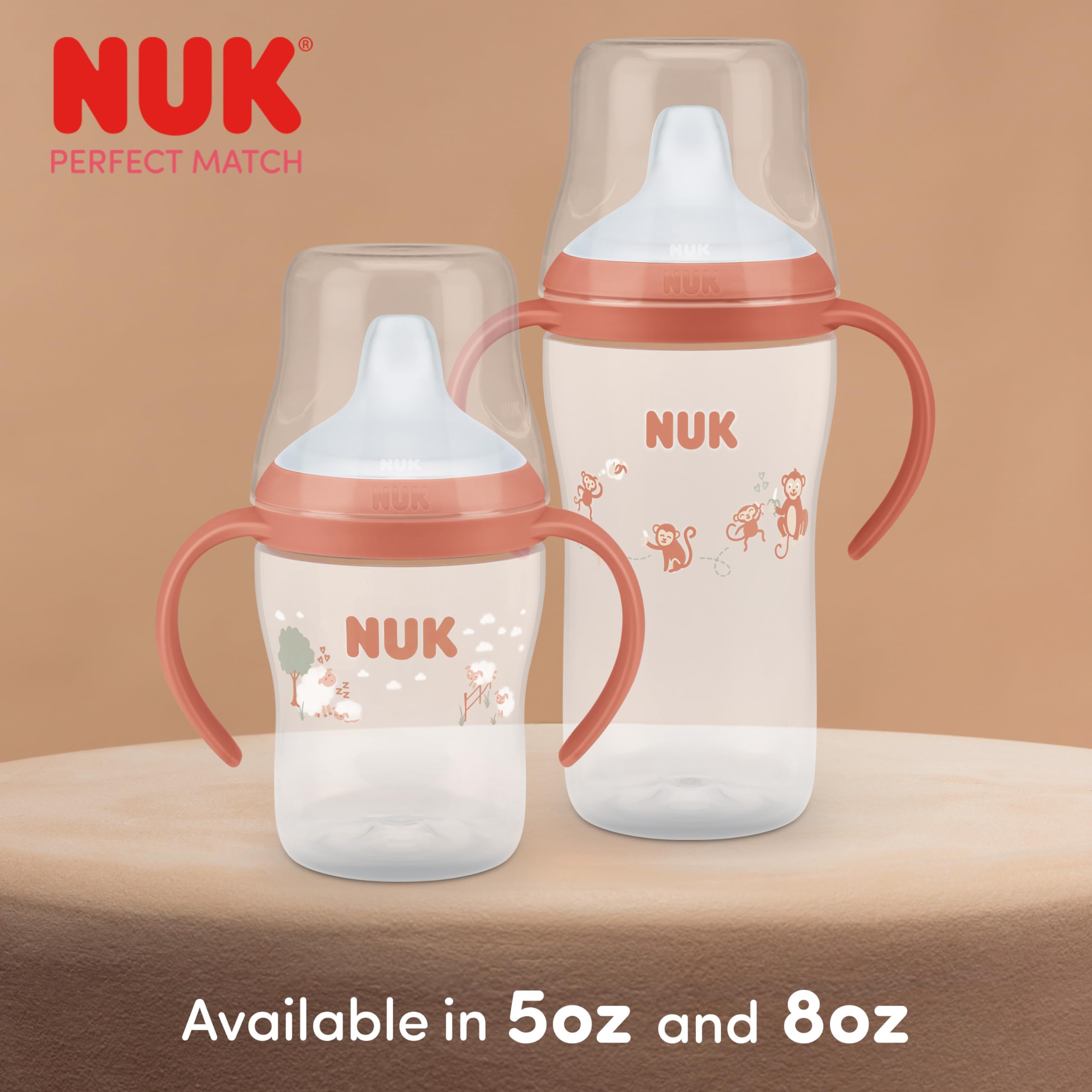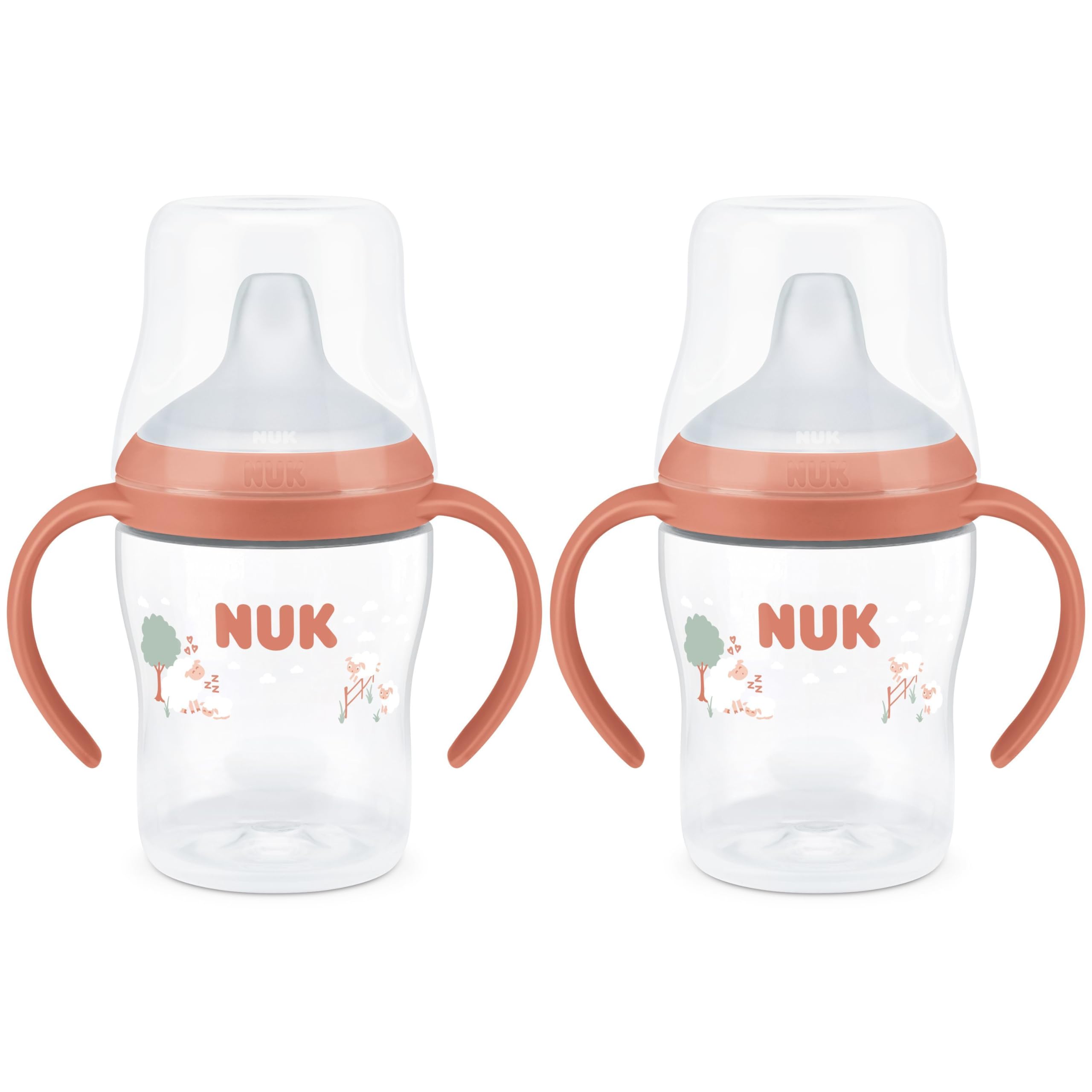 The NUK Perfect Match Learner Cup easily promotes the most natural transition from bottle to cup with a flexible spout and wide base. This learner cup features a super-soft, skin-like silicone spout that is 2X Softer* than leading bottle brands. It is designed to be 100% spill-proof and leak-proof, keeping you happy and mess-free. The cup also comes with easy-to-grip, removable handles that your growing child will love. NUK Learner Cups are BPA-free and dishwasher-safe. Our 5 oz. learner cups are recommended for ages 6 months and older. *vs. leading bottle brands average nipple softness