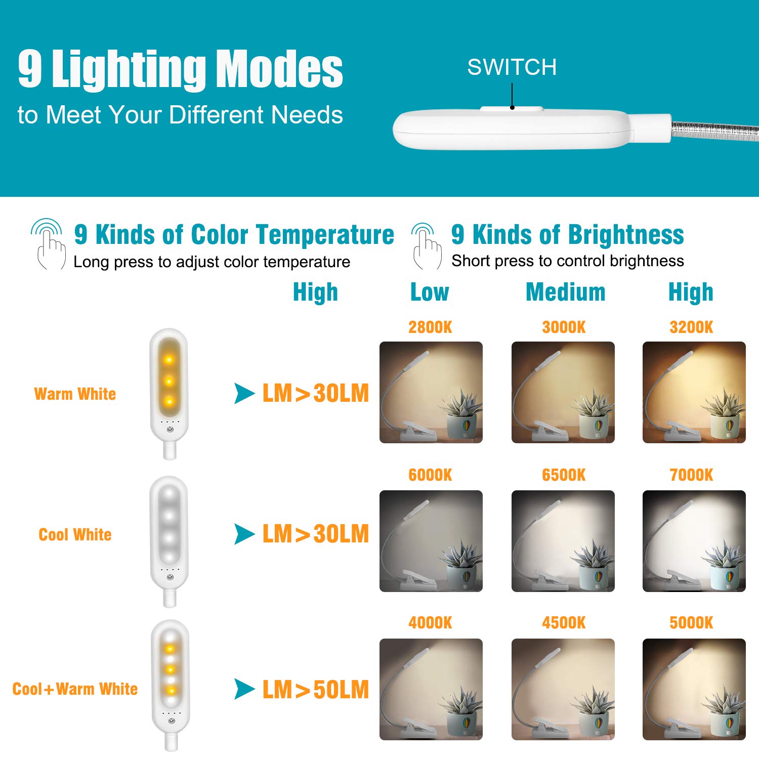 【7 Led & 9 Color Temperature】Kids love the cute book light which can increase their reading enthusiasm. Parents love the book lights when working, reading or accompany their kids. The book light is equipped with 7 upgraded smd leds which life span is more than 50,000 hours to diver more uniform luminance than normal leds. 9 different color temperature modes: warm white(2800k/3000k/3200k), warm cool white(4000k/4500k/5000k) and cool white(6000k/6500k/7000k)
