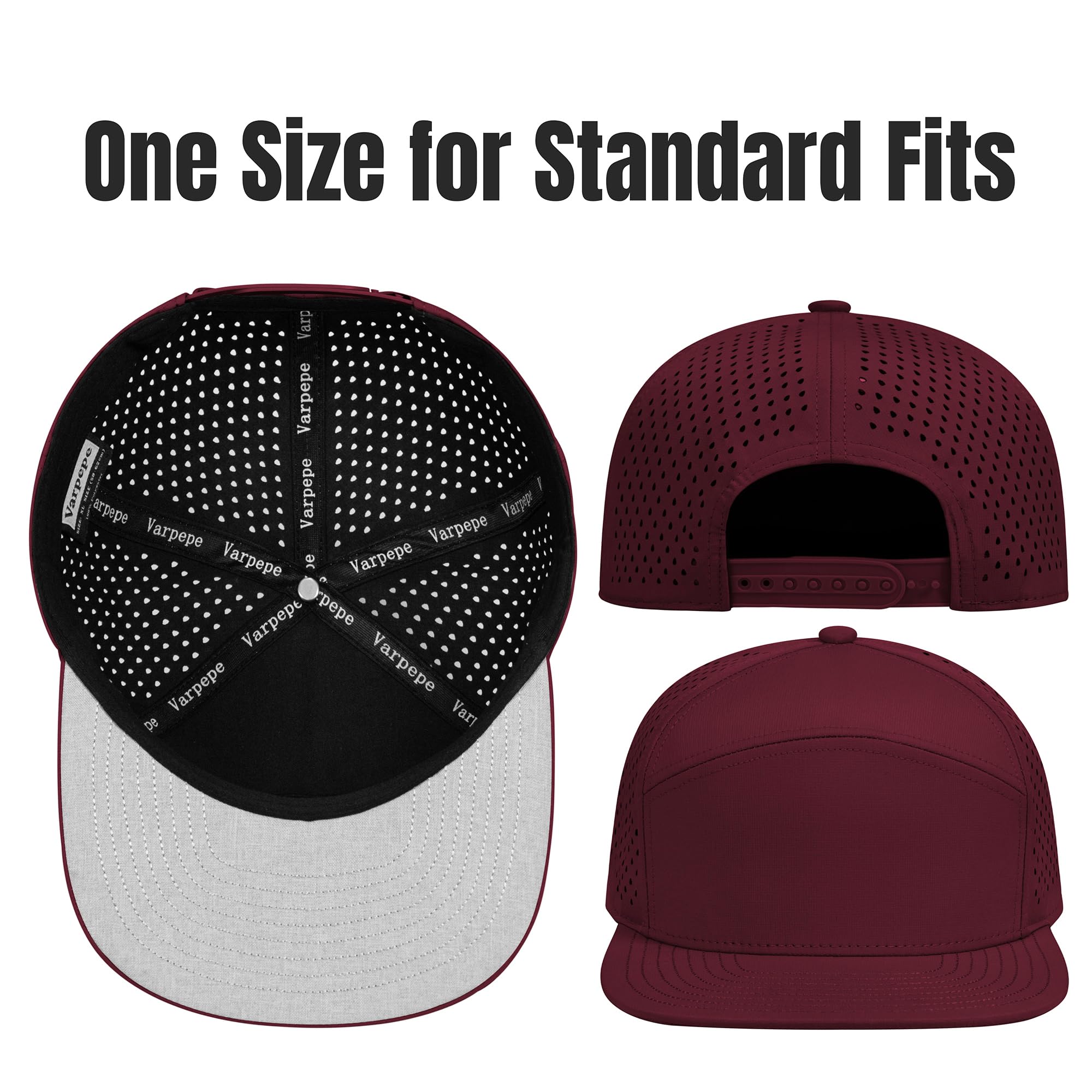 Varpepe Hat Design: Stylish and functional,structured front panels that maintains shape, 6-panel, flat brim, laser-perforated side & rear panels for breathability, and soft touch adjustable snapback closure