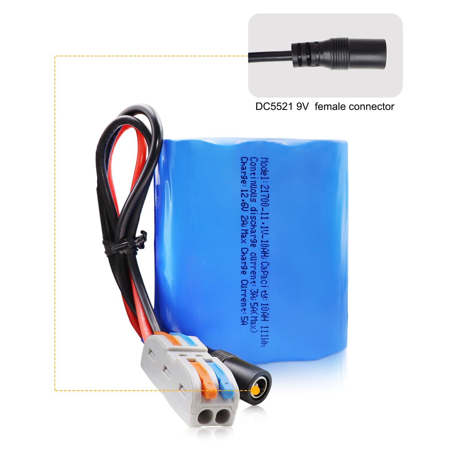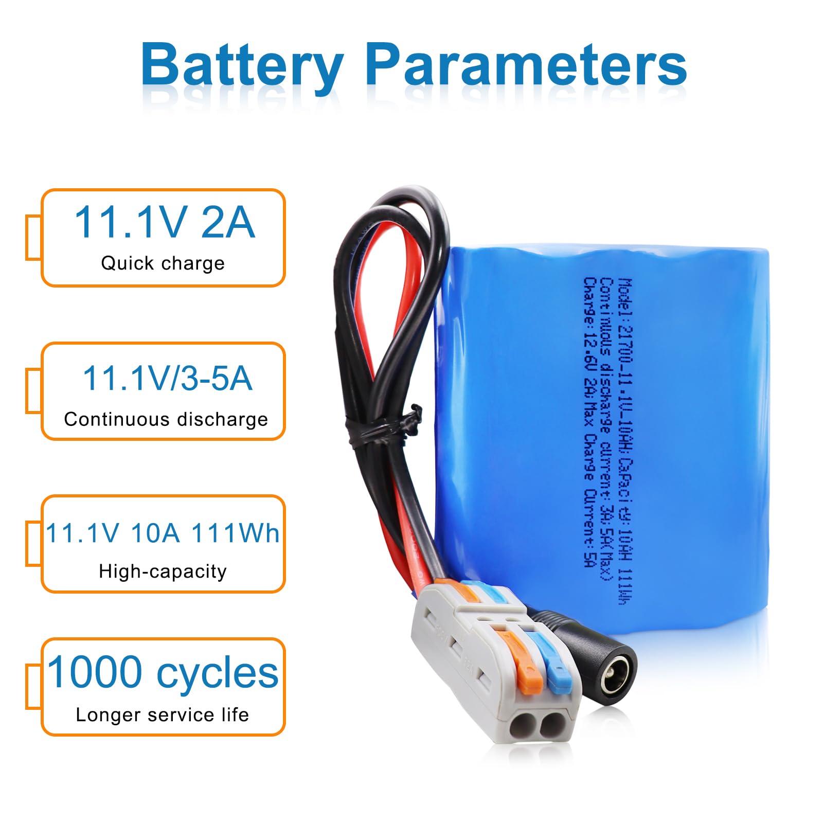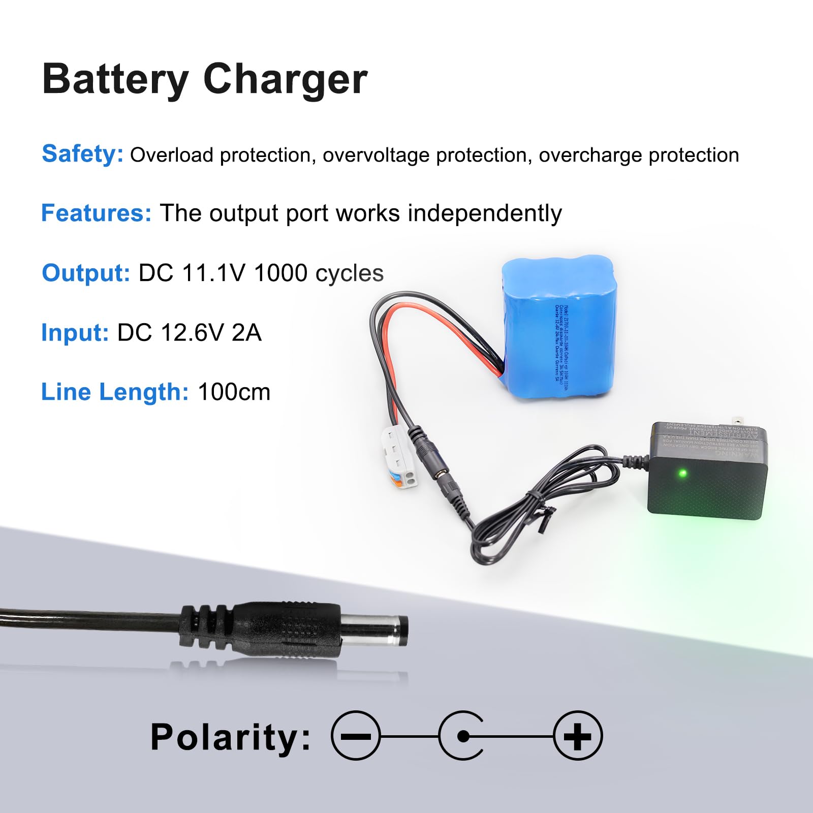 Long using life: this 12V battery pack build with lithium-ion battery, no memory effect, is of over 800 times charge-discharge cycles.